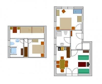 OG: Schlafzimmer mit Ehebett (1,40 m ), Schlafzimmer mit 2 Einzelbetten, Dusche/WC