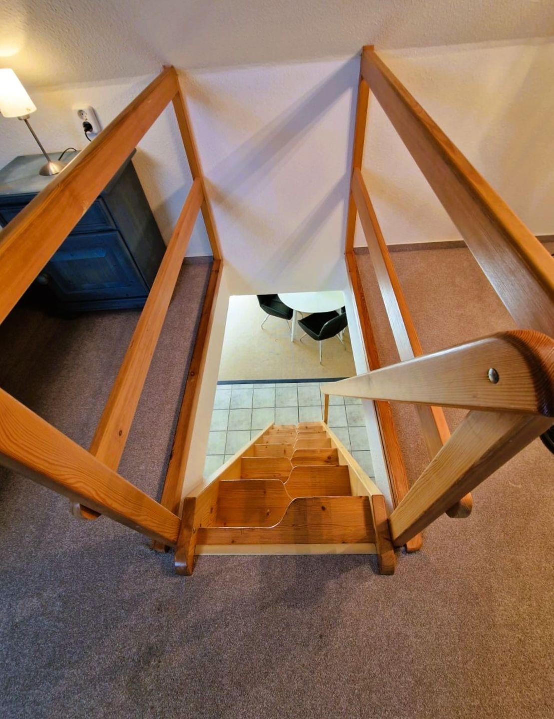 gemütliche Ferienwohnung in einem Appartementhaus, ca.70 m², OG, Balkon, zum Strand sind es ca.200m, Wohnzimmer mit komplett ausgestatteter Küchenzeile (Kühlschrank ist ohne Gefrierfach), SAT-TV, Schlafzimmer, Dusche/WC, Fön, Obergeschoß: offenes Schlafzimmer, steile Spartreppe ins OG