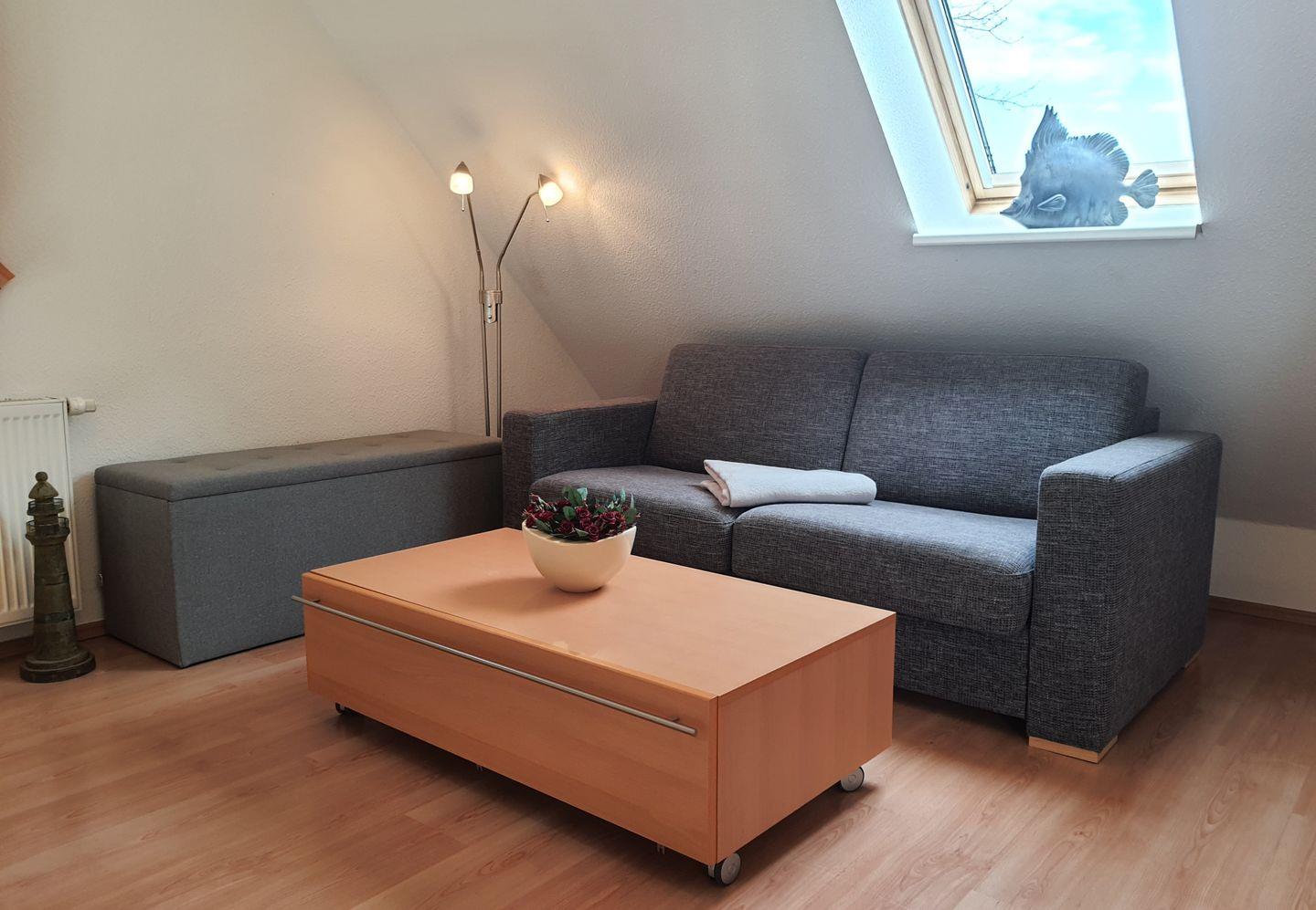 Moderne komfortable Maisonettenwohnung in einem Appartementhaus, ca.68 m² im 1.Stock, ca.600 m zum Strand, 1 PKW-Stellplatz Nr.5, Balkon, zentrale Lage, komplette Küchenzeile mit Esstisch und TV, Schlafzimmer mit Doppelbett und TV, Dusche/WC, offenes Wohnzimmer mit Schlafcouch und TV im Obergeschoss, Kindersicherung an der Treppe