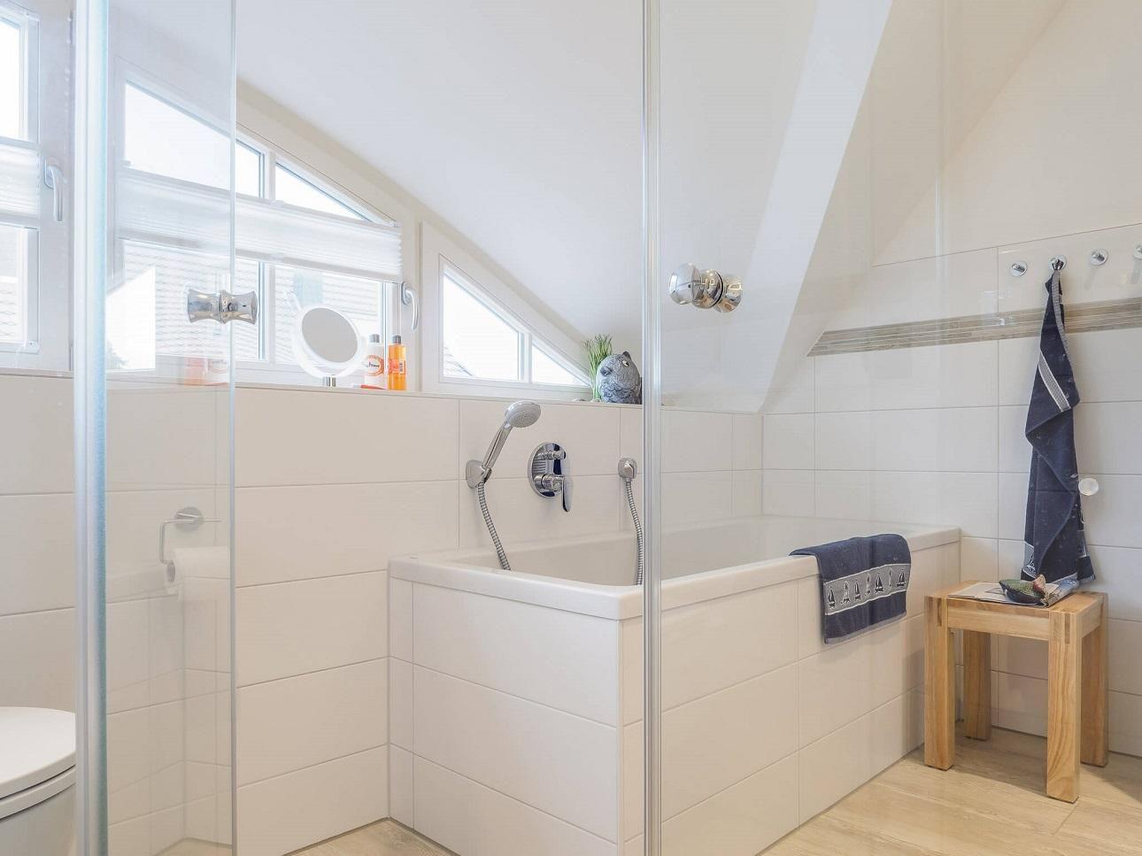 Im Obergeschoss befinden sich ein großes Schlafzimmer mit einem Doppelbett (180 x 200 cm), zwei Nachttischen, ein Kleiderschrank, eine Kommode sowie ein Flachbildfernseher, das Gaubenzimmer mit einem Doppelbett (160 x 200 cm), zwei Nachttischen, einem Kleiderschrank, eine Kommode sowie einem Flachbildfernseher, das „Kinderzimmer“ mit zwei Einzelbetten (100 x 200 cm), Nachtkommode und zwei Kommodenschränken und ein großes Bad mit Badewanne, Dusche, Handtuchtrockner und Fön.