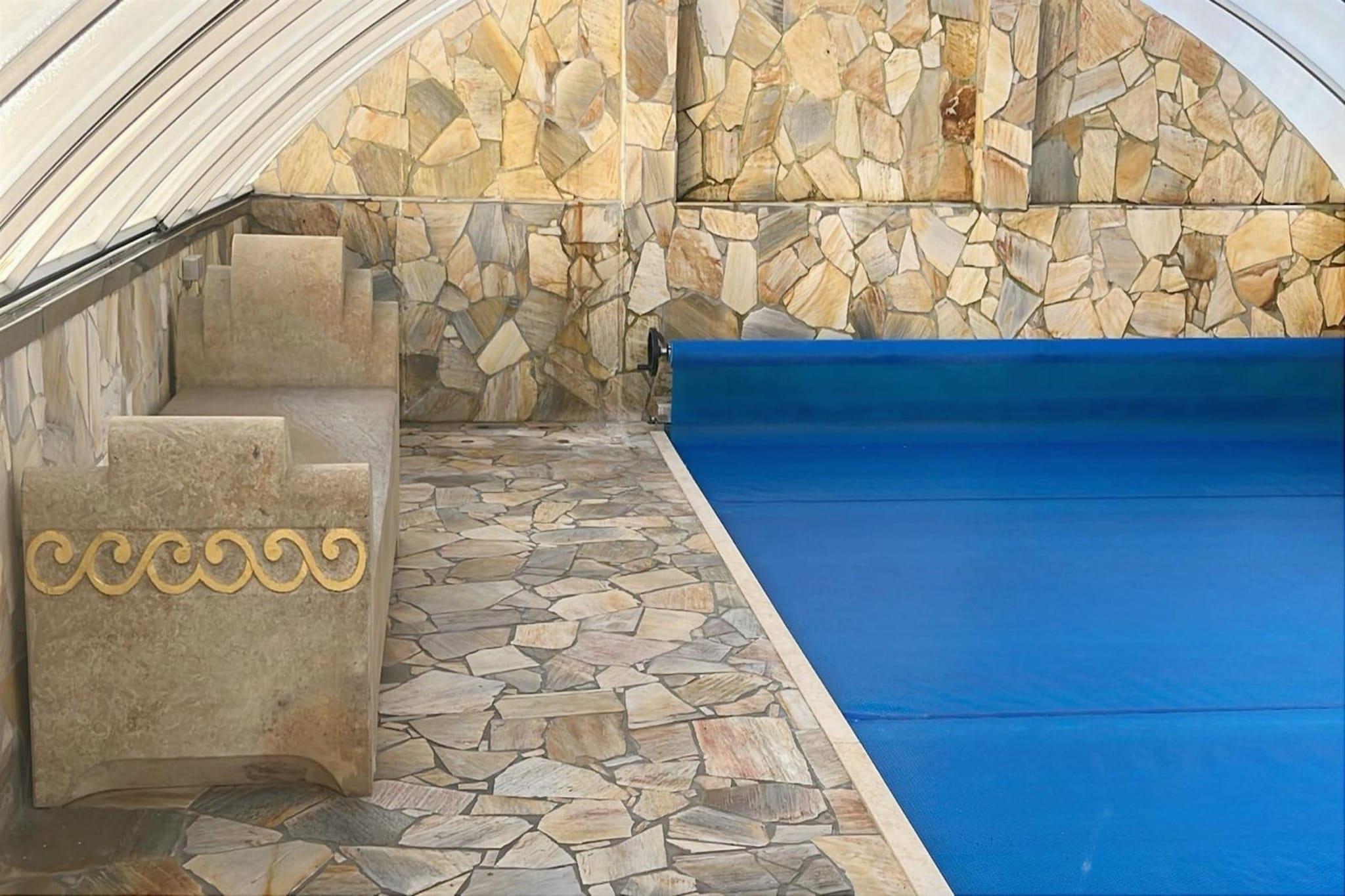 Living room(double sofa bed, TV, dining table, fireplace), Kitchen(stove, electric kettle, toaster, oven, microwave, dishwasher, fridge-freezer), bedroom(double bed, double sofa bed), bedroom(double bed), bathroom(shower), bathroom(bath tub), Garden Furniture , tumble dryer, washing machine, balcony, garden, parking, swimming pool(private), dishes and cutlery