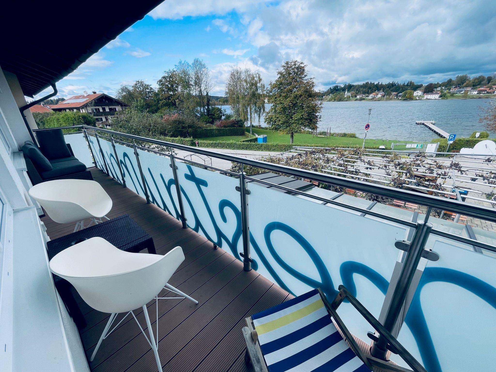• Balkon: Seeblick mit gemütlicher Sitzecke und Liegestühlen.