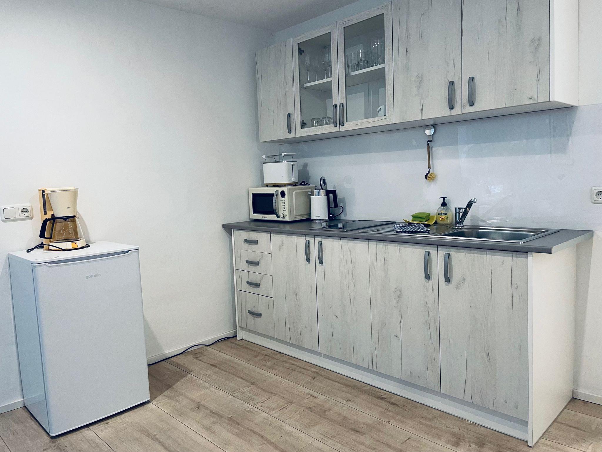 • Kochen: voll ausgestattete Küche mit Toaster, zwei Induktionsplatten, Wasserkocher, Kaffeemaschine und Mikrowelle.