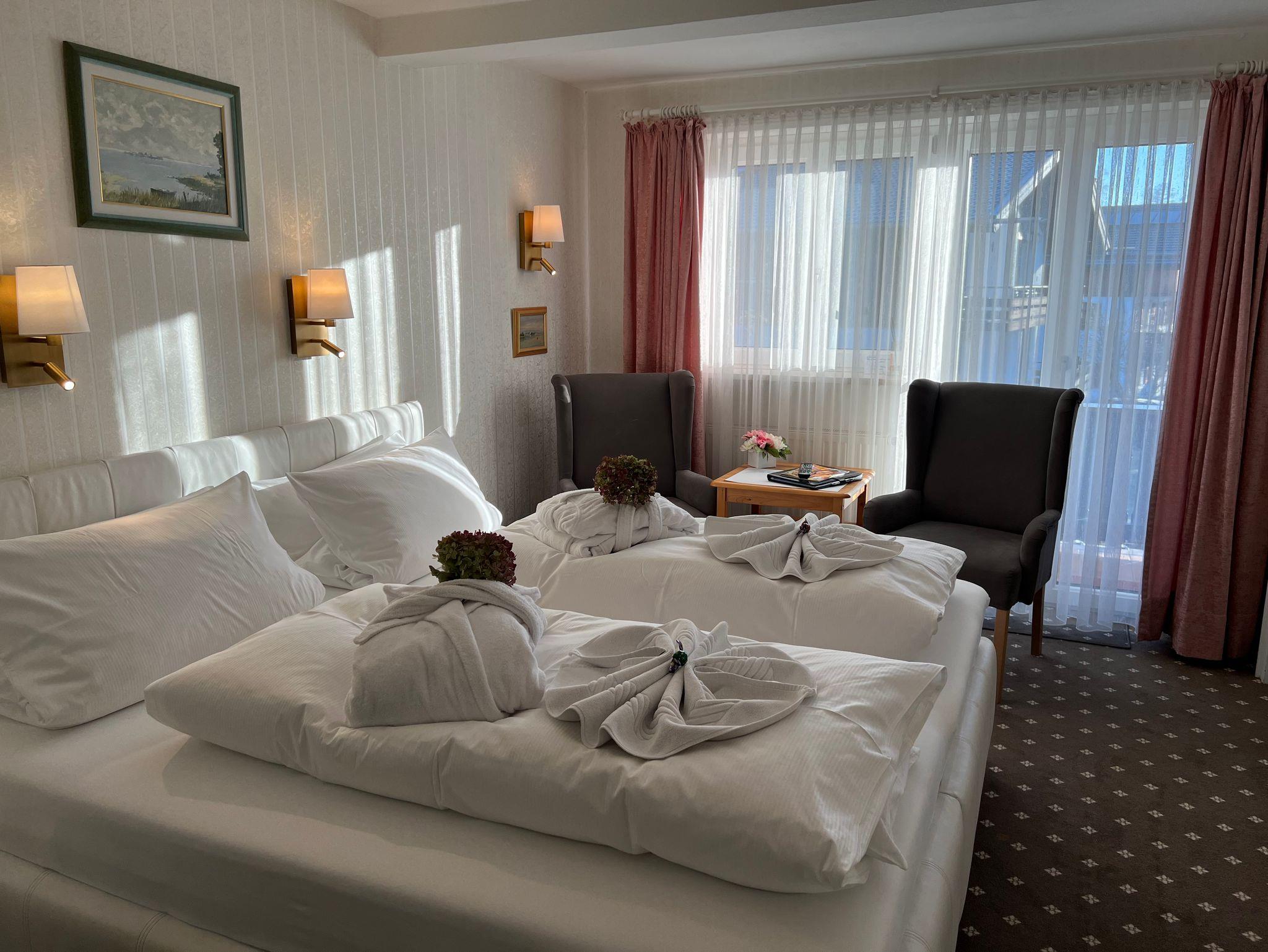 Gemütlich eingerichtetes Doppelzimmer mit Dusche/WC, Minibar, Sitzgelegenheit, TV, Radio und Balkon zur Ostseite - WLAN