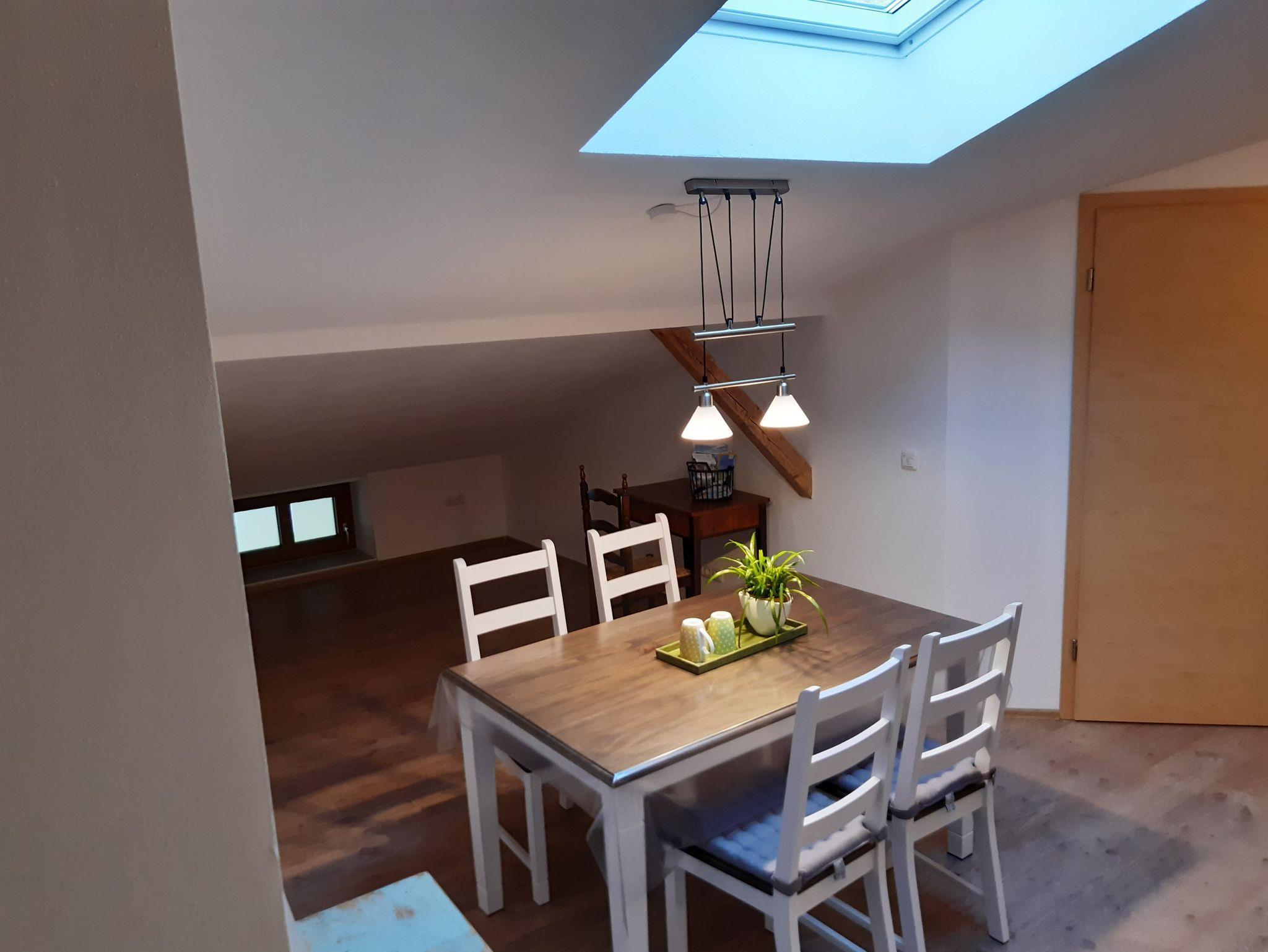 Die neue, 2019 fertiggestellte Ferienwohnung befindet sich im Dachgeschoß eines 2017 komplett nach neuesten Standards renovierten ca. 150 Jahre alten Bauernhauses. Über einen separaten Zugang durch das zentrale Treppenhaus gelangt man direkt in den Vorraum des großzügigen Wohn-/Ess-/Kochbereichs mit vollständig eingerichteter Küche, Sitzecke mit TV, die im Bedarfsfall in eine Schlafcouch umgewandelt werden kann, zusätzlich zum separaten Schlafzimmer mit Doppelbett. Das komfortable Bad mit Dusche schließt direkt an den Eingangsbereich an. An vielen Stellen ist es gelungen, die moderne Renovierung mit dem ursprünglichen Bestand des alten Gebäudes elegant zu kombinieren.Vom zugehörigen Balkon hat man einen herrlichen Blick auf den Chiemsee, die Alpenkette und die wundervolle Natur, die bis an unseren Hof heranreicht.