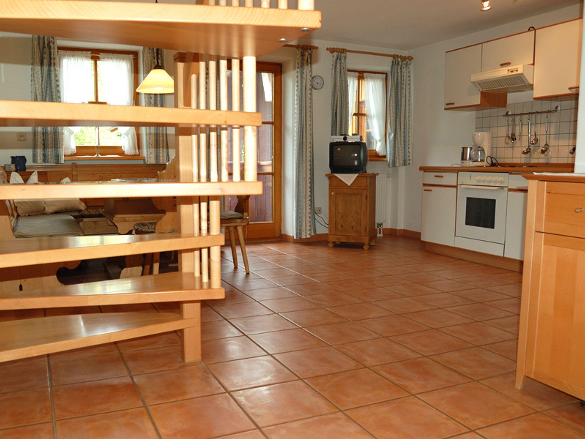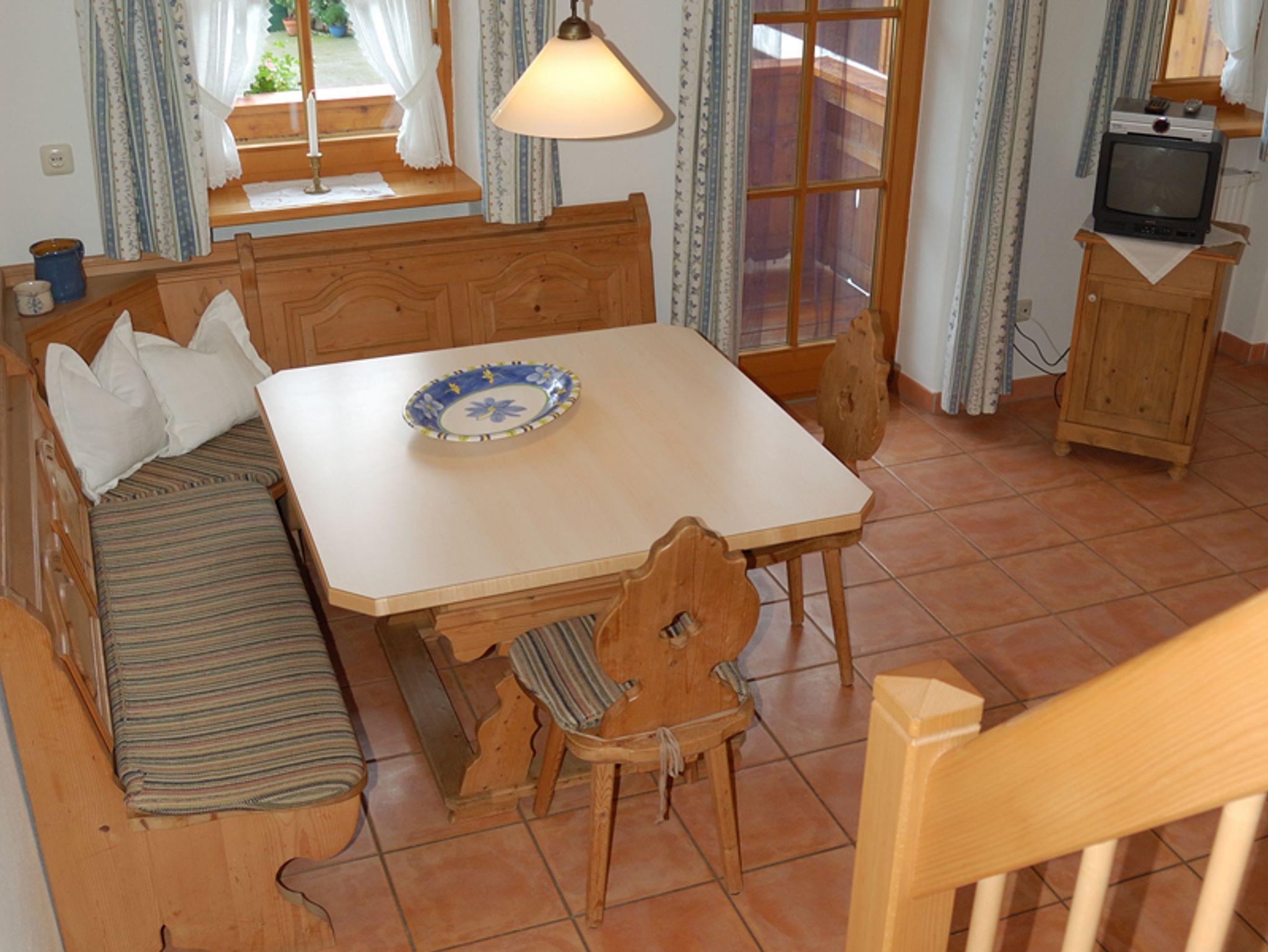 Die Ferienwohnung ist für bis zu 4 Personen geeignet. Im ersten Stock befindet sich die Dusche mit WC, eine geräumige und voll ausgestattete Wohnküche mit großer gemütlicher Essecke. Hier befindet sich auch ein Fernseher mit Satellitenanschluss. Der Balkon ist von der Wohnküche aus begehbar. Von der Wohnküche führt eine Holztreppe in zwei Schlafräume im 2. Stock.