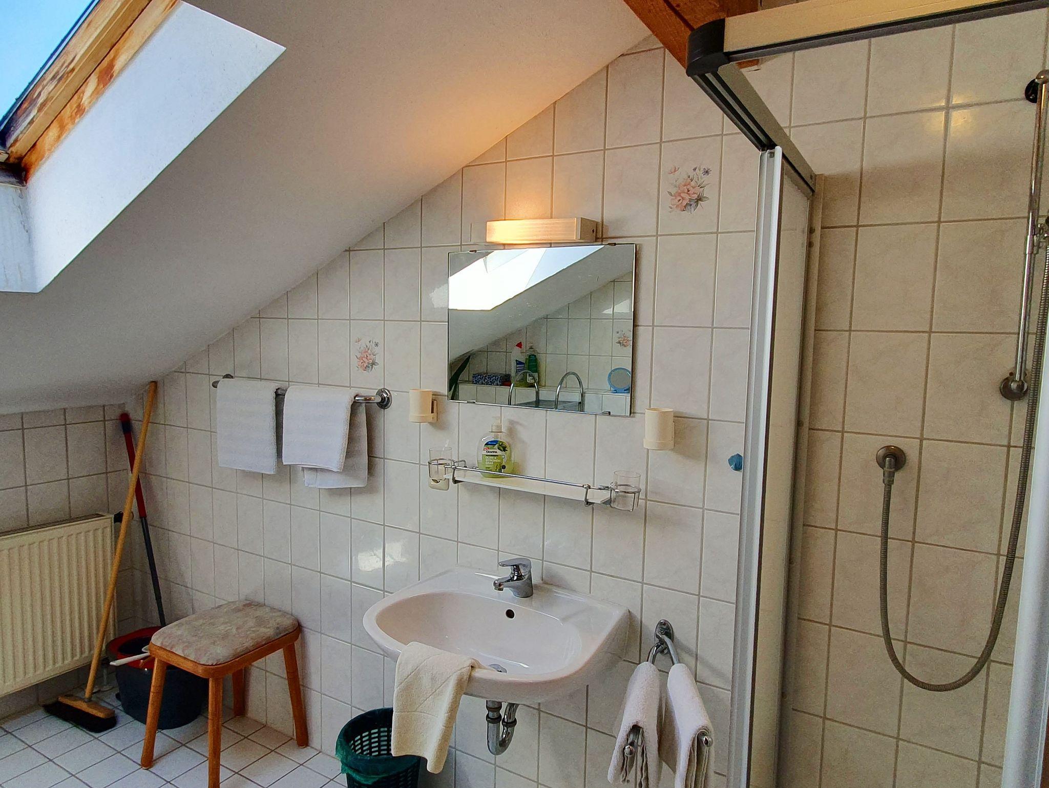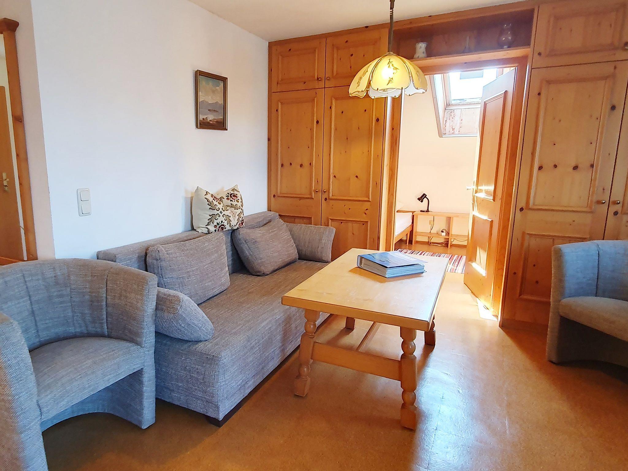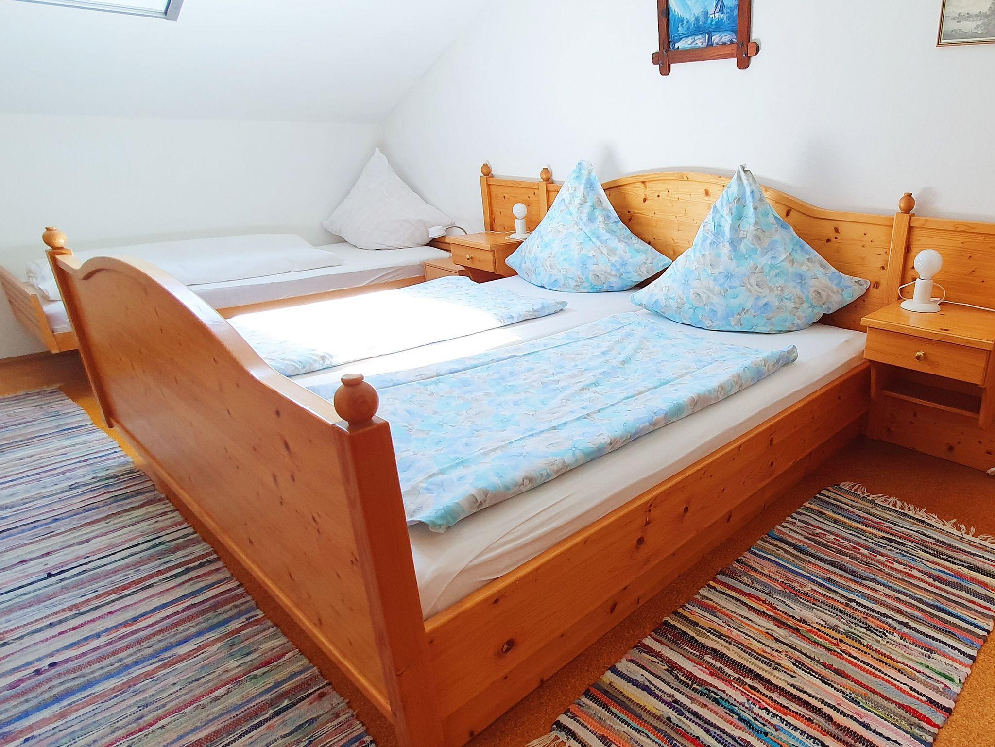 Große Ferienwohung im Dachgeschoß mit kleinem Westbalkon, Wohnküche mit Essecke und Sitzgruppe, Microwelle, Sat-TV, Telefon, 1 Schlafzimmer für 2 Personen und 1 Schlafzimmer für 3 Personen. Kinderbett und Hochstuhl vorhanden. Dusche/WC.