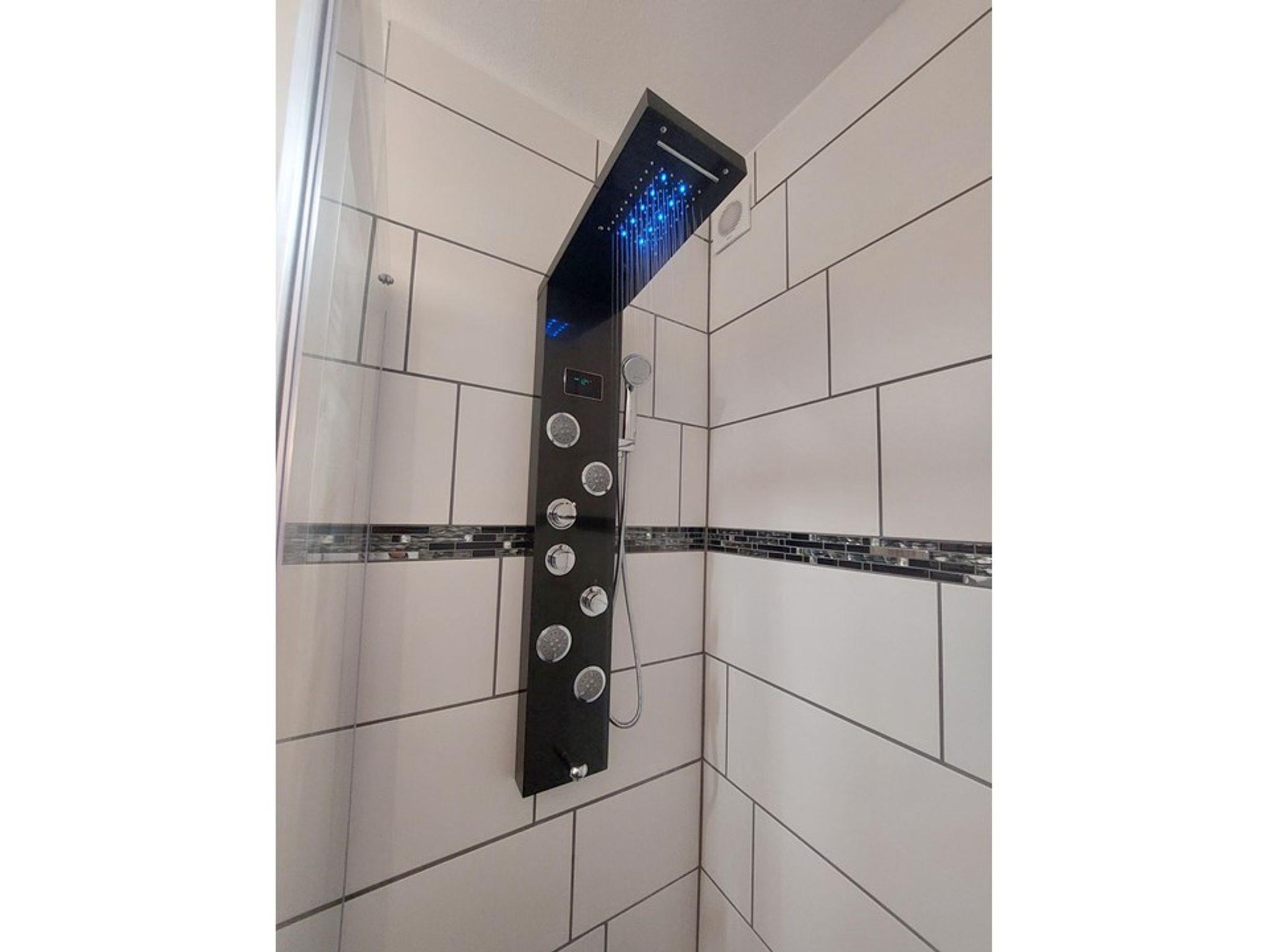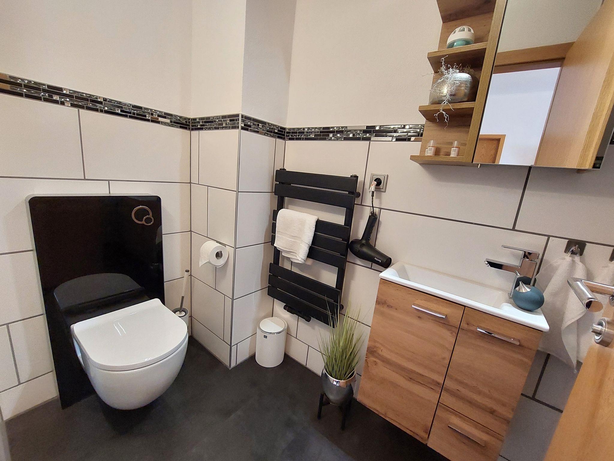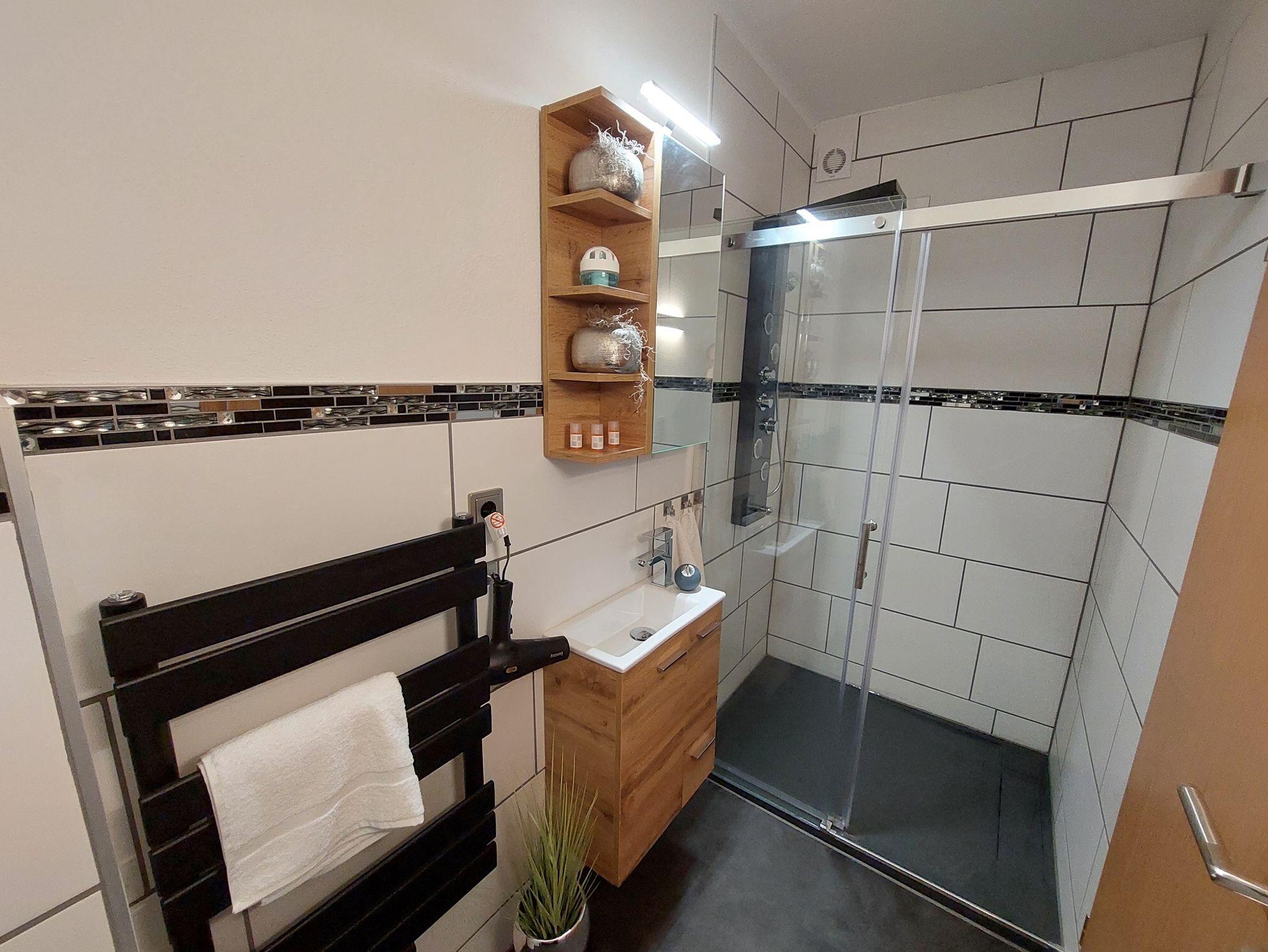 Das Bad ist mit großzügiger Wellnessdusche 90x120cm mit Multifunktionsduschsäule (Massagedusche, Regendusche, Wasserfall, Handbrause, Fußdusche), WC, Waschbecken, Handtuchtrockner und Haarföhn ausgestattet.