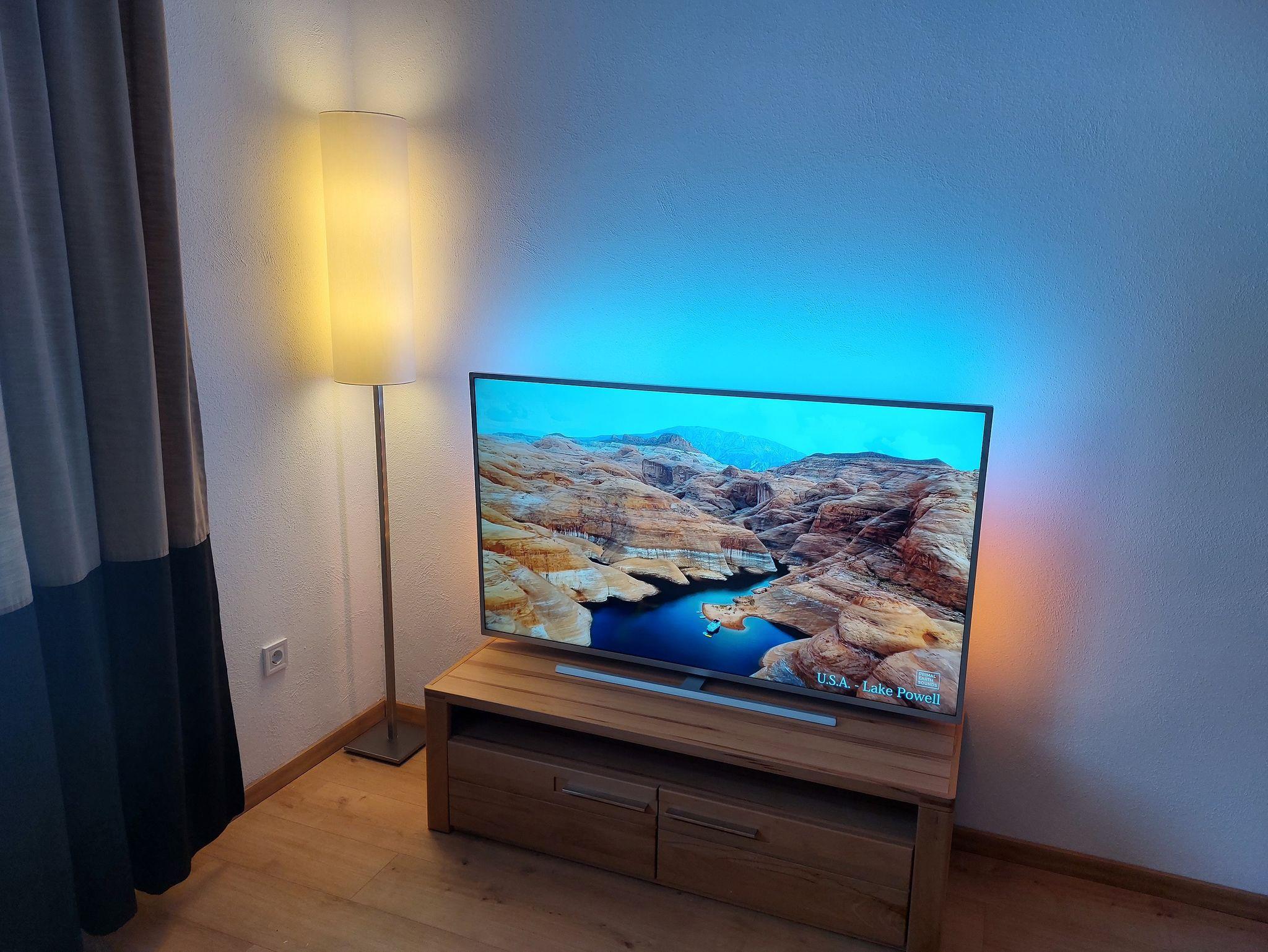Das Wohnzimmer verfügt über eine Schlafcouch mit bequemer Matratze 140x200cm für 1-2 Personen, einen 58 Philips Ambilight SAT- und Smart-TV mit Chromecast build in.