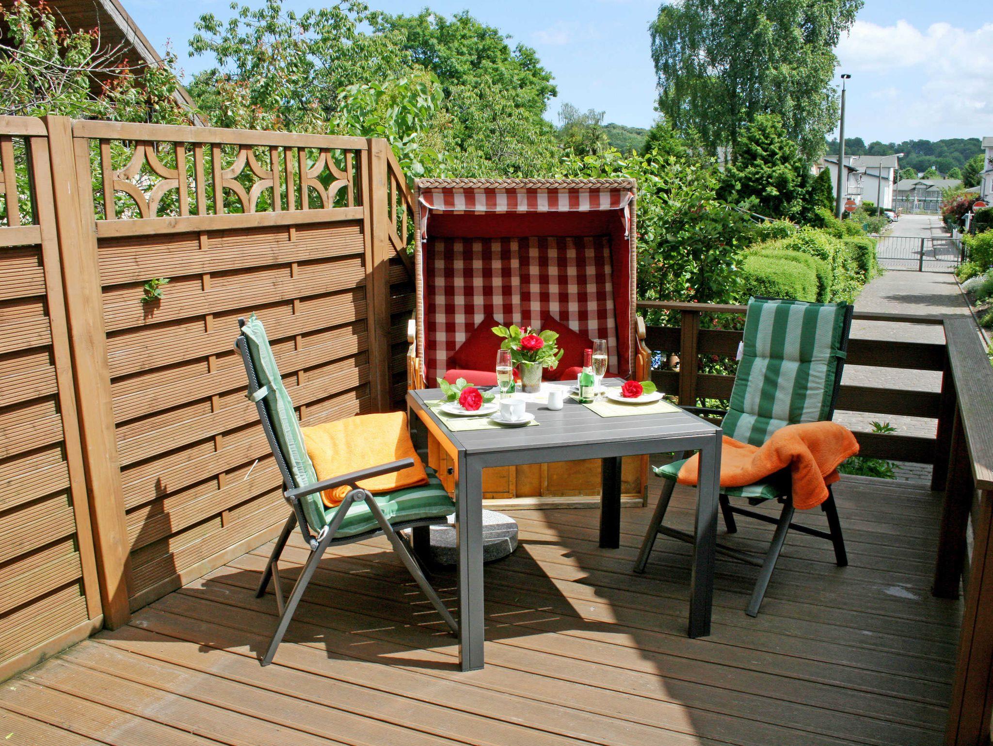 Das moderne Bad ist mit Dusche, WC und Waschtisch ausgestattet und verfügt über Tageslicht. Zum diesem Ferienhaus gehört auch eine schöne Balkonterrasse mit Gartenmöbeln.