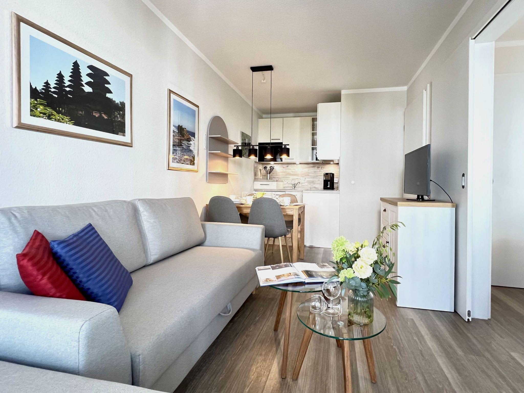 In der offenen Küche, die mit einer Kaffeemaschine und einem Toaster ausgestattet ist, können Sie sich selbst versorgen. Ein Fernseher mit 3 Sky-Sendern rundet die hochwertige Ausstattung ab. Auf dem Balkon in Nordwestlage können Sie den Ausblick und die Sitzmöglichkeiten genießen und sich dabei wie im Urlaub fühlen. Bitte beachten Sie, dass es sich um ein Nichtraucher-Apartment handelt und Haustiere nicht gestattet sind.