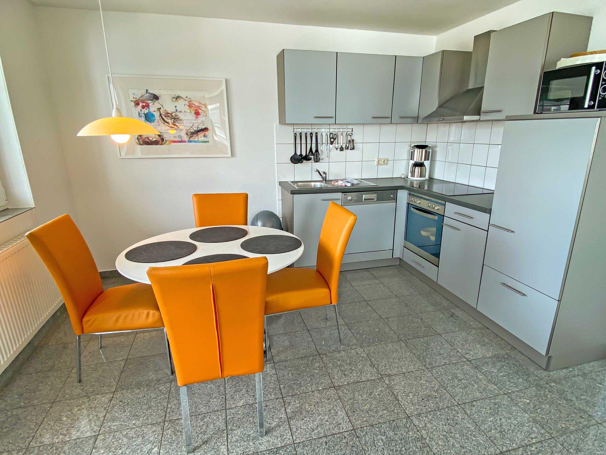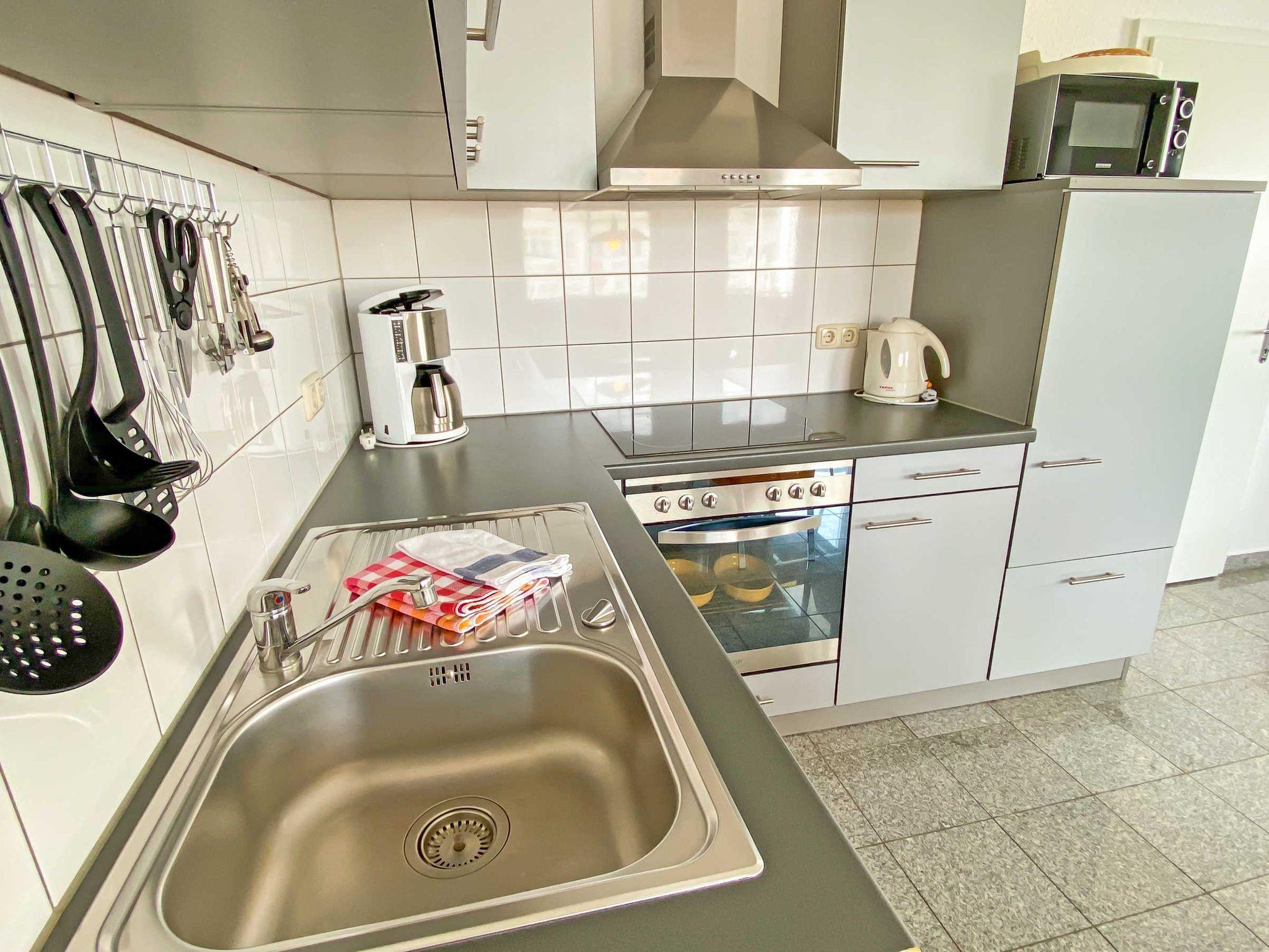 Die in den Wohnraum integrierte, sehr gut ausgestattete Einbauküche verfügt über einen Herd mit Ceranfeld und Backofen, Kühlschrank mit Gefrierfach, Spülmaschine, Mikrowelle, Kaffeemaschine, Toaster, Wasserkocher sowie ausreichend Geschirr und Kochutensilien.