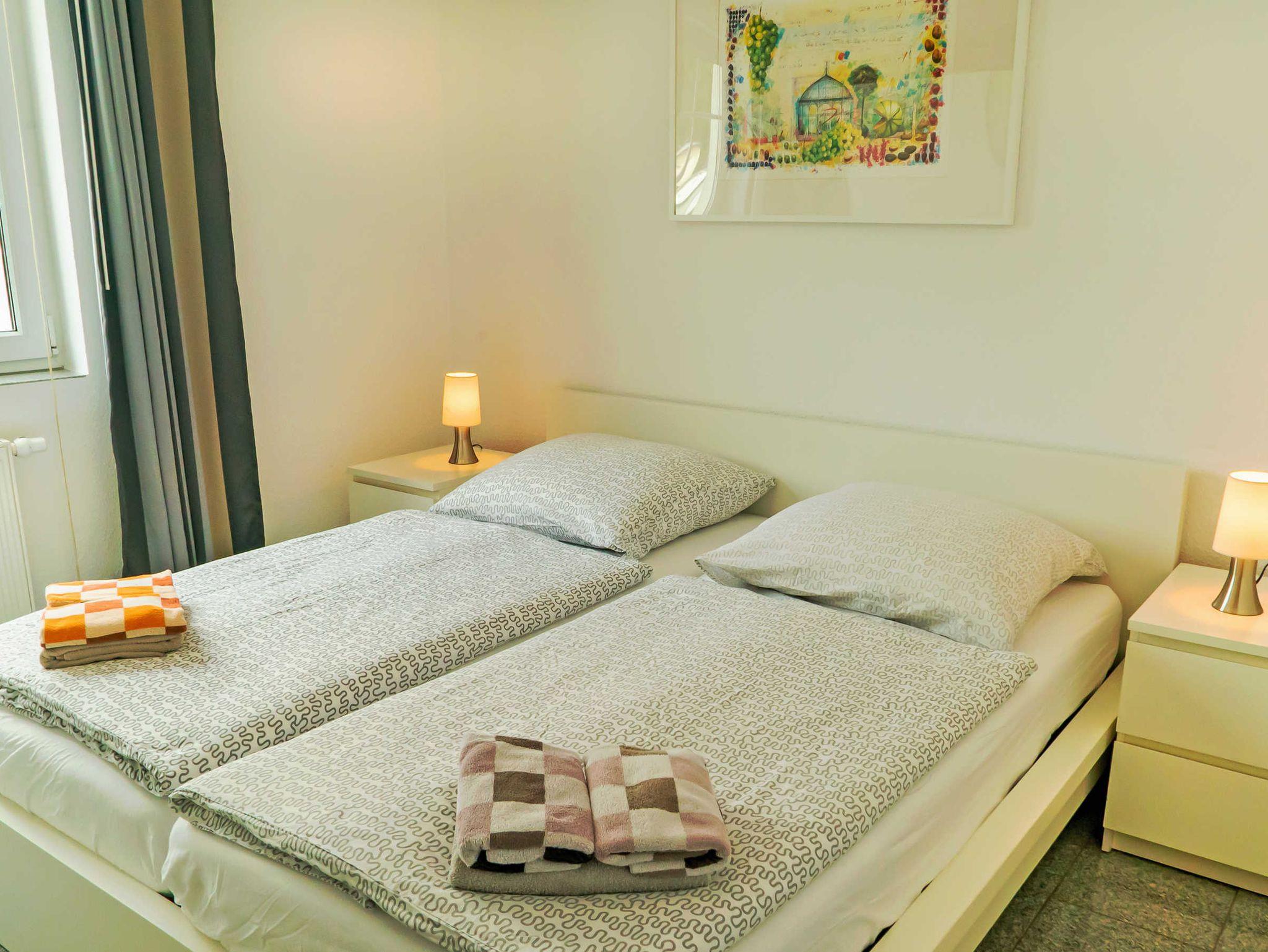 Im Schlafzimmer stehen ein bequemes Doppelbett (1,80x2,00m) mit zwei Nachttischen und Lampen sowie ein großzügiger Kleiderschrank. Für zwei weitere Gäste kann bei Bedarf im Wohnraum die Schlafcouch (1,40x2,00m) aufgebettet werden.