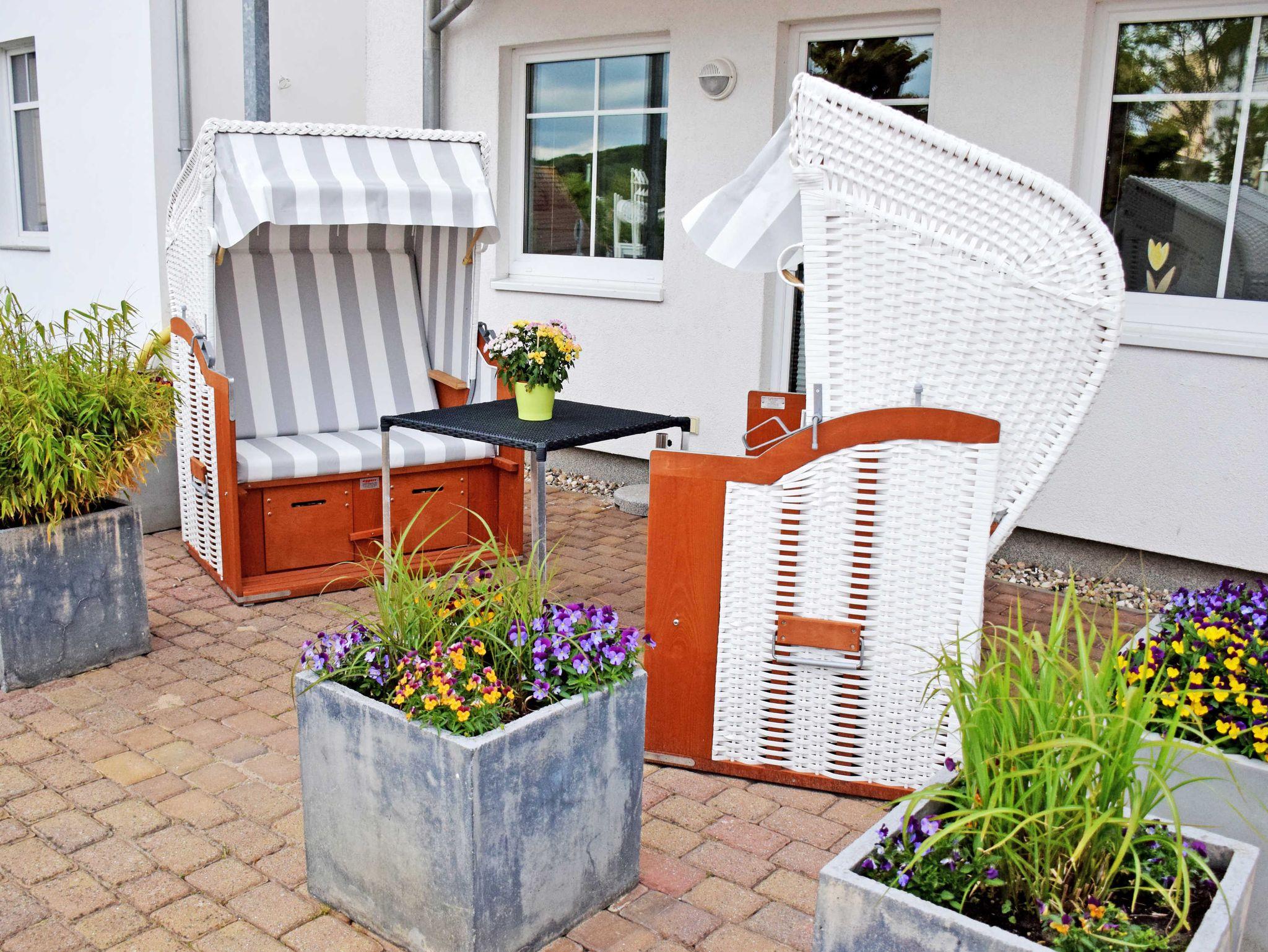 Die große teils überdachte Terrasse mit Strandkörben und Tisch erweitert den Wohnraum. Lange frühstücken, sonnenbaden oder am Abend den Tag beim Sonnenuntergang gemütlich ausklingen lassen, alles ist möglich.