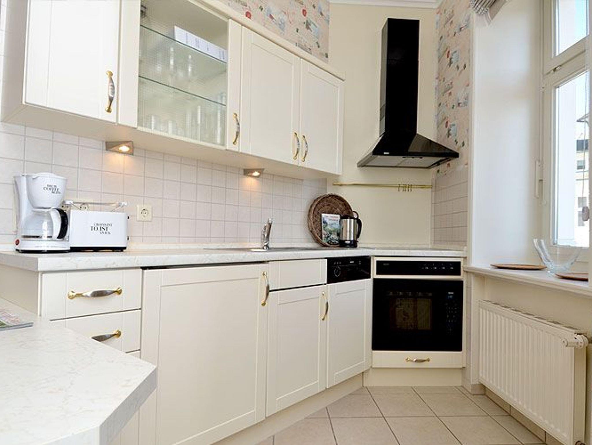 Die harmonisch im Wohnbereich integrierte Küchenzeile ist ausgestattet mit einem Kühlschrank mit Gefrierfach, einem 4-Platten-Ceranfeld, einer Spülmaschine, einer Mikrowelle mit Grillfunktion und diversem Kleininventar, das die Küchenausstattung komplettiert.