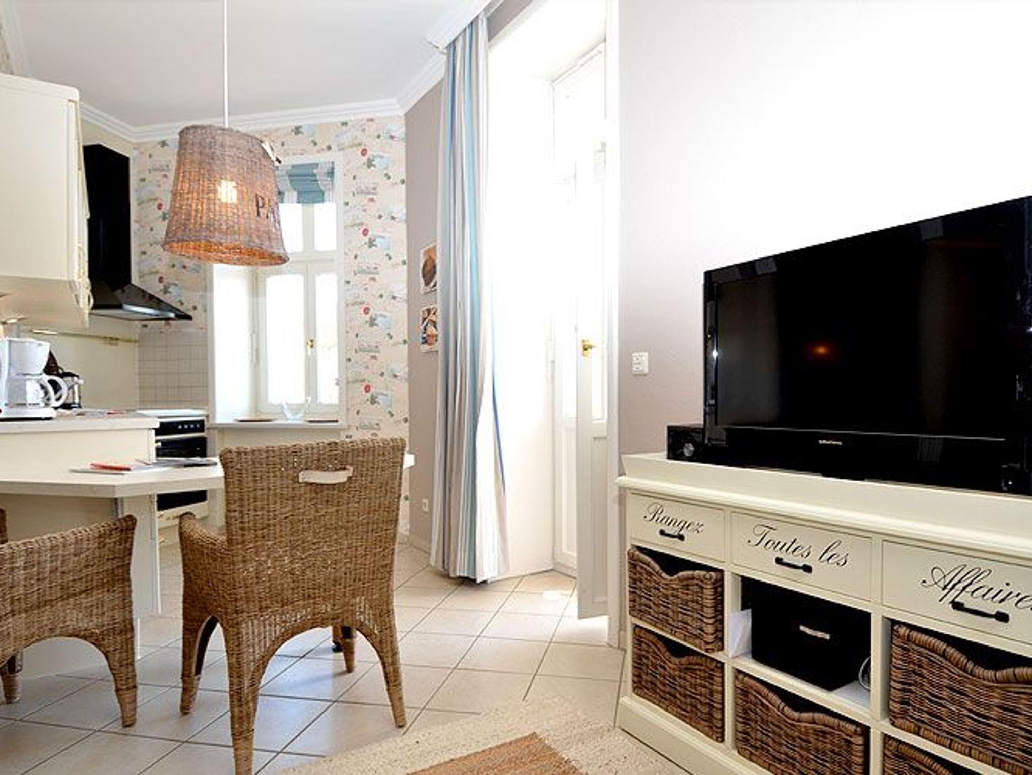 Dieses rund 40m² große und sehr stilvoll eingerichtete 2-Raum-Appartement erwartet Sie im 1. Obergeschoss und bezaubert u.a. mit seinem gut 11m² großen, möblierten Holzbalkon im Bäderstil zur Morgensonne mit Blick auf die wunderschöne Wilhelmstrasse. Die wunderschönen Landhausmöbel, ausgesuchte Stoffe und die warmen Erdtöne schaffen mit den leicht maritimen Akzenten ein ganz einzigartiges Wohlfühlambiente. Die gesamte Nichtraucherwohnung ist gefliest bzw. mit Designerboden in Vintage-Oak-Optik versehen.