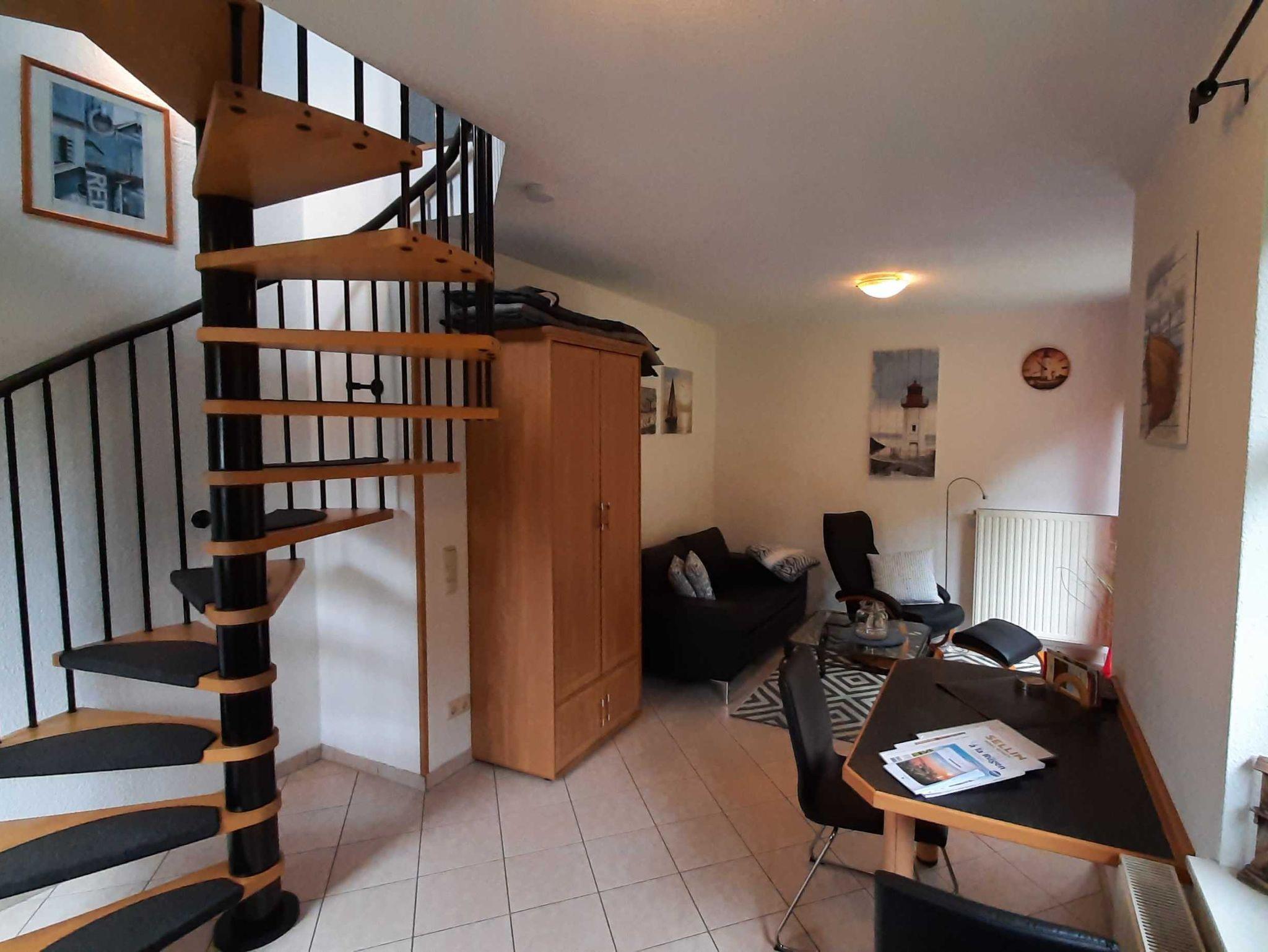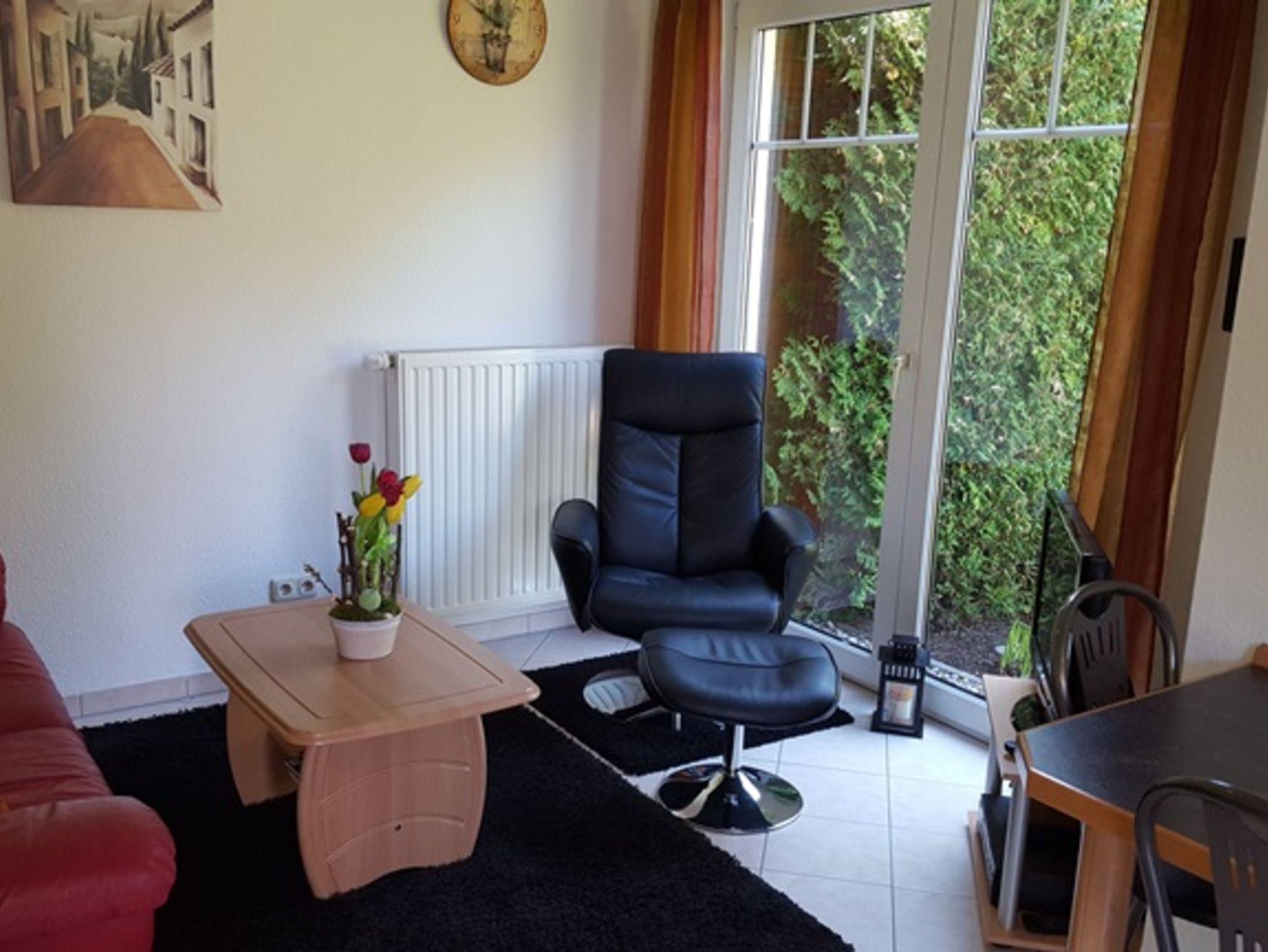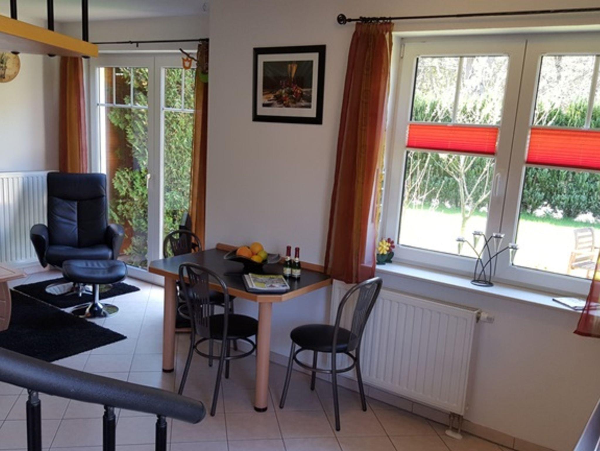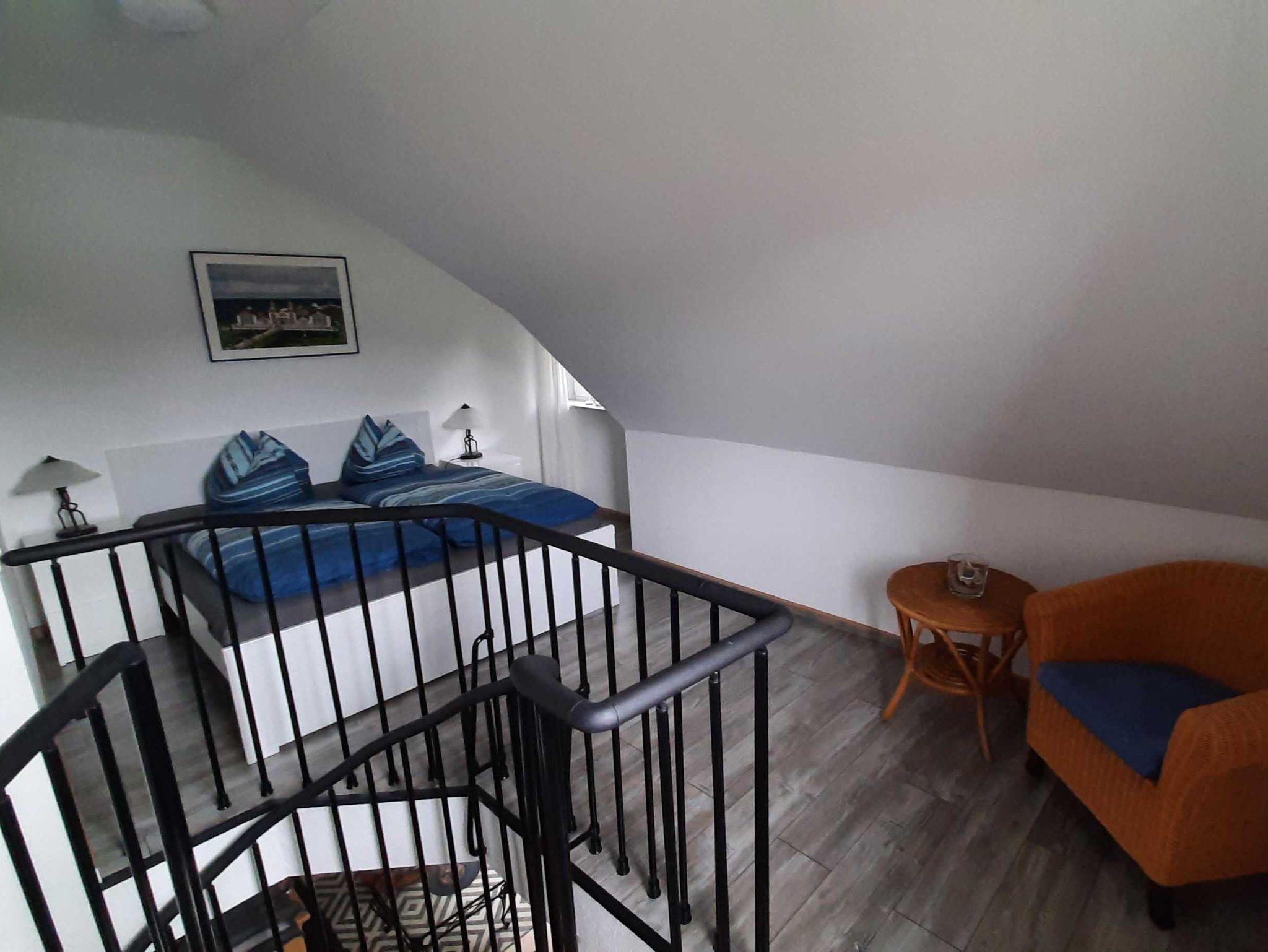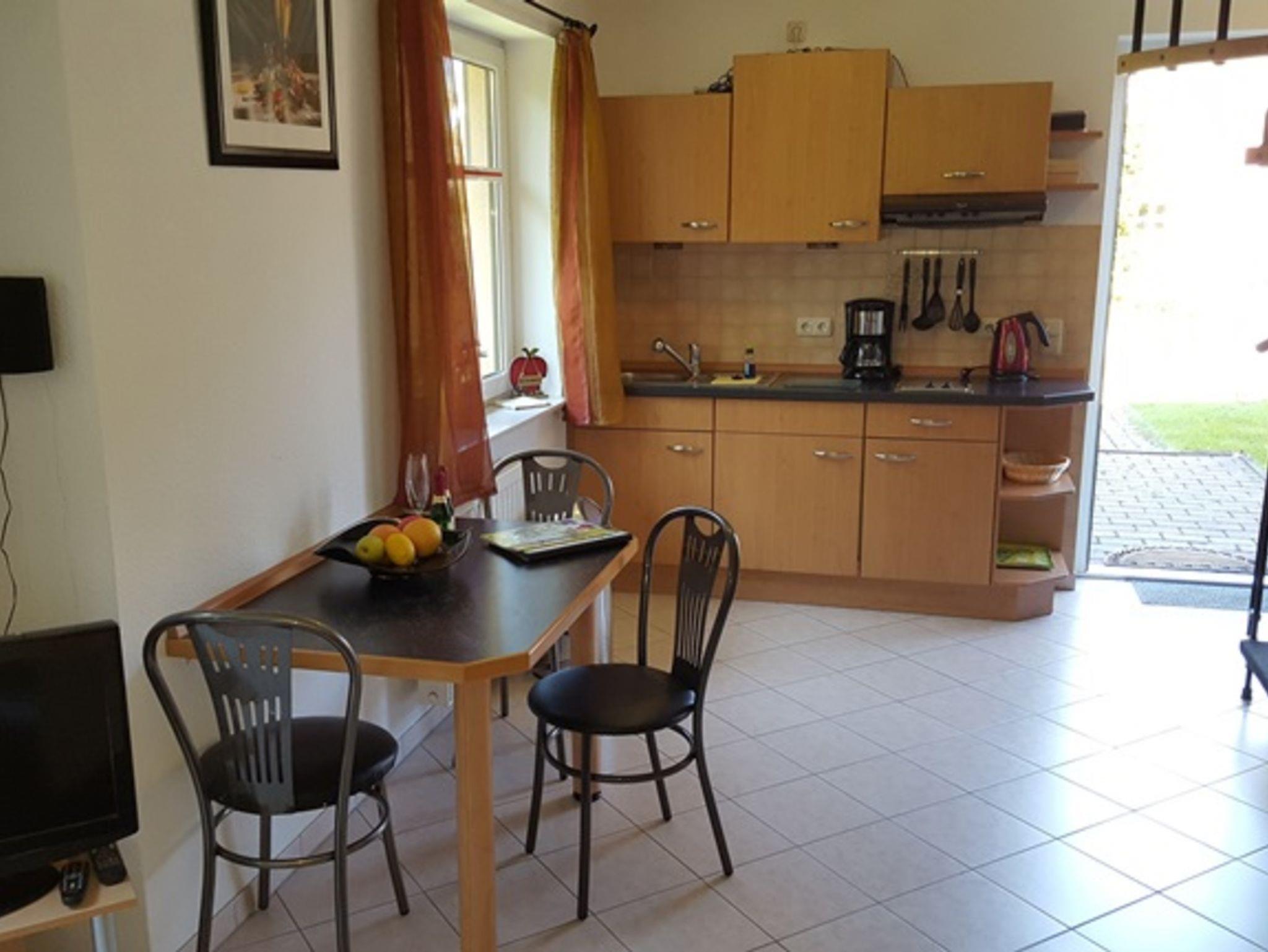 Die komfortable eingerichtete 38 qm großeMaisonetten- Ferienwohnung hat einen separaten Eingang und befindet sich im Parterre eines Einfamilienhauses. Die Wohnung verfügt über einen lichtdurchfluteten kombinierten Wohn und Eßbereich mit Einbauküche welche mit einem Zweiplattenherd, Wasserkocher, Mixer, Toaster und Kaffeemaschine ausgestattet ist. Ein Fernseher und DVD-Player stehen zur Nutzung bereit. Neben dem Wohnraum befindet sich die Dusche/WC. Über eine gespindelte Treppe gelangen Sie vom Wohnraum in den Schlafbereich mit einem Doppelbett Bei schönem Wetter lädt eine Sitzecke am Haus mit Grillmöglichkeit zum Verweilen ein. Ein PKW-Stellplatz ist am Haus. Die Erstausstattung der Bettwäsche und Handtücher stellt Ihnen der Vermieter kostenlos zur Verfügung