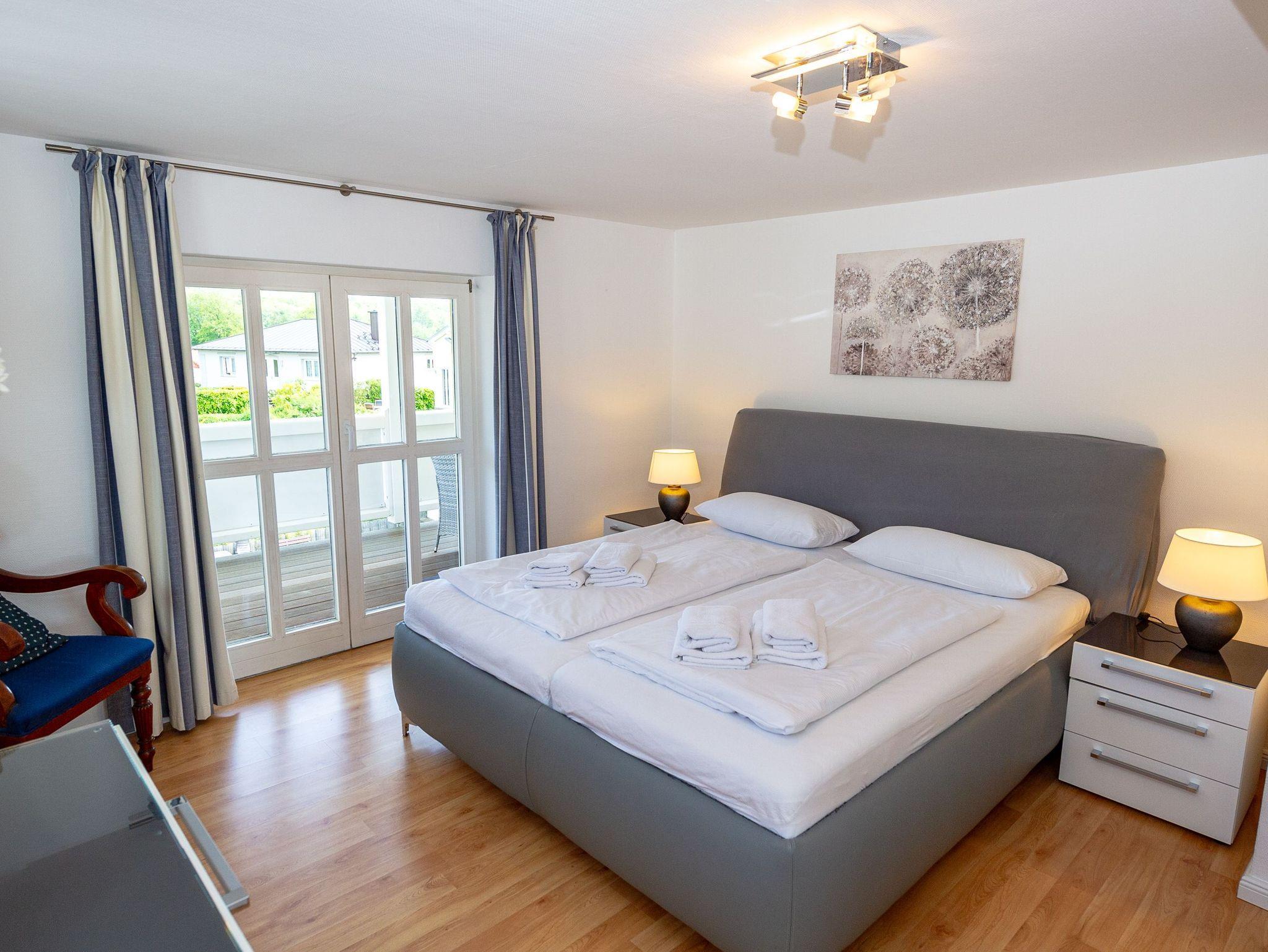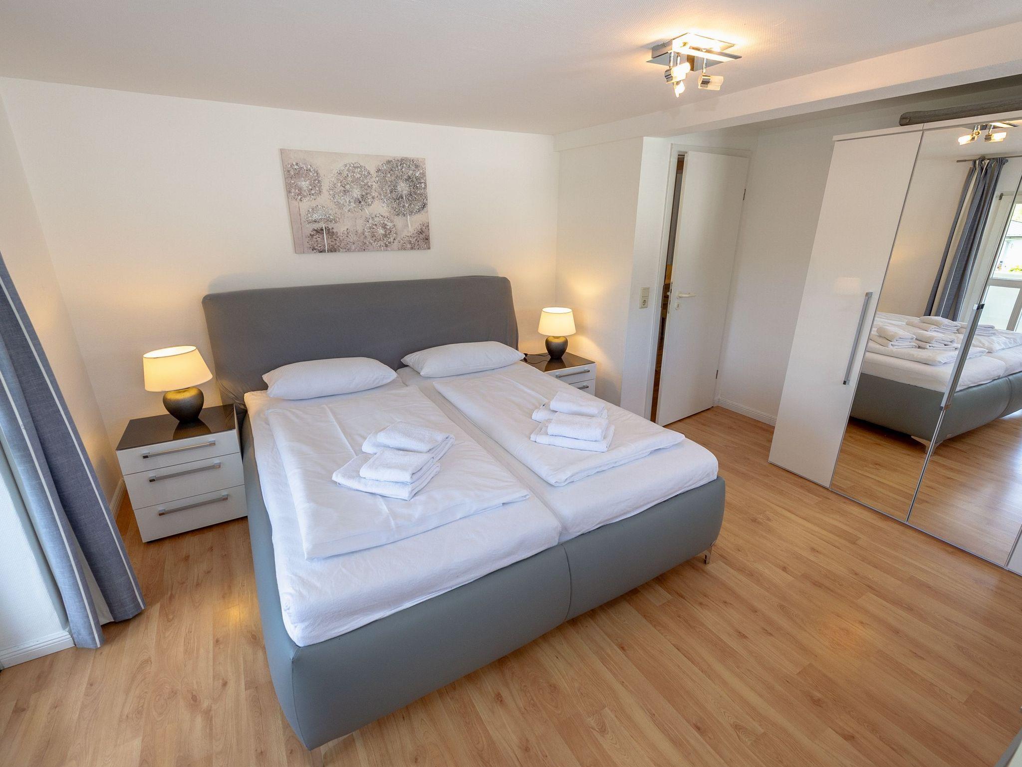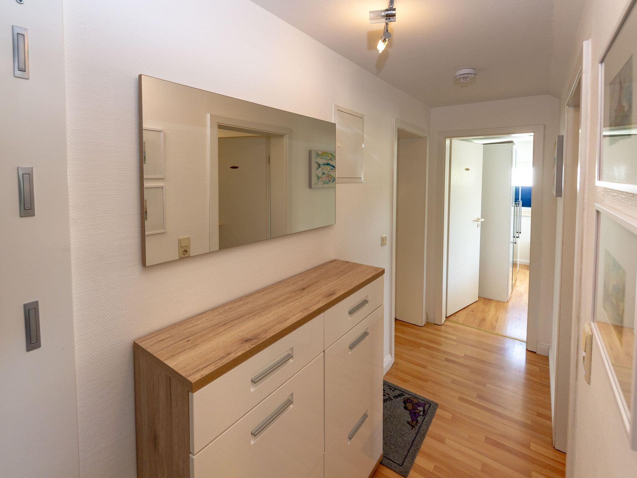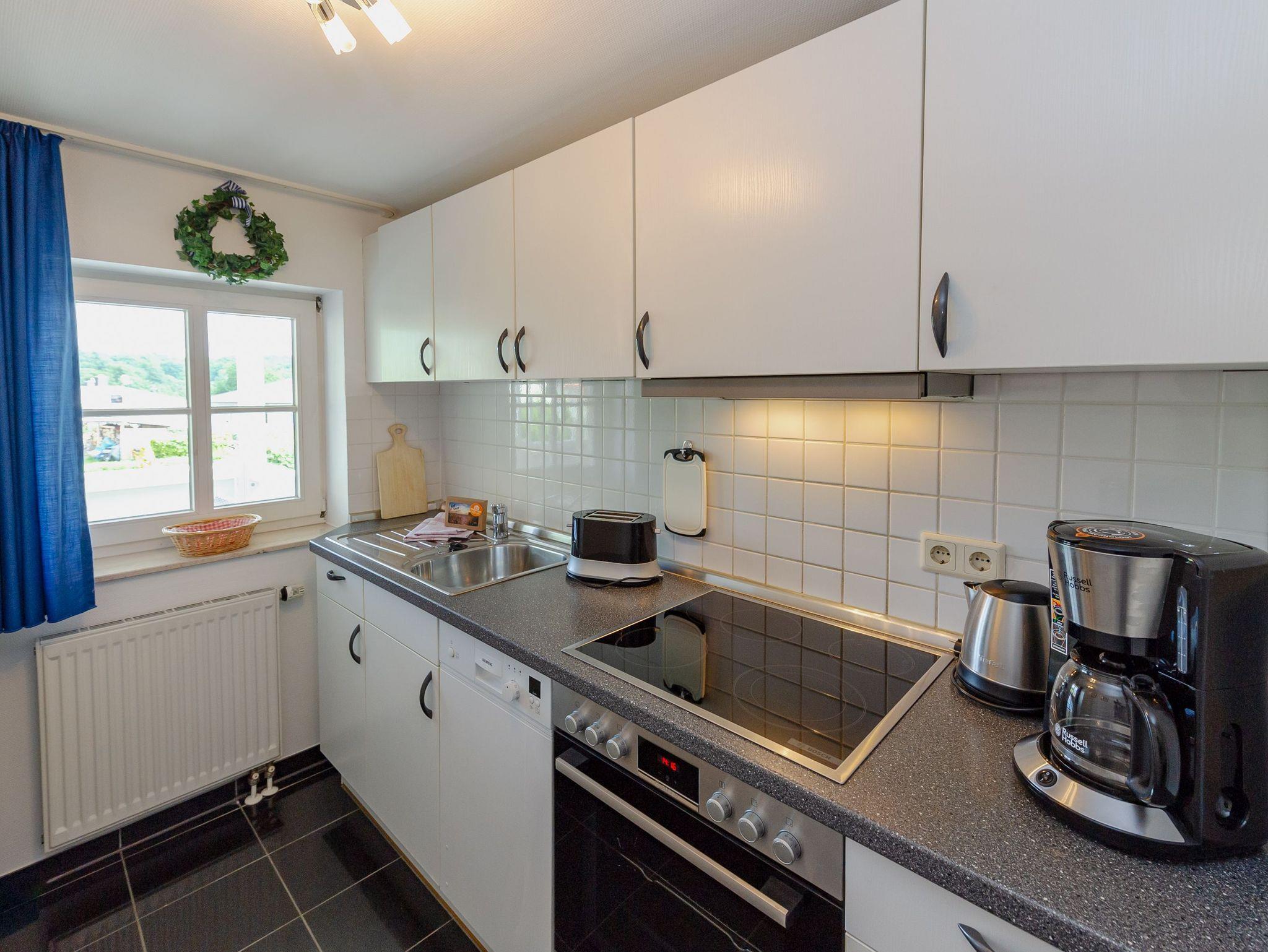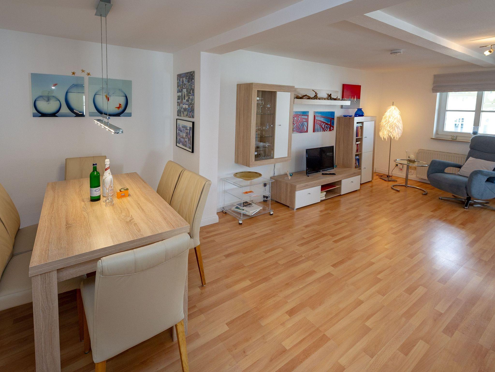 Über den Flur gelangen Sie in den modern und gemütlich ausgestatteten Wohnbereich mit einer bequemen Couchgarnitur, einem Relaxsessel, einem Flachbild-TV, Büchern zum Schmökern und dem Esstisch. Die separate Küche bietet Ihnen mit einem 4-Zonen-Ceranherd inkl. Backofen und Dunstabzug, einem Kühlschrank mit Gefrierfach, einer Spülmaschine, Kaffeemaschine, Wasserkocher und Toaster alle Möglichkeiten zur bequemen Selbstverpflegung. Mehrere Bäckershops finden Sie in fußläufiger Entfernung. Speisen und relaxen können Sie natürlich auch wunderbar auf Ihren beiden Balkonen. Diese sind überdacht.