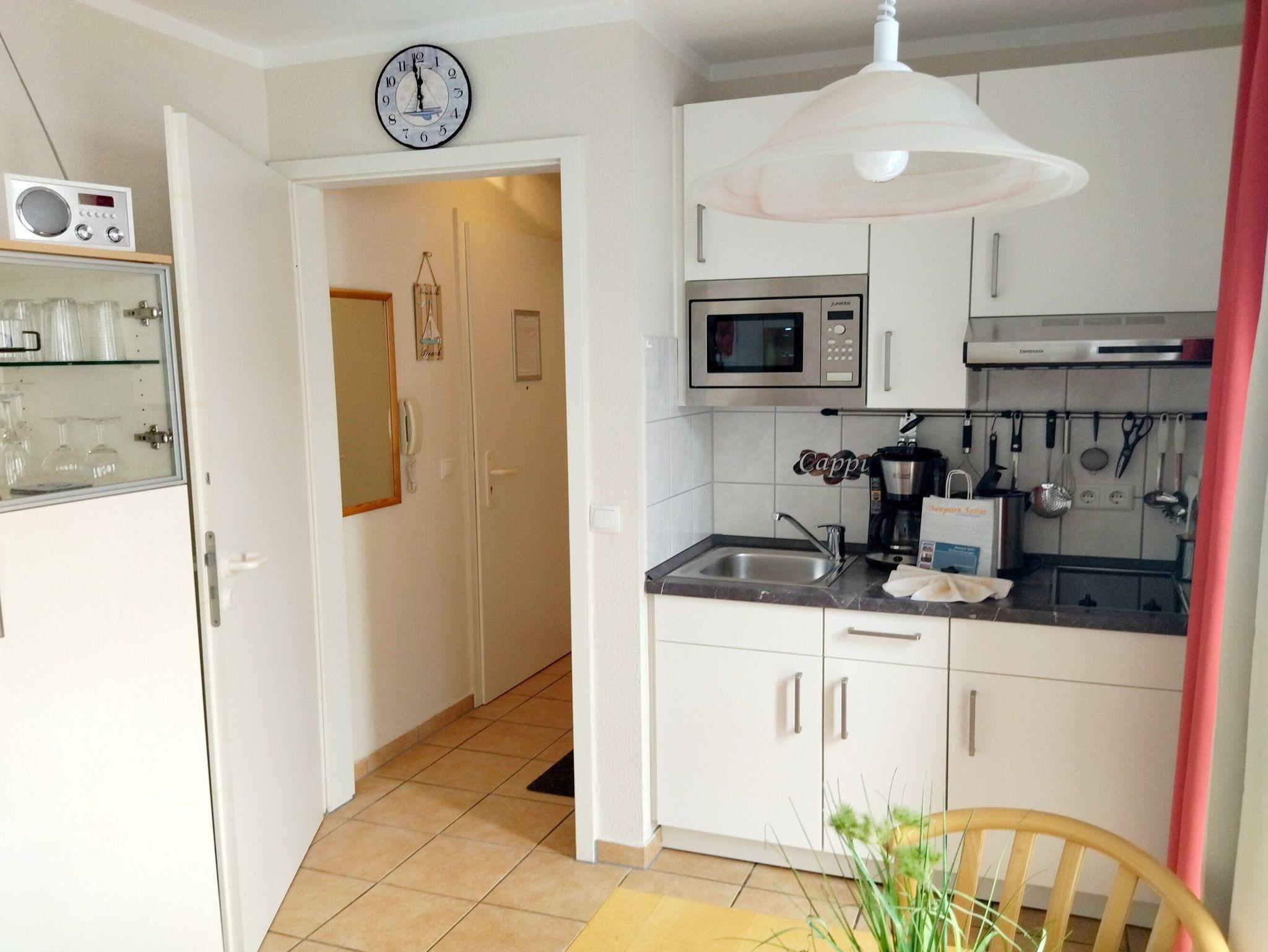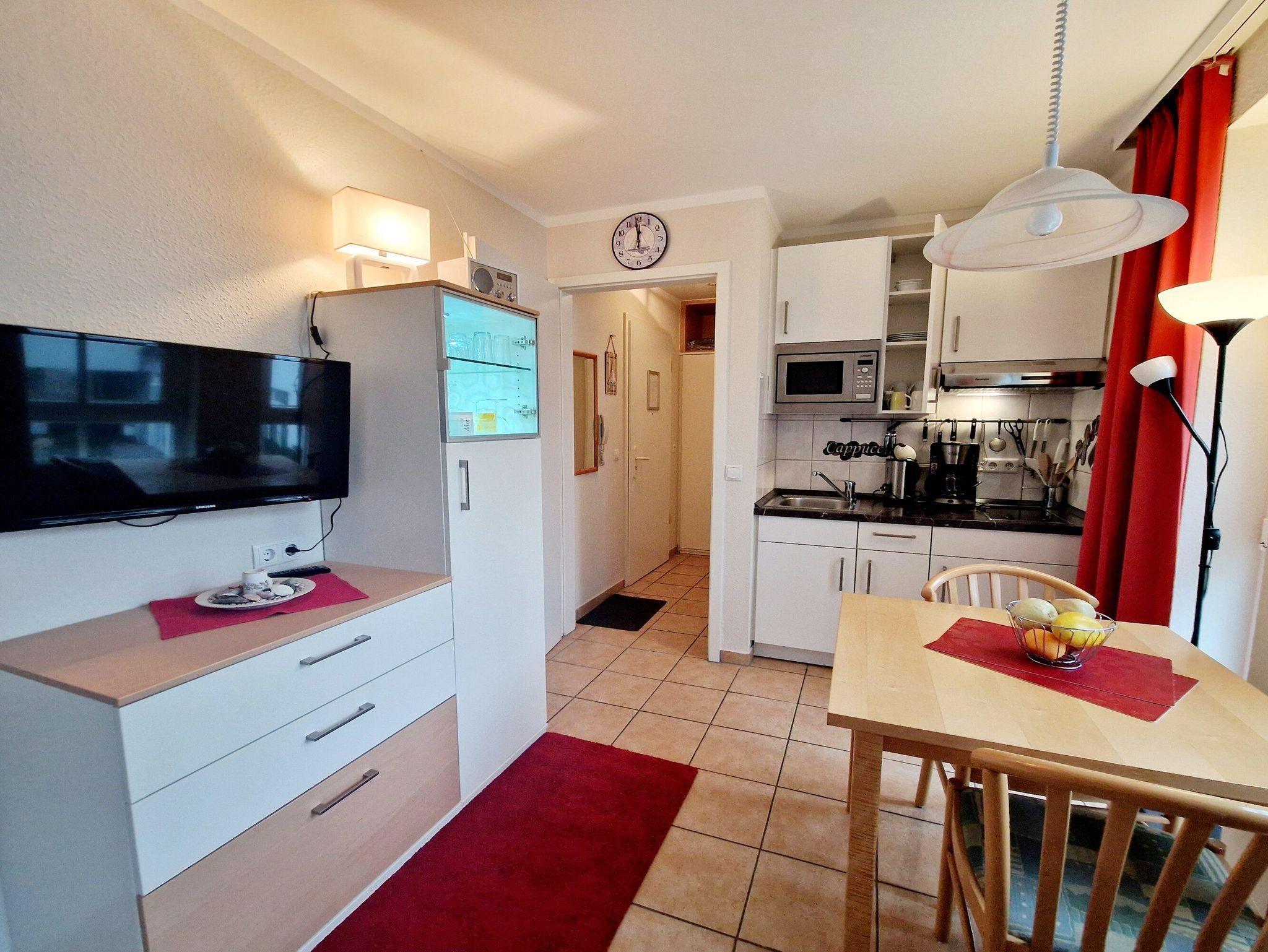 Die Ferienwohnung verfügt über kostenfreies WLAN und die Erstausstattung an Bettwäsche ist inklusive. Der kombinierte Wohn-/Schlafbereich mit Verdunklung verfügt über ein Doppelbett als Schrankbett. Darüber hinaus verfügt die Ferienwohnung über ein Bad mit Dusche/WC und Föhn. Die voll ausgestattete Pantry mit Mikrowelle, Kaffeemaschine und Toaster lässt keine Wünsche offen. Ein Fernseher inkl. 3 Sky-Sender rundet die gute Einrichtung ab.