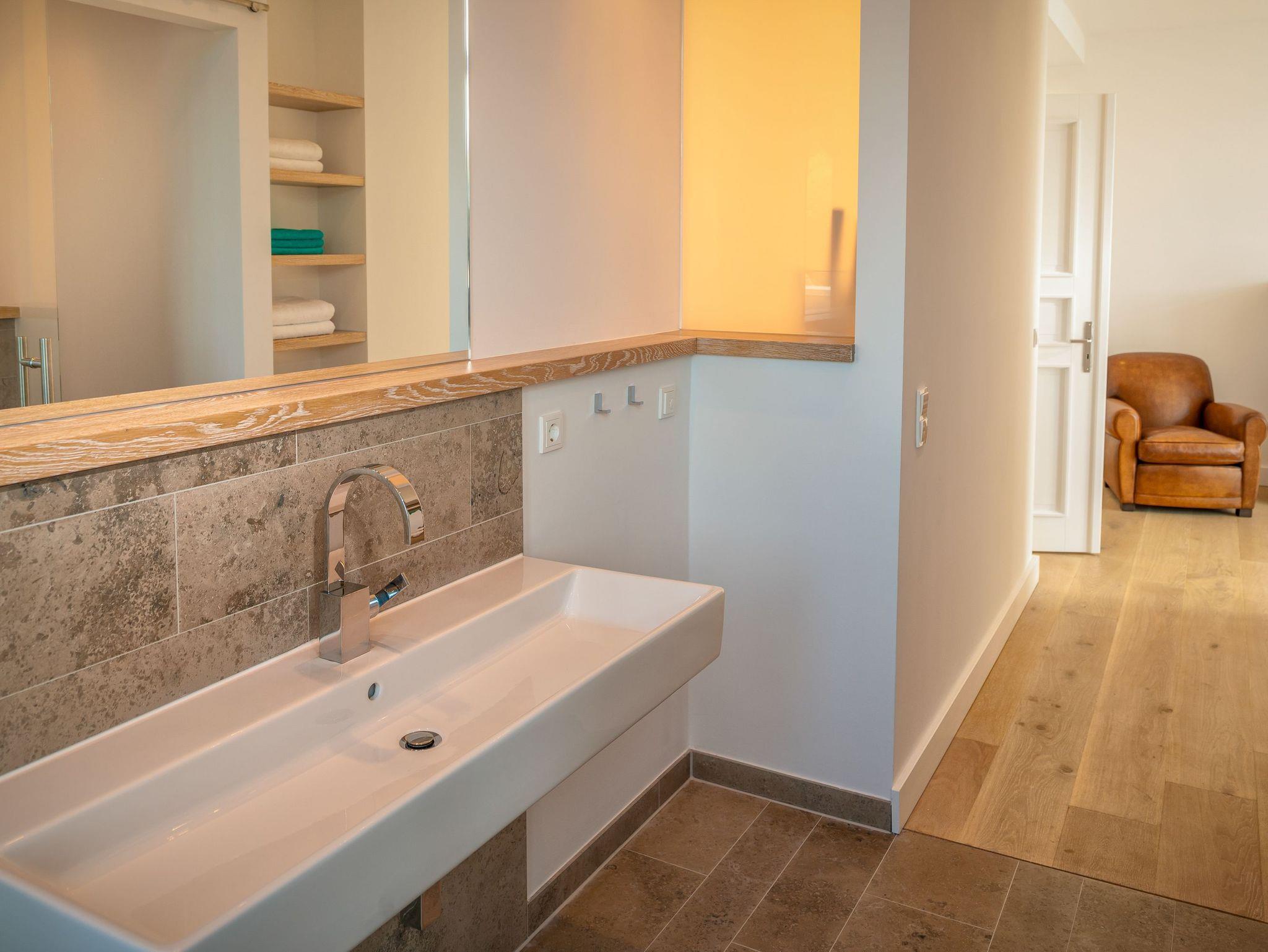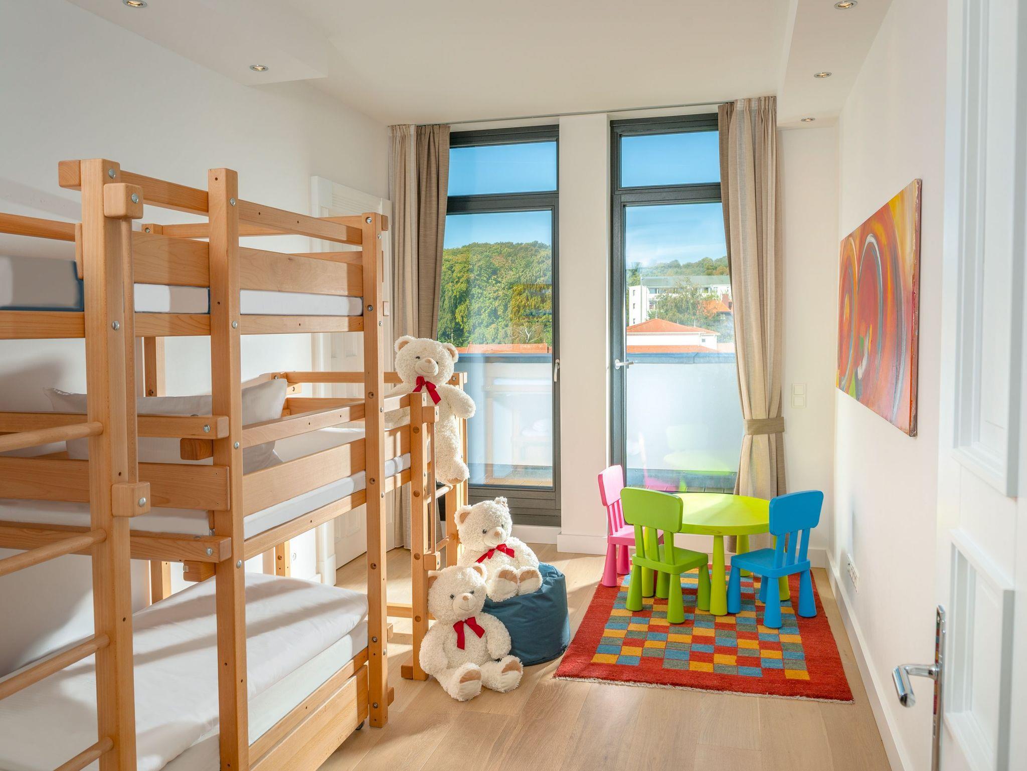Vom Flur aus betreten Sie das Kinderschlafzimmer. Hier gibt es ein eigens angefertigtes Designer - Dreietagenbett mit vier bequemen Schlafmöglichkeiten und eine Kindersitzgruppe für unsere kleine Gäste. Daran anschließend finden Sie einen vom Schlafzimmer optisch getrennten Waschbereich mit Waschbecken und Spiegel. Von hier gelangen Sie durch eine Tür in den separaten, kleinen Wellnessbereich mit eigener Sauna und zwei Walkin-Duschen, eine davon mit Rainshower-Duscherlebnis. Die Sauna können Sie auch durch eine weitere Tür vom Flur aus betreten. Ein zusätzliches Gäste-WC steht zur Verfügung.