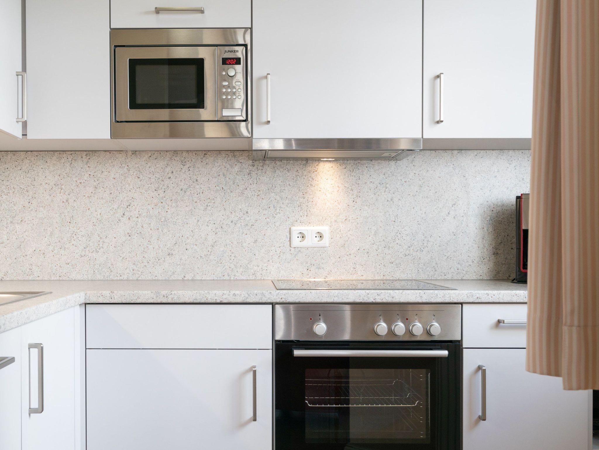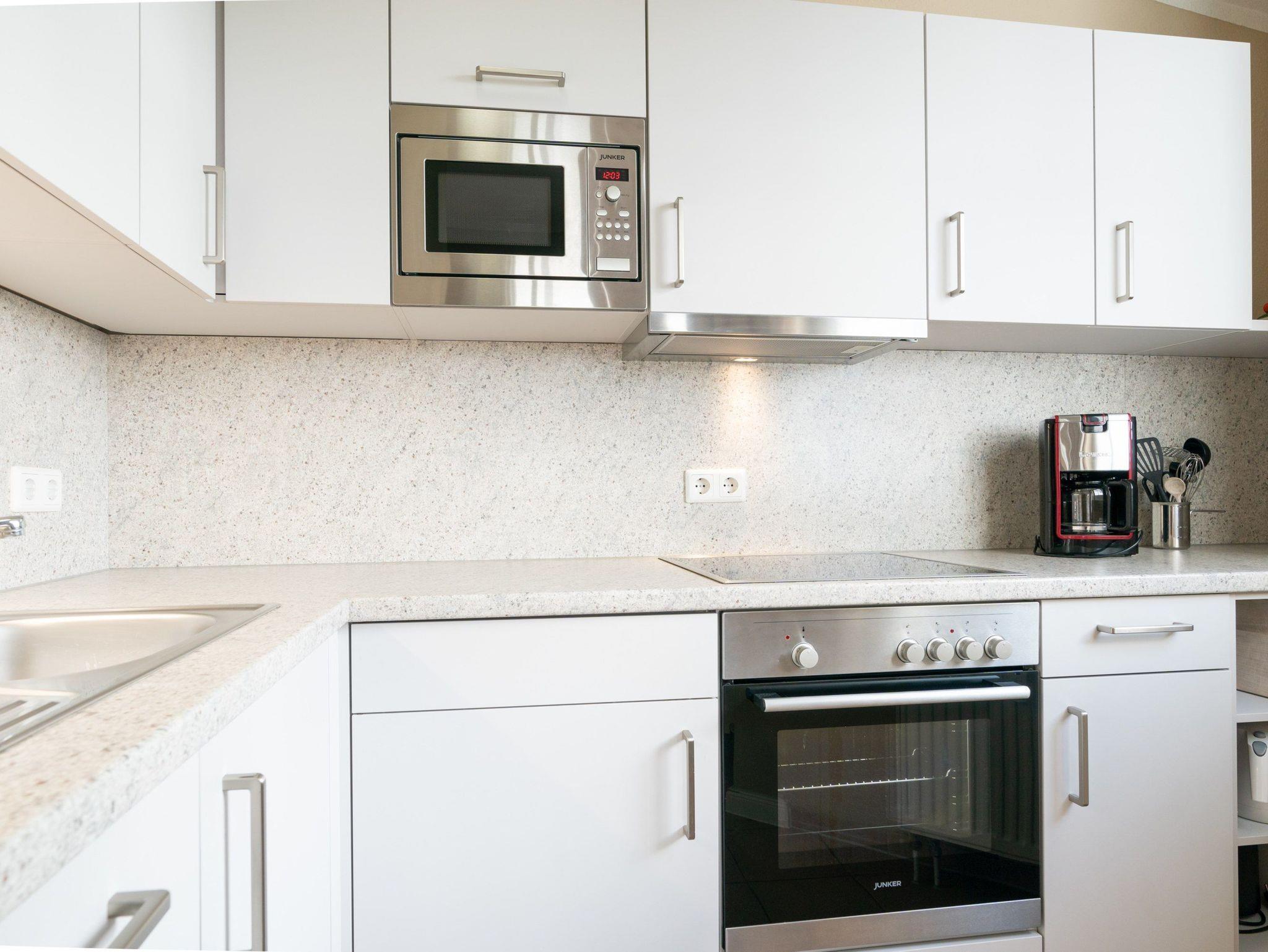 Zur weiteren Ausstattung gehören ein Flachbildfernseher, eine Kaffeemaschine (Filter), eine Mikrowelle, ein Geschirrspüler und Bettwäsche, die bereits im Preis inkludiert ist. Für gemütliche Abende steht ein Balkon zur Verfügung und die offene Wohnküche lädt zum gemeinsamen Kochen ein. Auch ein Fahrradkeller sowie ein WLAN-Anschluss sind vorhanden. Gäste können zudem kostenfrei die Sky-Sender auf dem Fernseher nutzen und sich in der Badewanne entspannen. Ein Tiefgaragenstellplatz kann gegen Aufpreis genutzt werden und für frische Brötchen am Morgen sorgt der Brötchenservice.