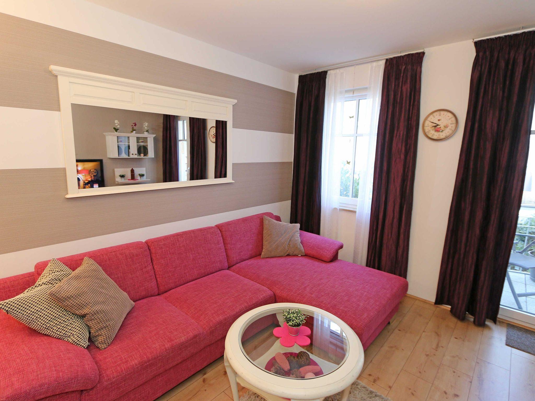 Die Nichtraucherwohnung umfasst ca. 49 m² und befindet sich in der ersten Etage des Hauses. Diese können Sie bequem mit dem Aufzug erreichen. Der geräumige Wohnbereich verfügt über ein Ecksofa (1,60 m x 2,00 m), welches als Aufbettungsmöglichkeit für zwei Personen genutzt werden kann, einen Couchtisch sowie einer Anrichte und Vitrine. Abgerundet wird der Wohnbereich durch einen LED-TV, einer Mini-Stereo-Anlage mit CD- und Blue-Ray-Player, sowie einer Spielesammlung und DVD's. Auch auf einen Internetanschluss (WLAN) brauchen Sie nicht verzichten. Dieser ist für Sie inklusive. Ein Plätzchen mit einem bequemen Sessel und einer Leselampe finden Sie zusätzlich mit einer kleinen Auswahl an Büchern für Groß und Klein. Angrenzend befindet sich die kleine Küchenzeile mit einen 2 Zonenceranfeld, einen Kühlschrank mit Gefrierfach, einen Geschirrspüler, eine Mikrowelle, eine Kaffeemaschine, einen Wasserkocher, einen Toaster sowie diverse Küchenutensilien. Gemütlich und bequem können Sie Ihre Mahlzeiten am Esstisch genießen. Vom Wohn- und Schlafbereich können Sie den bestuhlten Balkon (Ost) erreichen. Das Schlafzimmer, welches auch mit einem LED-TV ausgestattet ist, verfügt über ein Doppelbett (1,80 m x 2,00 m), verstellbaren Lattenroste, 2 Nachttischablagen und ein Kleiderschrank. Im Bad finden Sie neben einer ebenerdigen Glasdusche auch ein WC, einen Waschplatz, Handtuchheizkörper und einen Fön. Alle Räumlichkeiten verfügen über Fußbodenheizung, die für angenehme Wärme sorgt. Für einen glatt ablaufenden Urlaubstag stehen Ihnen ein Bügelbrett und ein Bügeleisen zur Verfügung. 2 kleine Haustiere sind mit Ihrem eigenen Schlafplatz gegen eine Gebühr gern gesehene Gäste. Empfehlenswert ist der stilvoll ausgebaute Wellnessbereich, der von allen Hausgästen gegen eine Gebühr genutzt werden kann. Die Wertmarken können Sie auf Nachfrage während Ihres Urlaubes erwerben. Hier im Erdgeschoß finden Sie in der Sauna, im Dampfbad und im Ruheraum vor allem in den kalten Jahreszeiten, Entspannung und pure Ruhe. Von Ihrem Tiefgaragenstellplatz (Nr.04, Einfahrtshöhe 2,00 m) Doppelparker Höhe 1,80 m und Länge 5,00, können Sie bequem durch den Aufzug Ihre Wohnung erreichen. Ein abschließbarer Fahrradraum steht Ihnen in der Tiefgarage zur Verfügung. Die Erstausstattung eines Wäschepaketes (komplette Bettwäsche, 1 Duschhandtuch, 1 kleines Handtuch) können Sie bis 14 Tage vor Anreise gegen einen Aufpreis dazu buchen oder durch eigene ergänzen. Ab 2 gebuchten Paketen erhalten Sie einmalig 1 Geschirrhandtuch und 1 Duschvorleger hinzu.