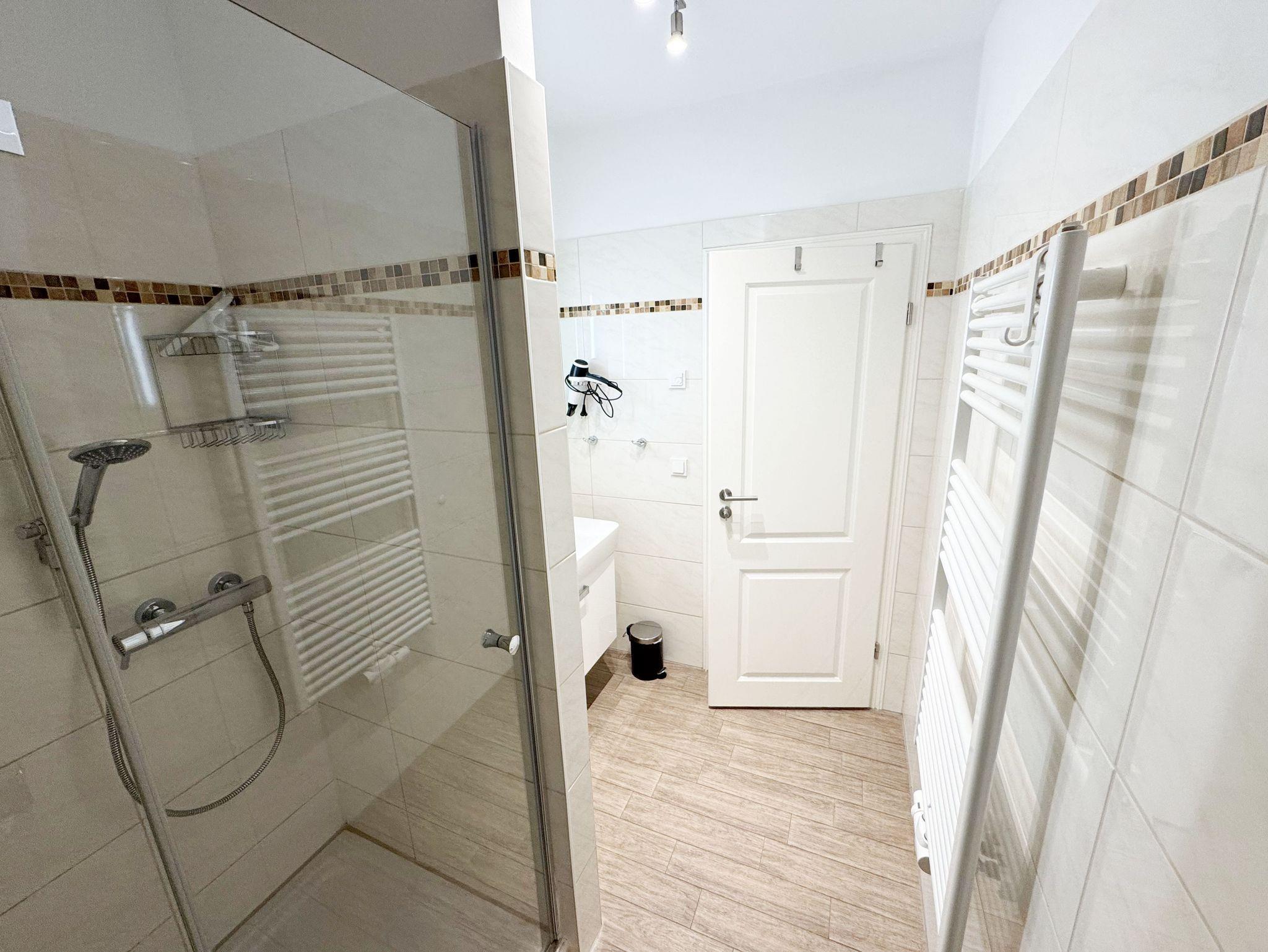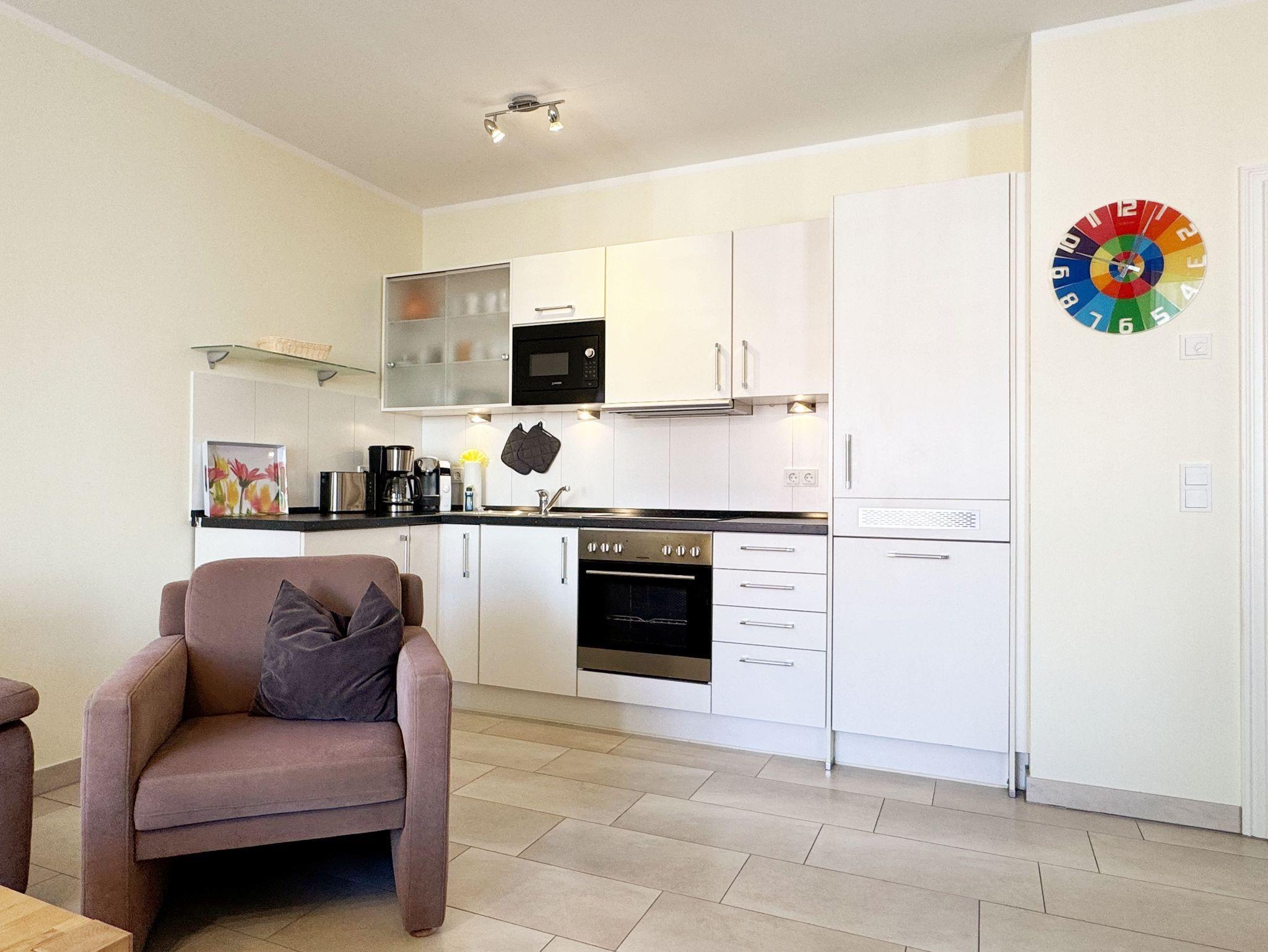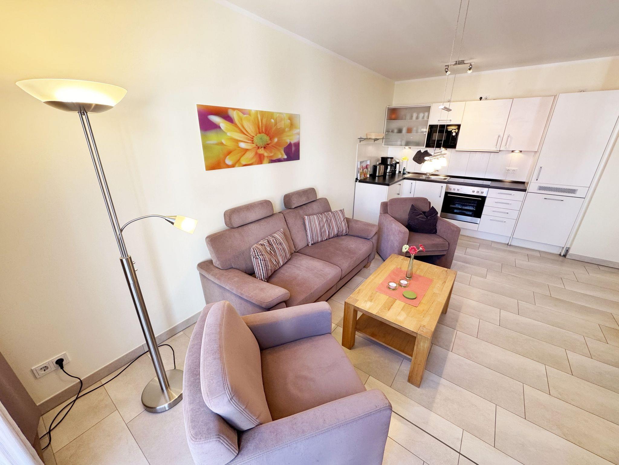 Die modern und gemütlich eingerichtete 3-Raumwohnung Nr. 09 (Nichtraucher) befindet sich im 1. Obergeschoss und umfasst eine Wohnfläche von ca. 72 qm und ist für max. 4 Erw. + 1 Kleinkind im Kinderreisebett ausgestattet. Der Wohnbereich ist mit einem großen Sofa und Sessel, Leselampe, Smart-TV, CD-Player, DVD-Player, Mini-Stereo-Anlage mit DAB-Radio, diverse Spiele für Kinder und einer Küchenzeile ausgestattet. Die Küchenzeile ist komplett eingerichtet und beinhaltet ein Cerankochfeld, Backofen, Geschirrspüler, Mikrowelle, Kühlschrank mit Gefrierfach, Toaster, Wasserkocher, Kaffeemaschine, Tassimo Maschine, Mixer, Eierkocher und diverse Küchenutensilien. Ein Essplatz mit einem Tisch und Stühlen ist vorhanden. Das Bad verfügt über eine Dusche, WC, Waschbecken, Kosmetikspiegel, Handtuchtrockner und einen Fön. Die beiden Schlafzimmer bestehen jeweils aus einem Doppelbett mit Nachttischkonsolen und einem Kleiderschrank. Das 1. Schlafzimmer verfügt über ein Doppelbett (2 x 0,90 m x 2,00 m), verstellbare Lattenroste, LCD-TV, 1 Sessel und das 2. Schlafzimmer bietet ebenfalls ein Doppelbett (2 x 1,00 m x 2,00 m), verstellbare Lattenroste sowie ein Bügelbrett mit Bügeleisen. In allen Räumen sorgt eine Fußbodenheizung für angenehme Wärme. Der zu der Wohnung gehörende Balkon mit Tisch und Stühlen zeigt Richtung Westen und lädt bei Sonnenschein zum Verweilen ein. Ein eigener PKW-Stellplatz (Nr.09) ist für Sie in der hauseigenen Tiefgarage (Einfahrtshöhe 1,90 m) vorhanden sowie eine Fahrradabstellmöglichkeit auf dem Areal und in der Tiefgarage. Auch im Urlaub brauchen Sie in der Wohnung nicht auf einen Internetanschluss (WLAN) verzichten. Dieser ist für Sie inklusive! 1x Kinderbett (ohne Matratze und Bett Inlett) und 1x Hochstuhl sind in der Ferienwohnung vorhanden. Haustiere sind in der Wohnung nicht erlaubt. Die Erstausstattung eines Wäschepaketes (komplette Bettwäsche, 1 Duschhandtuch, 1 kleines Handtuch) können Sie bis 14 Tage vor Anreise gegen einen Aufpreis dazu buchen oder durch eigene ergänzen. Ab 2 gebuchten Paketen erhalten Sie einmalig 1 Geschirrhandtuch und 1 Duschvorleger dazu.