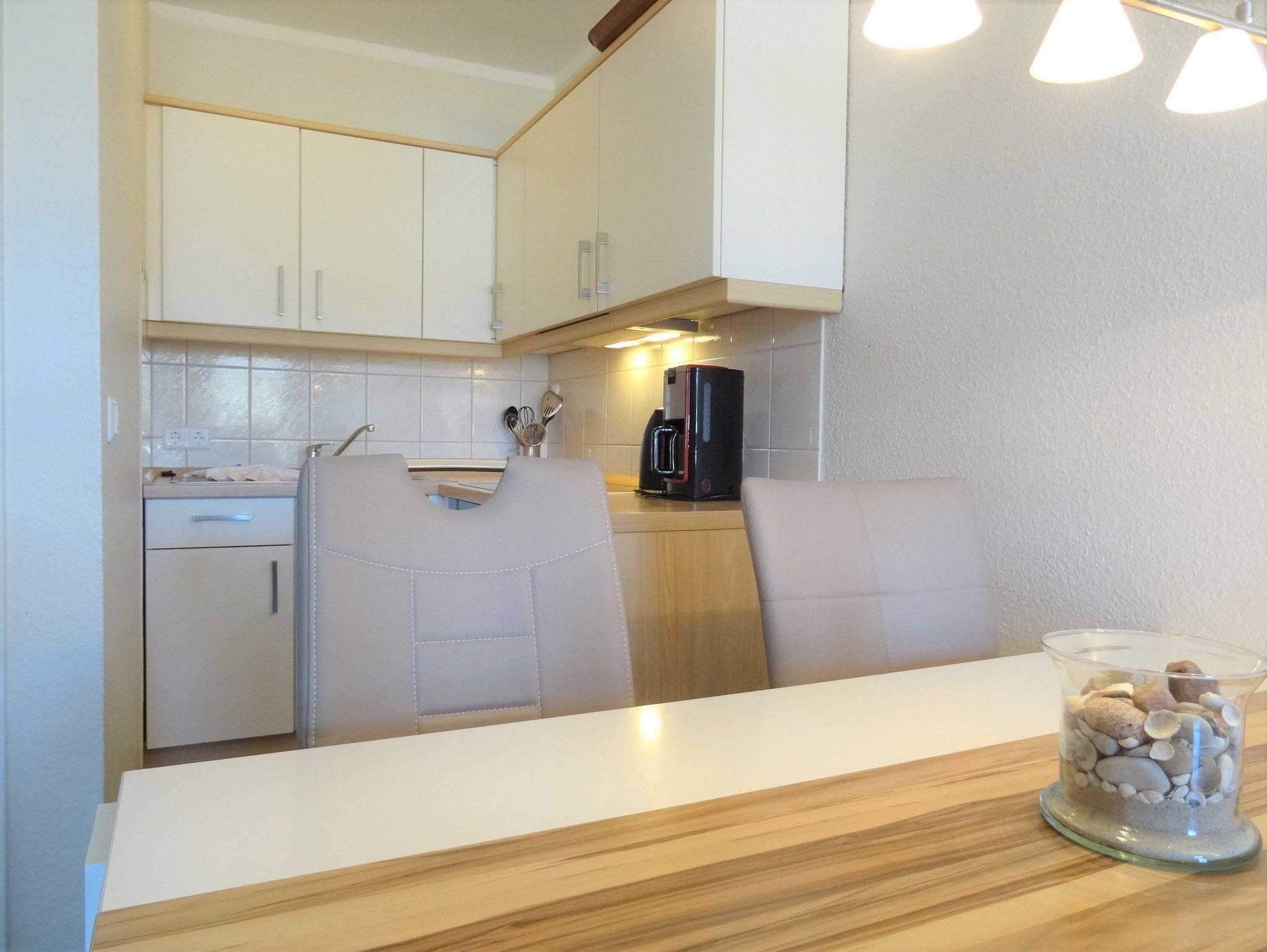 Auf dem Balkon in Nordostlage können die Gäste den Ausblick genießen und in der Sitzgruppe entspannen. Die Wohnung ist ein Nichtraucher-Apartment, jedoch ist die Mitnahme eines Haustieres erlaubt.