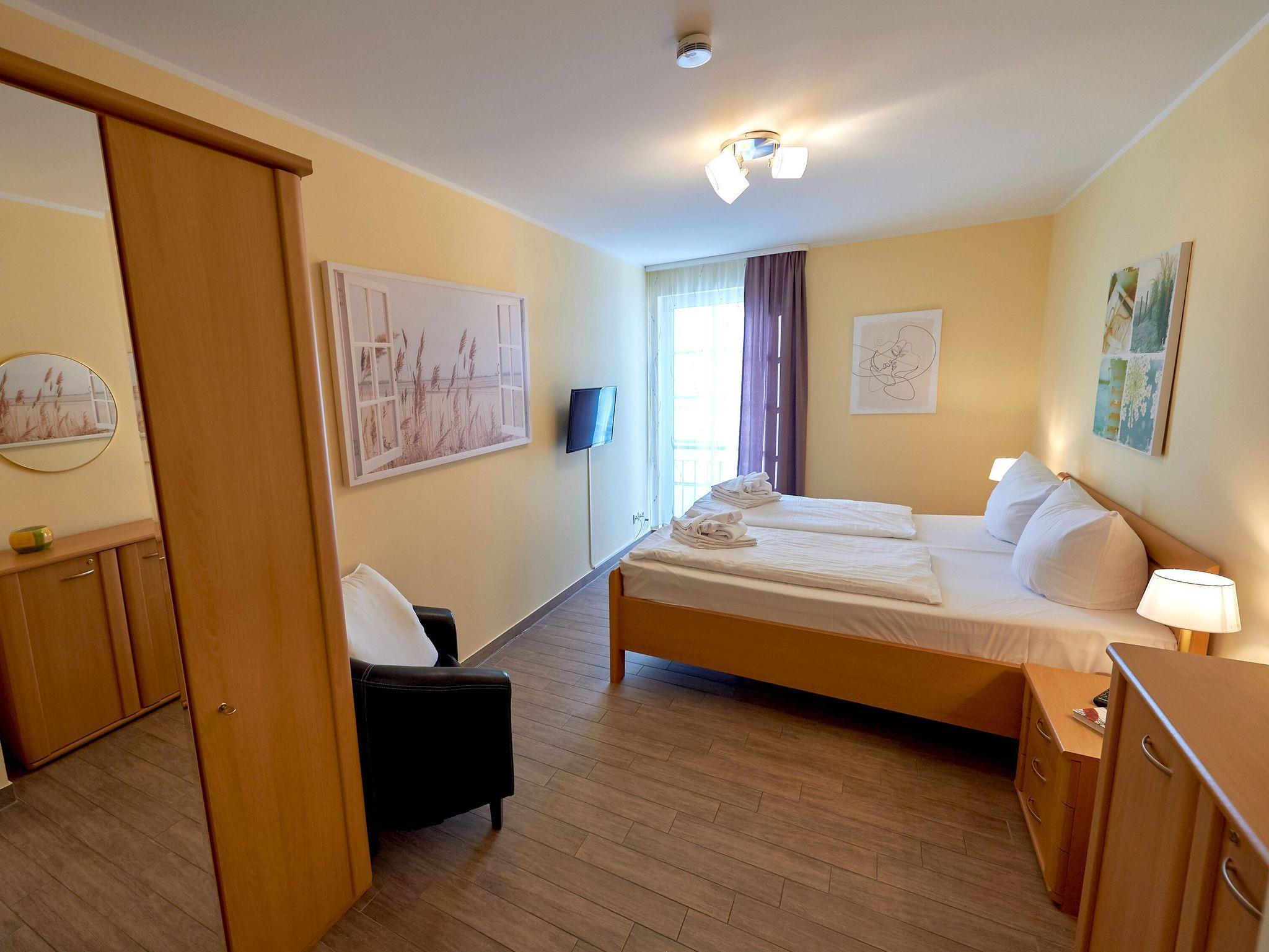 Im Schlafzimmer finden Sie ein komfortables Doppelbett (1,80 x 2,00 m) für einen erholsamen Schlaf sowie einen weiteren Fernseher und Radiowecker. Ein geräumiger Kleiderschrank bietet Ihnen ausreichend Platz für Ihre Urlaubsgarderobe.