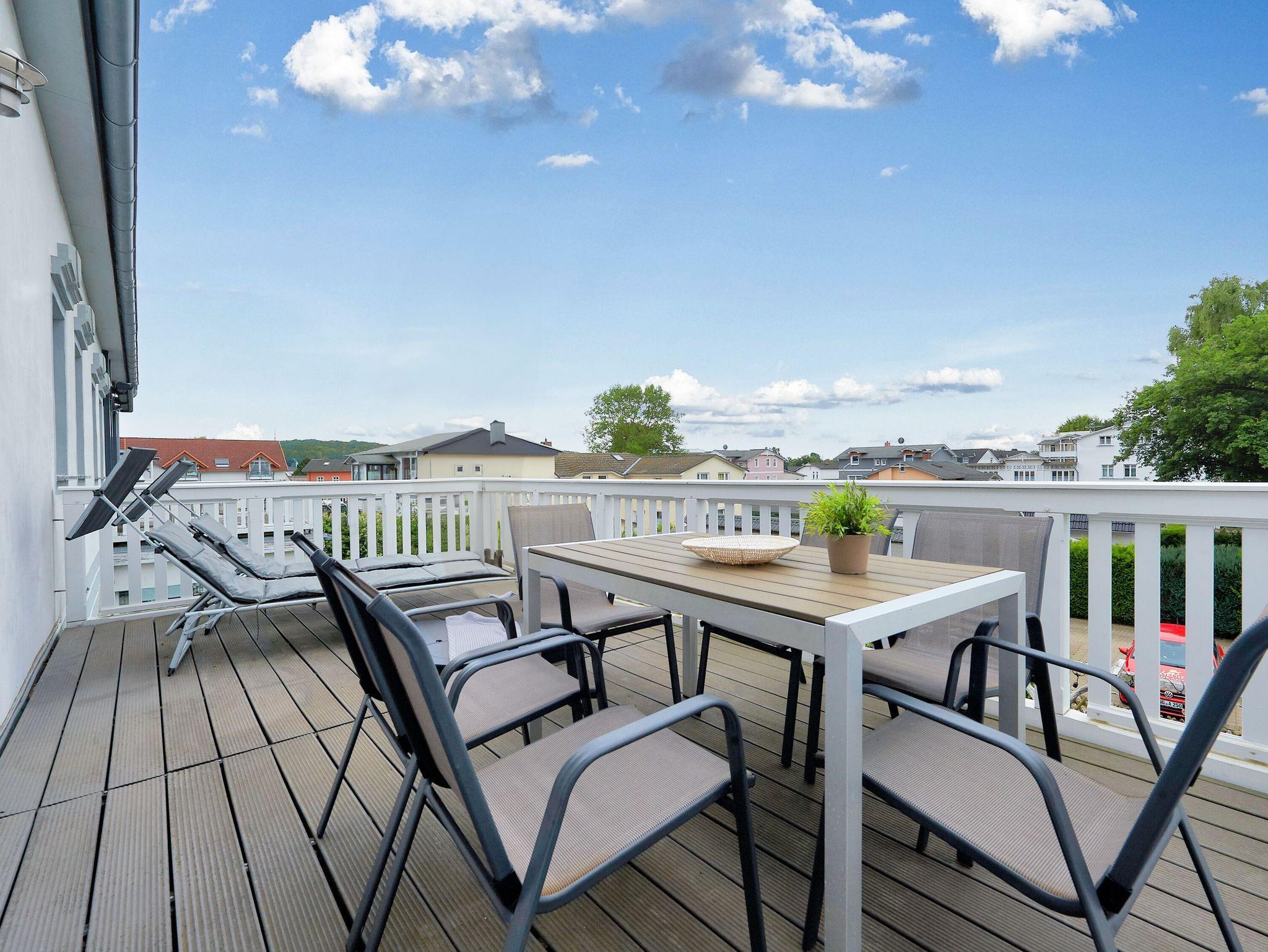 Speisen können Sie wahlweise am großen Esstisch im Wohnzimmer oder draußen auf dem Balkon in der frischen Ostseeluft. Ein riesiger Ampelschirm sorgt bei Bedarf für angenehmen Schatten. Zwei Relaxliegen stehen auf dem Balkon ebenfalls für Sie zur Verfügung.