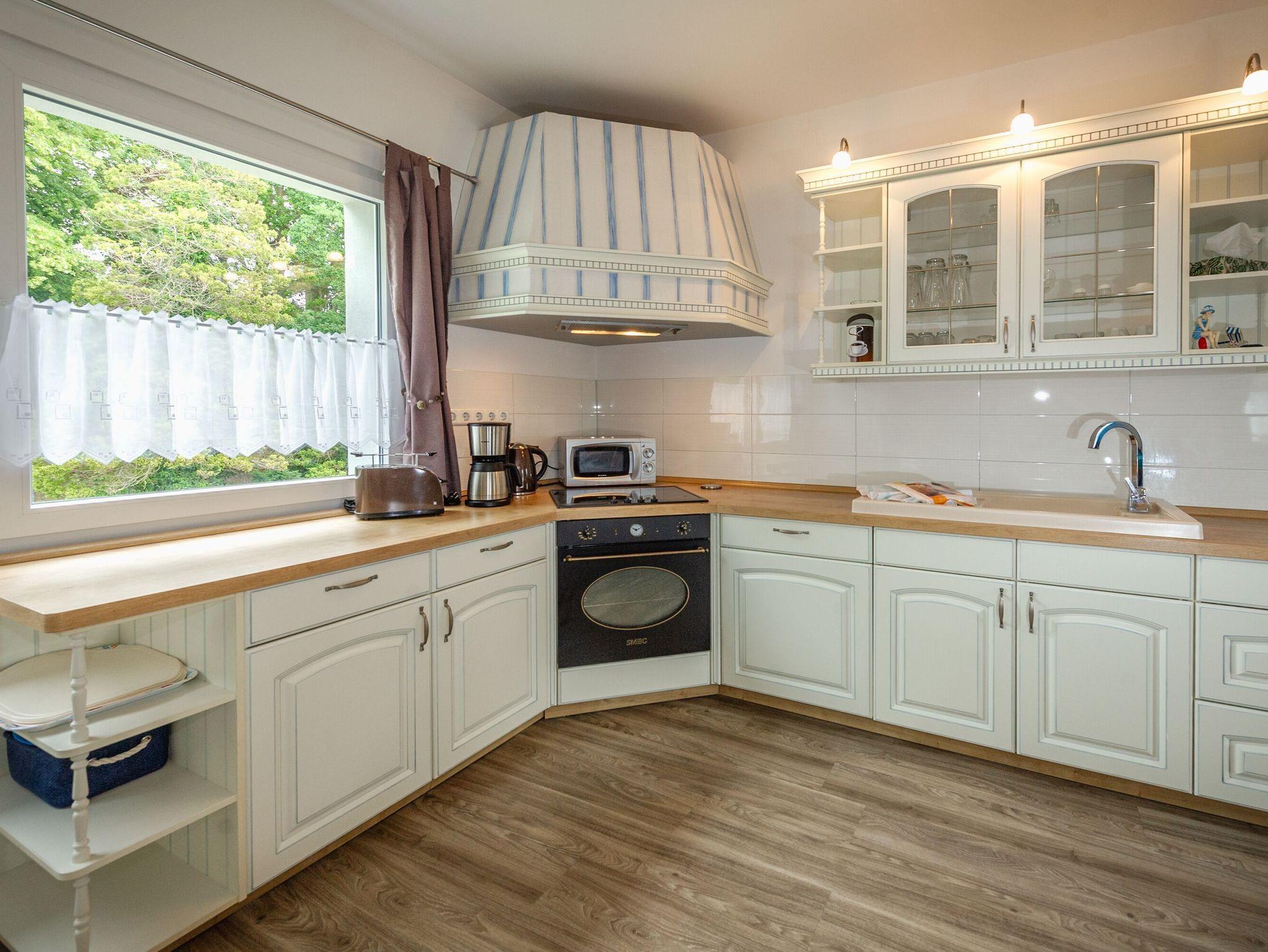 Die elegante Wohnküche bietet alles, was das Herz des Hobbykochs begehrt: einen 4-Zonen-Ceranherd nebst Backofen und Dunstabzugshaube, eine Mikrowelle, eine Filterkaffeemaschine, einen Wasserkocher, einen Toaster, dazu natürlich einen Geschirrspüler, einen großen Kühl-/Gefrierschrank und sämtliche benötigte Ausstattung an Töpfen und Pfannen, Geschirr, Gläser, Besteck und sonstigen Kleinteilen.