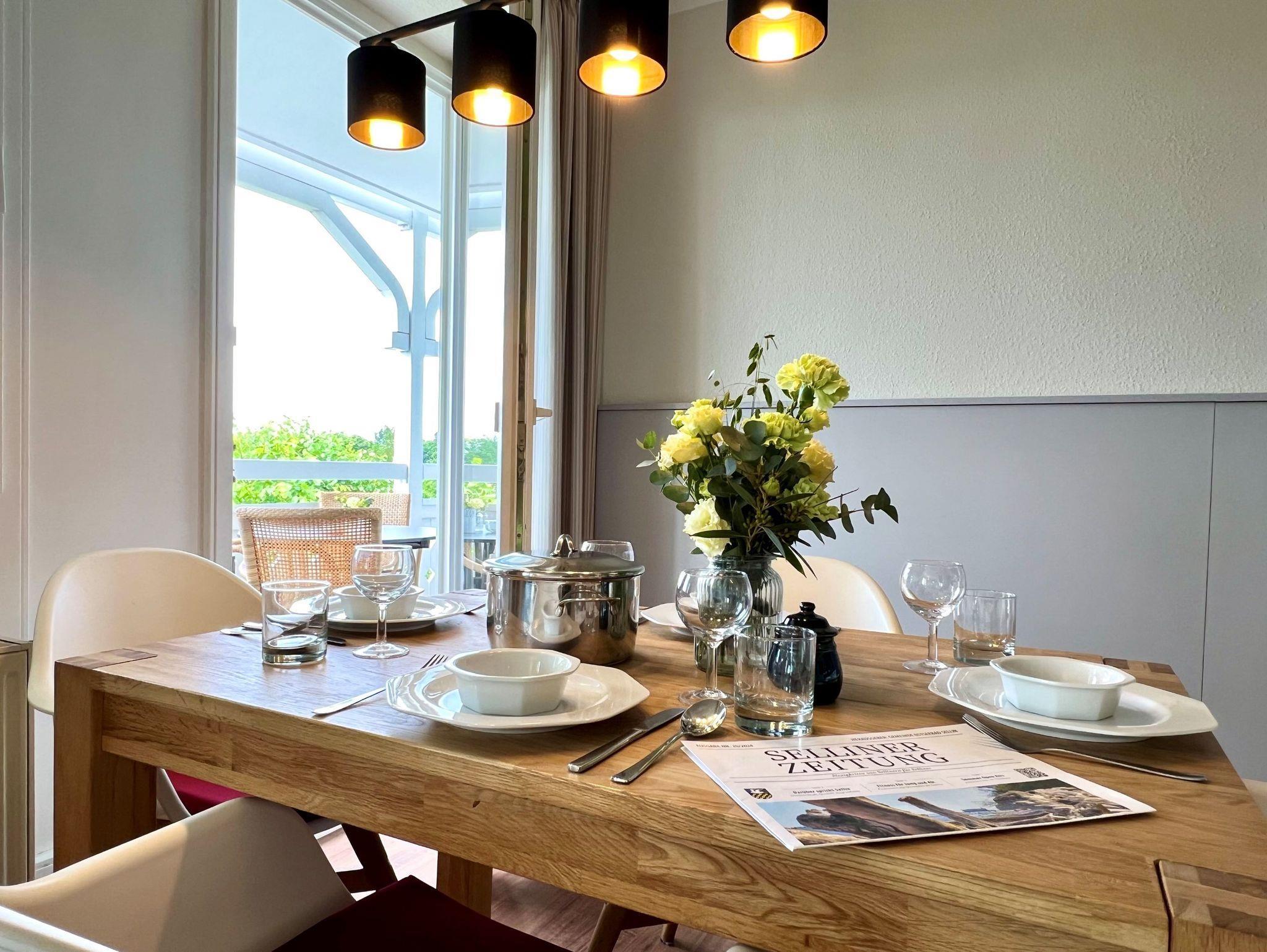 Ein Highlight der Fewo ist der großzügige Balkon, auf dem man gemütlich die Sonne genießen kann. Die offene Wohnküche bietet ausreichend Platz zum gemeinsamen Kochen und Essen.