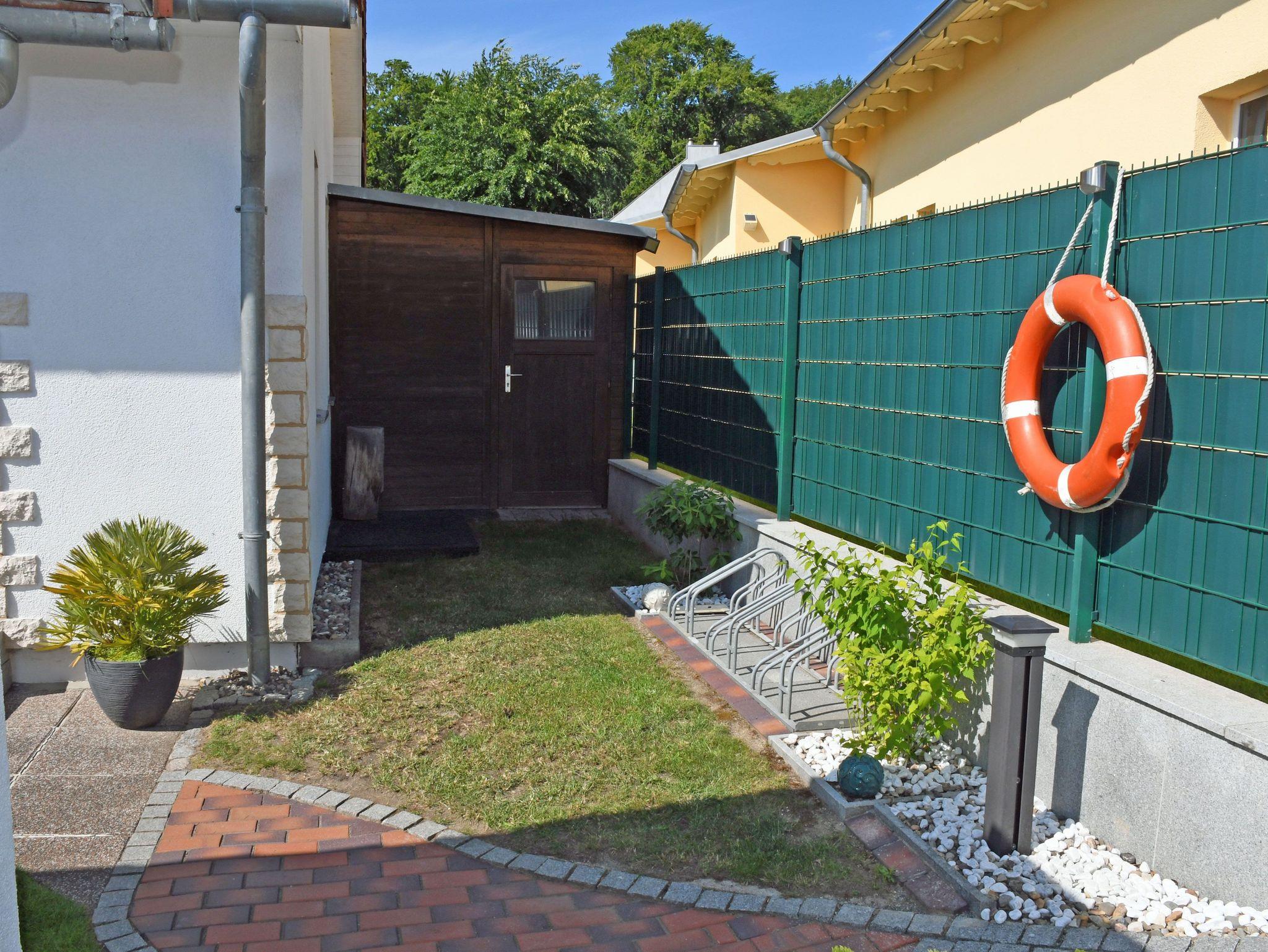 Jede Wohnung hat eine eigene kleine Terrasse mit Sitzmöbeln. Hier besteht auch die Möglichkeit zum grillen. Die Wohnungen sind bequem zu erreichen. Gäste die mit Auto anreisen, können dies wenige Minuten (800 m) von der Wohnung entfernt auf einem öffentlichen Parkplatz kostenpflichtig abstellen. Mitgebrachte oder geliehene Fahrräder können auf dem Grundstück abgestellt werden. Das Grundstück ist durch zwei Tore abschließbar.