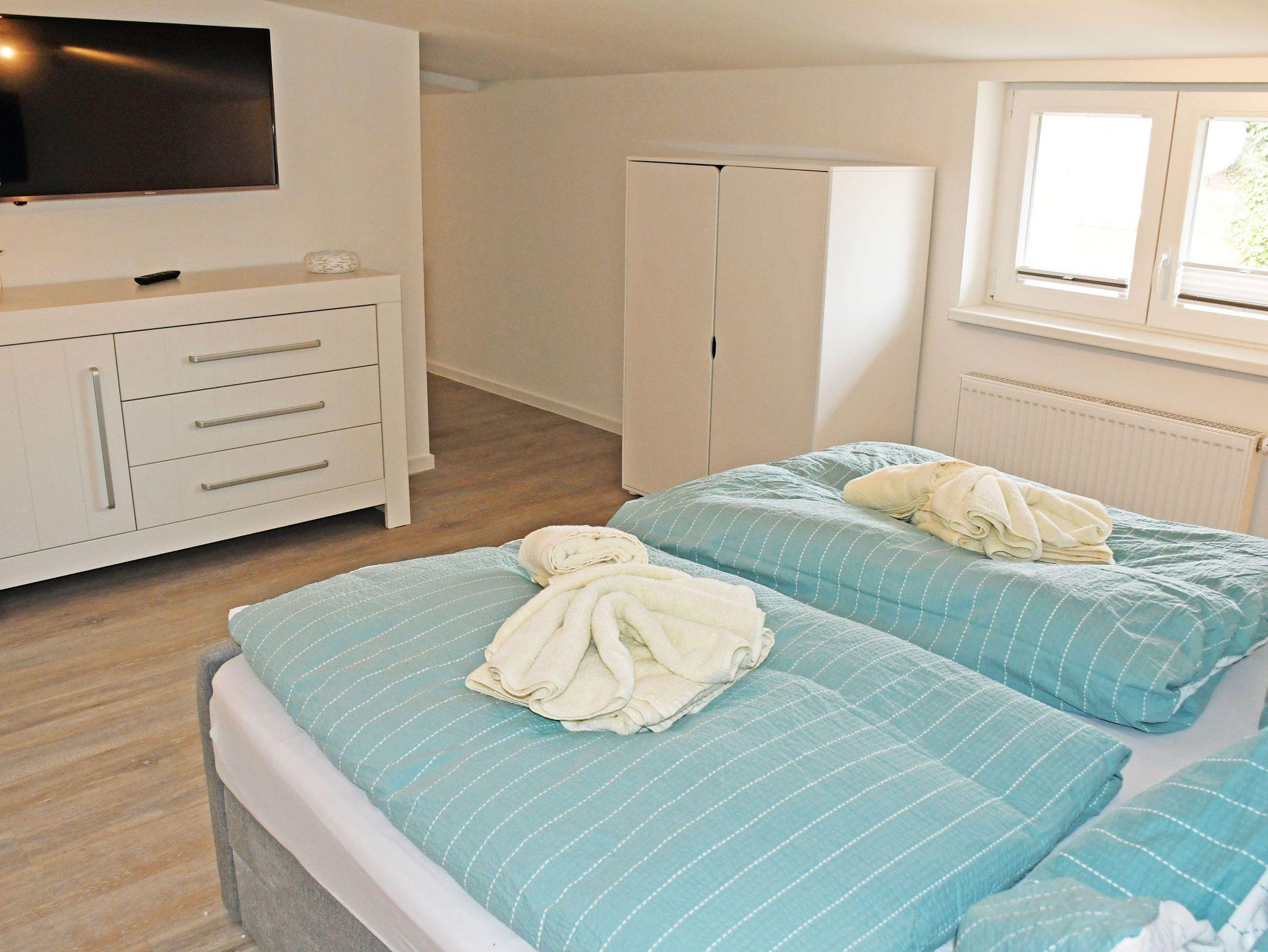 Im 1. und 2. Schlafzimmer (OG), die über eine Holztreppe erreicht werden, befinden sich jeweils ein bequemes Doppelbett mit Nachttischen und Leselampen sowie einem Kleiderschrank. Auf Wunsch kann hier ein Kinderreisebett und ein Hochstuhl bereit gestellt werden. Achtung, das Obergeschoss hat eine geringe Deckenhöhe!