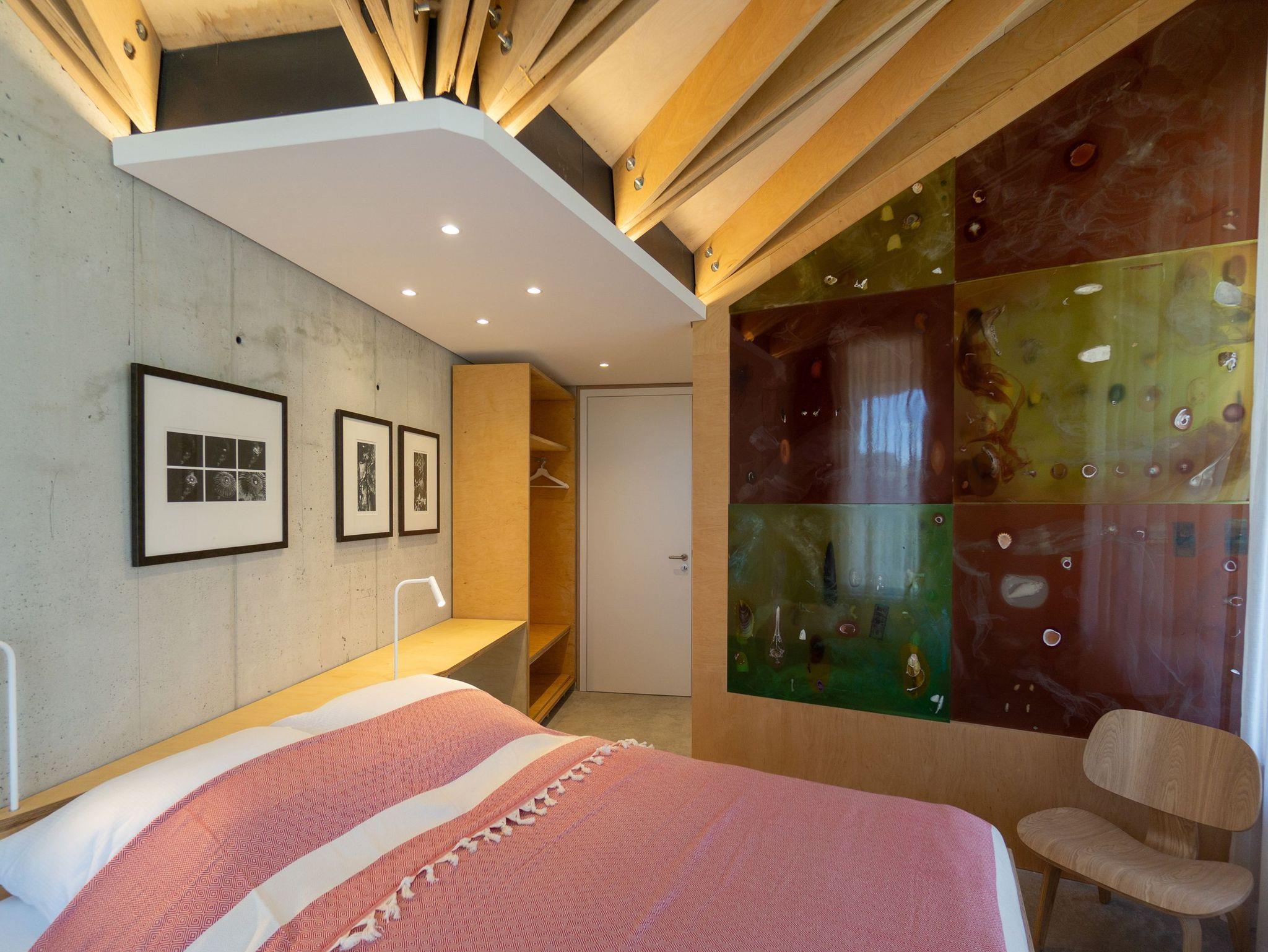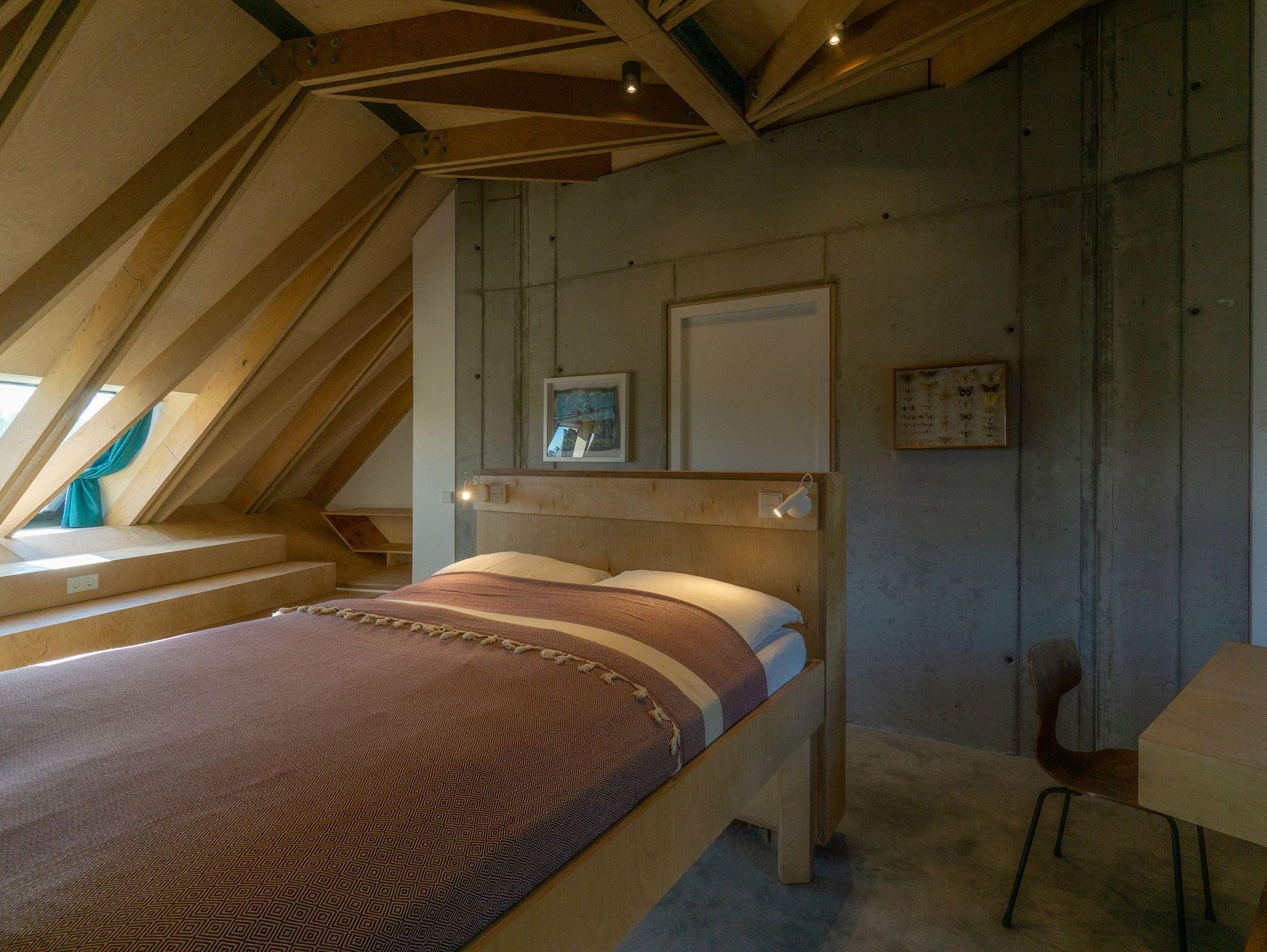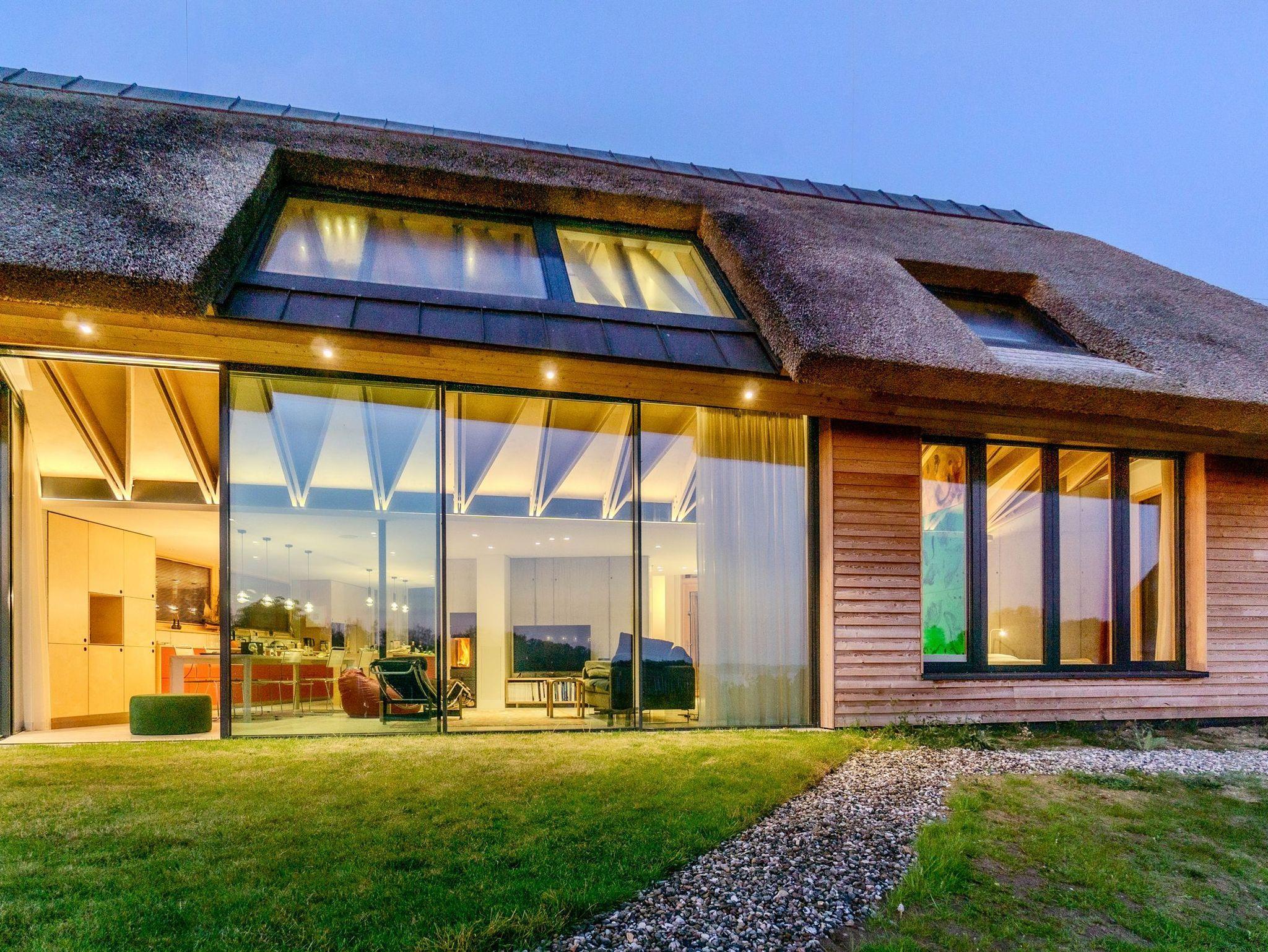 Die hölzerne Konstruktion, inspiriert von der Tradition, alte Boote durch Umdrehen in Behausungen zu verwandeln, integriert die Wohnräume direkt in die umgebende Landschaft. Der Boden des Erdgeschosses geht fließend in den Garten über, getrennt nur durch große, über Eck laufende Schiebetüren, die den Innenraum mit der Natur verschmelzen lassen. Das traditionelle Reetdach und die begrünten Flächen des Daches fügen sich nahtlos in die natürliche Umgebung ein, während die verwendeten Materialien wie Holz, Glas, Beton und Kupfer zeitlose Eleganz ausstrahlen.