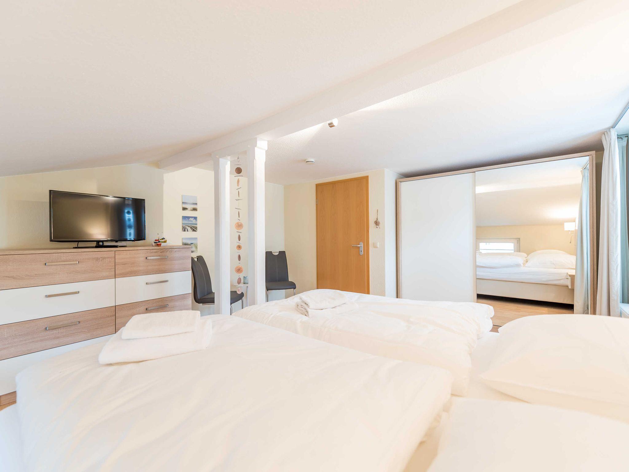 Das Appartement 7 in der 2. Etage, das Penthaus, bietet Ihnen auf ca. 75 qm ein wundervolles Feriendomizil. Es verfügt über 2 Schlafzimmer (jeweils mit einem Doppelbett 1,80 m x 2,00 m). Eines ist sogar mit einem Fernseher ausgestattet.