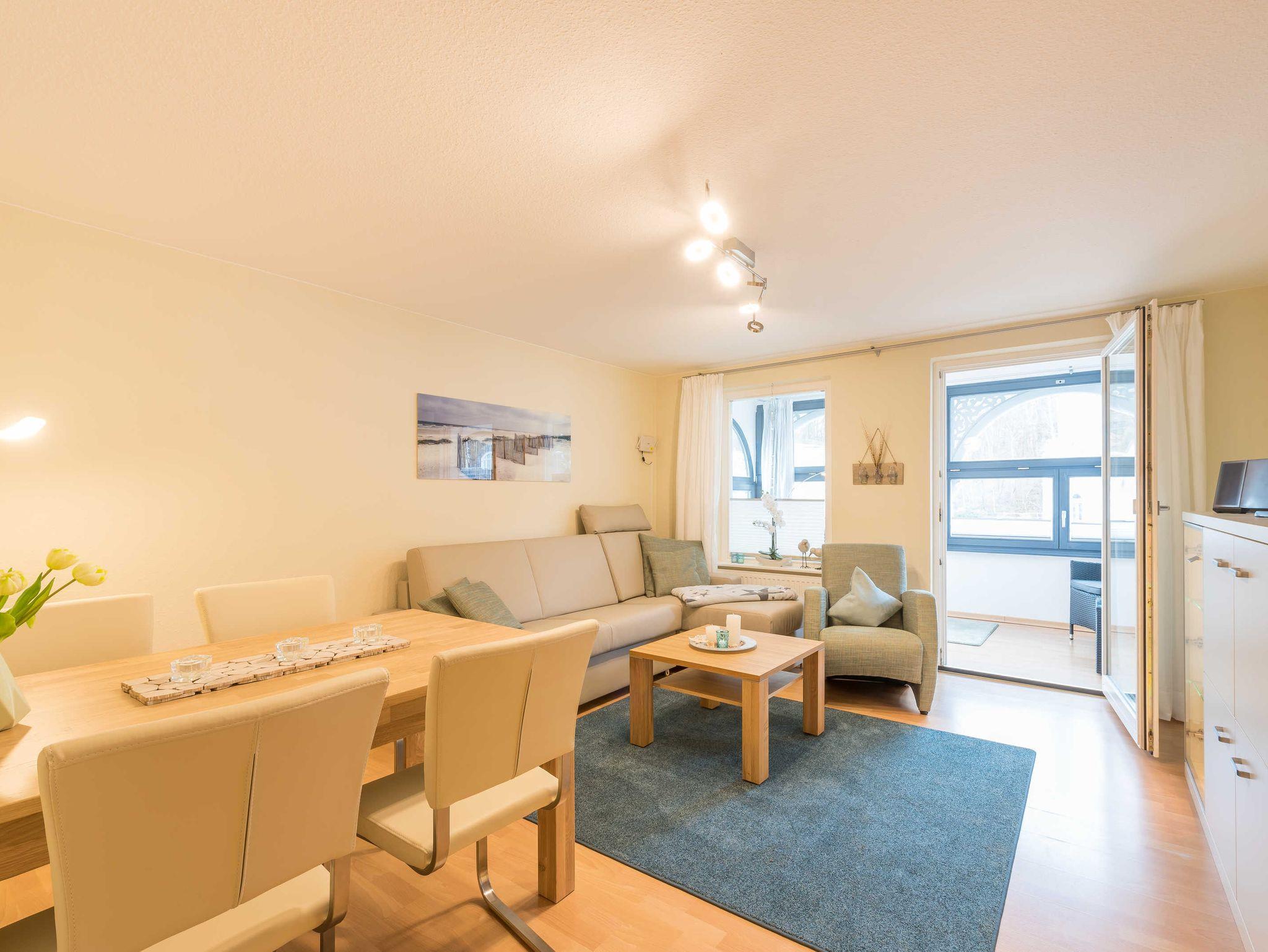 Im gemütlichen Wohnbereich gibt es einen internetfähigen Fernseher sowie einen CD-Player mit Radio. WLAN ist inklusive. Bei Anreise mit einer 5./6. Person, vorzugsweise Kinder, kann die Couch im Wohnbereich zu einem bequemen Bett umgewandelt werden (Liegefläche 1,40 m x 2,00 m). Ein heller Essplatz befindet sich ebenfalls hier und lädt zum gemeinsamen Speisen oder zum geselligen Zusammensein ein.