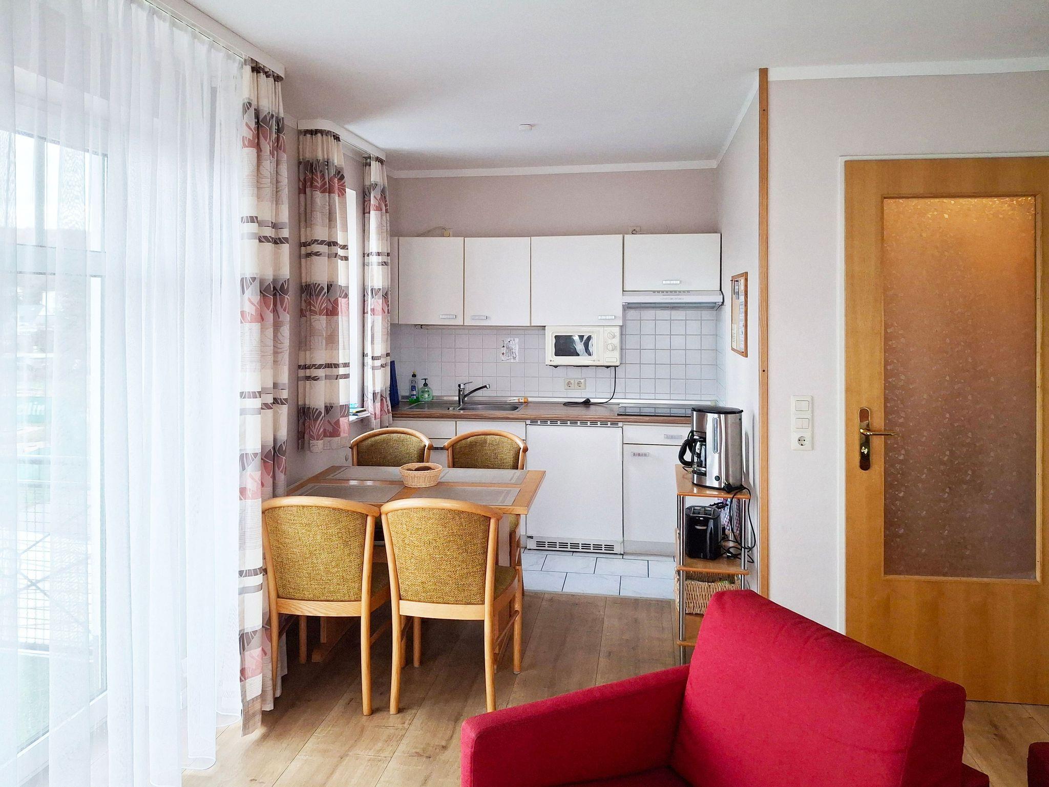 Angrenzend befindet sich der Küchen- und Essbereich mit Esstisch, 4 Stühlen und einer Küchenzeile.