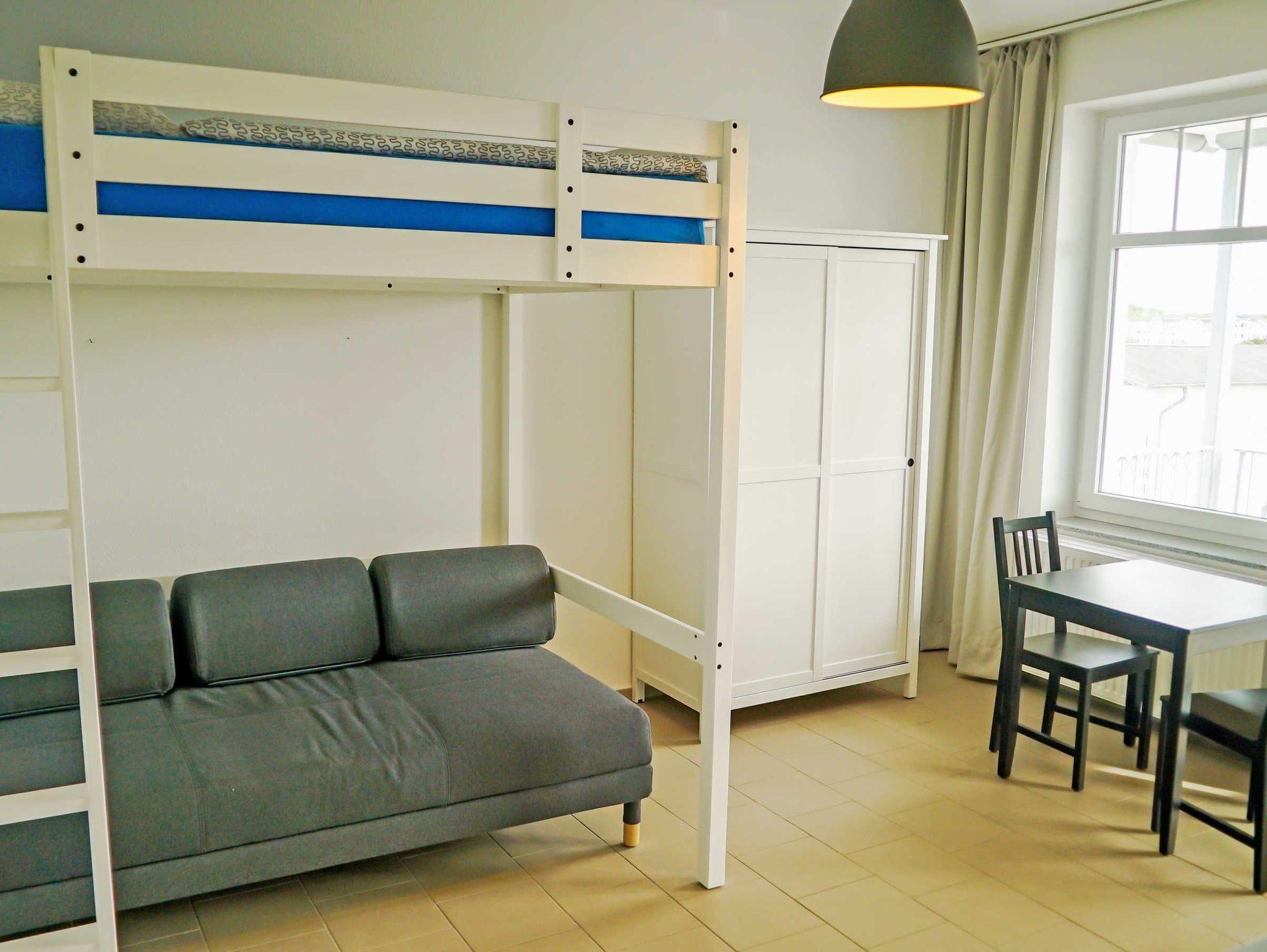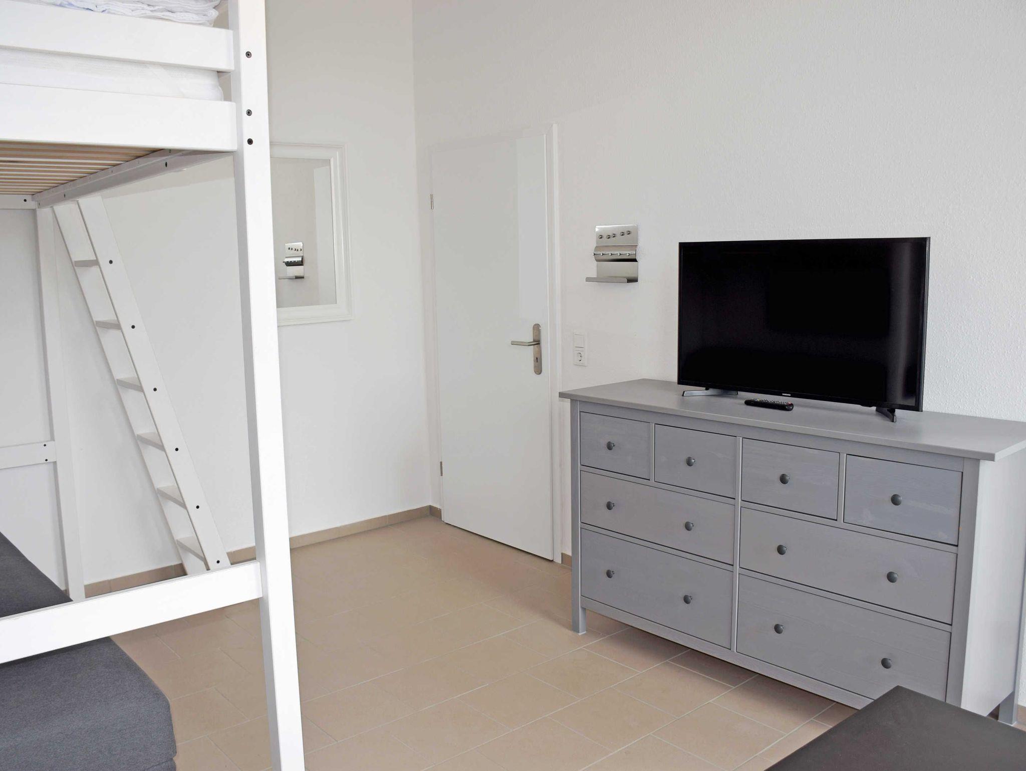 In dem kombinierten Schlaf-/ Wohnraum stehen ein Hochbett (1,40 x 2,00m), ein Schlafsofa , ein Kleiderschrank, ein Esstisch mit zwei Stühlen und eine Kommode mit Flachbild-TV. Es können also hier max. 2 Erwachsen und ein Kind bis 16 Jahre wohnen und schlafen. Achtung das Hochbett ist nur 1,40 breit!