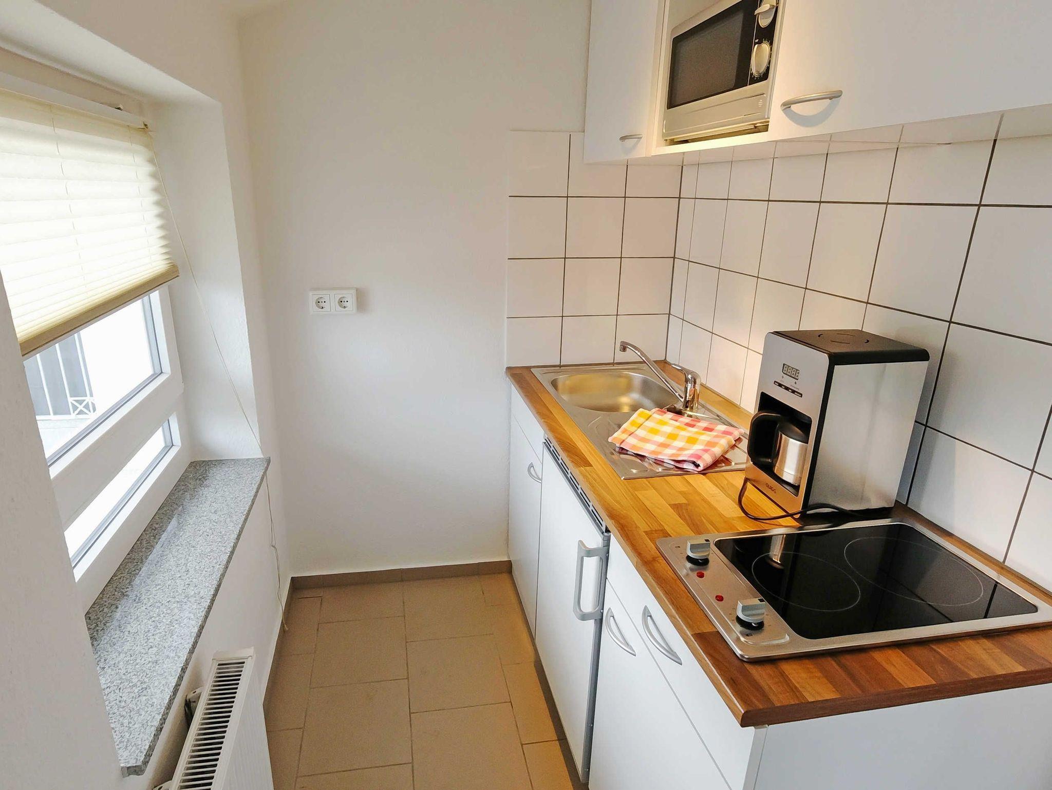 Die Küchennische verfügt über ein 2-Platten-Ceranfeld, Kühlschrank mit Gefrierfach, Mikrowelle, Kaffeemaschine, Toaster, Wasserkocher sowie ausreichend Geschirr und Kochutensilien.