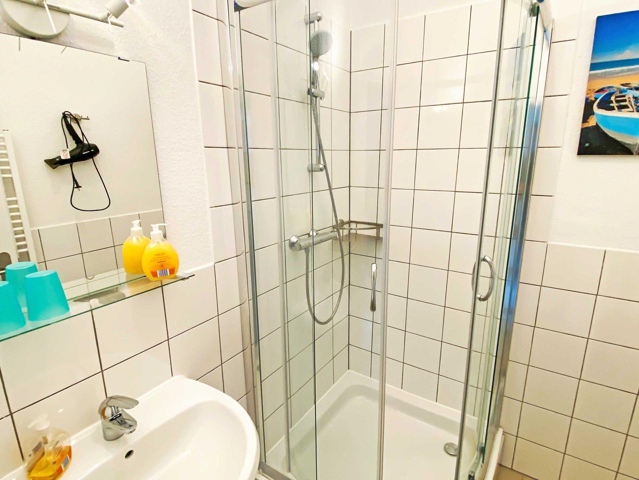 Das moderne Bad ist mit Dusche, WC, Waschbecken, Spiegel und Föhn ausgestattet.