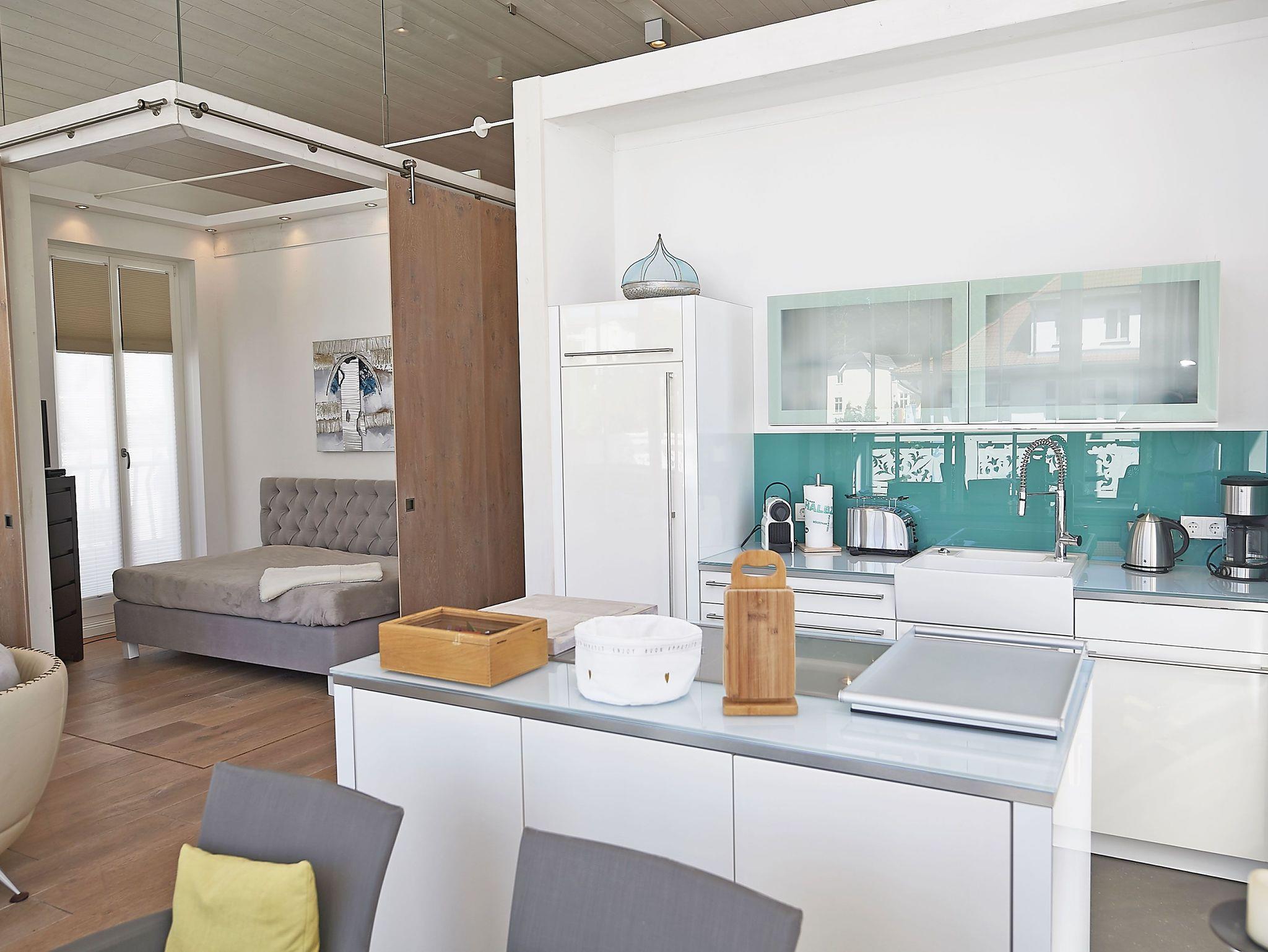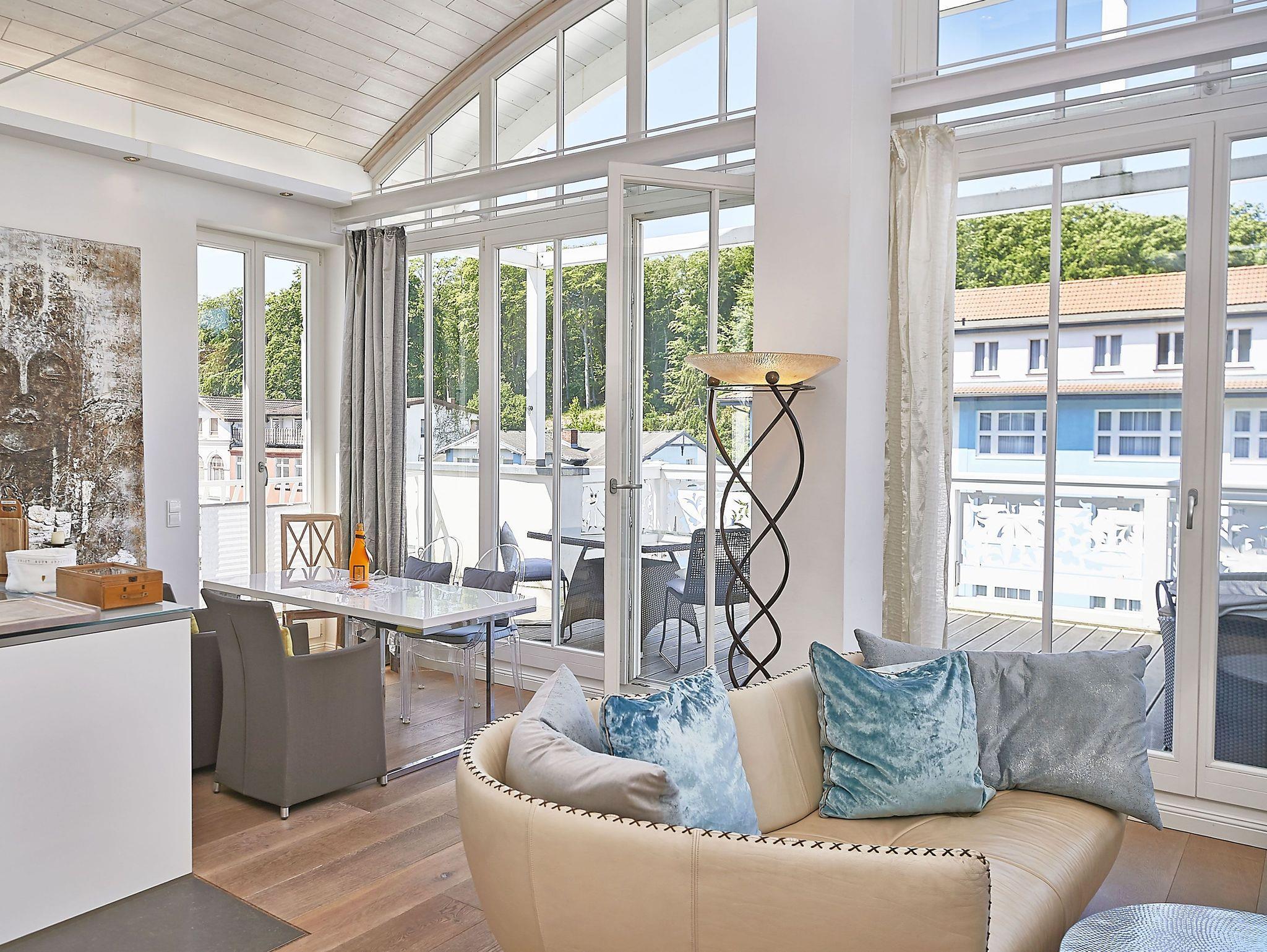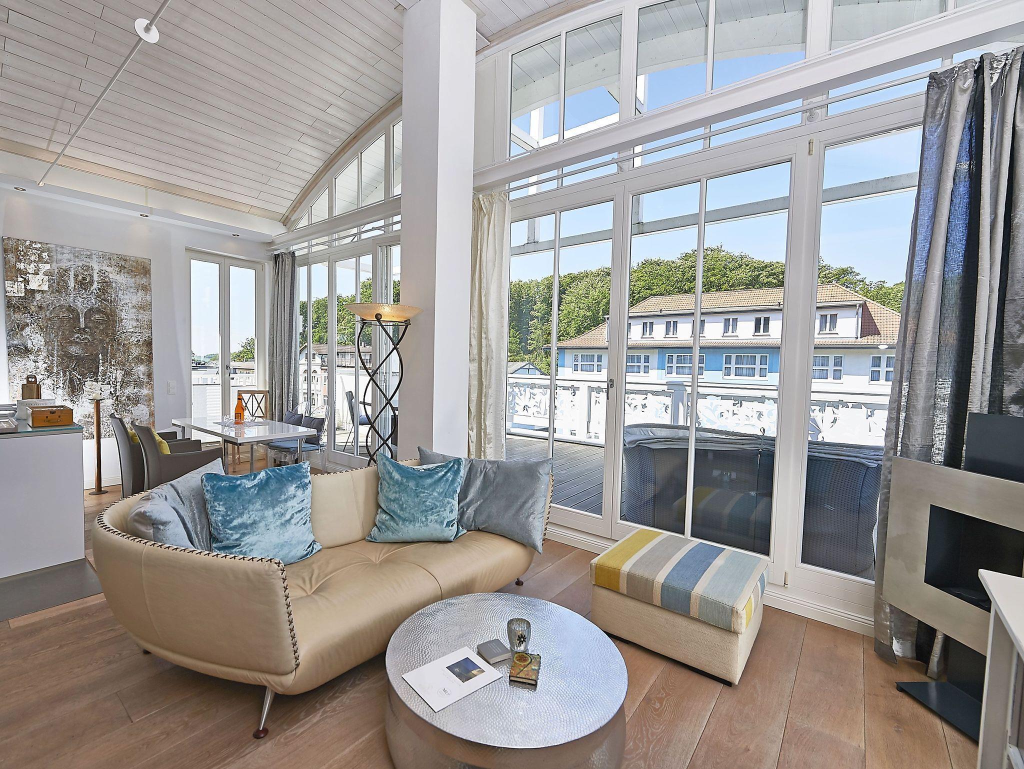 Dieses Luxuspenthouse unter Tonnengewölbe bietet Ihnen ein privates Saunaerlebnis, einen majestätischem Blick zum Meer, zum mystischen Friedensberg und zum Selliner See.