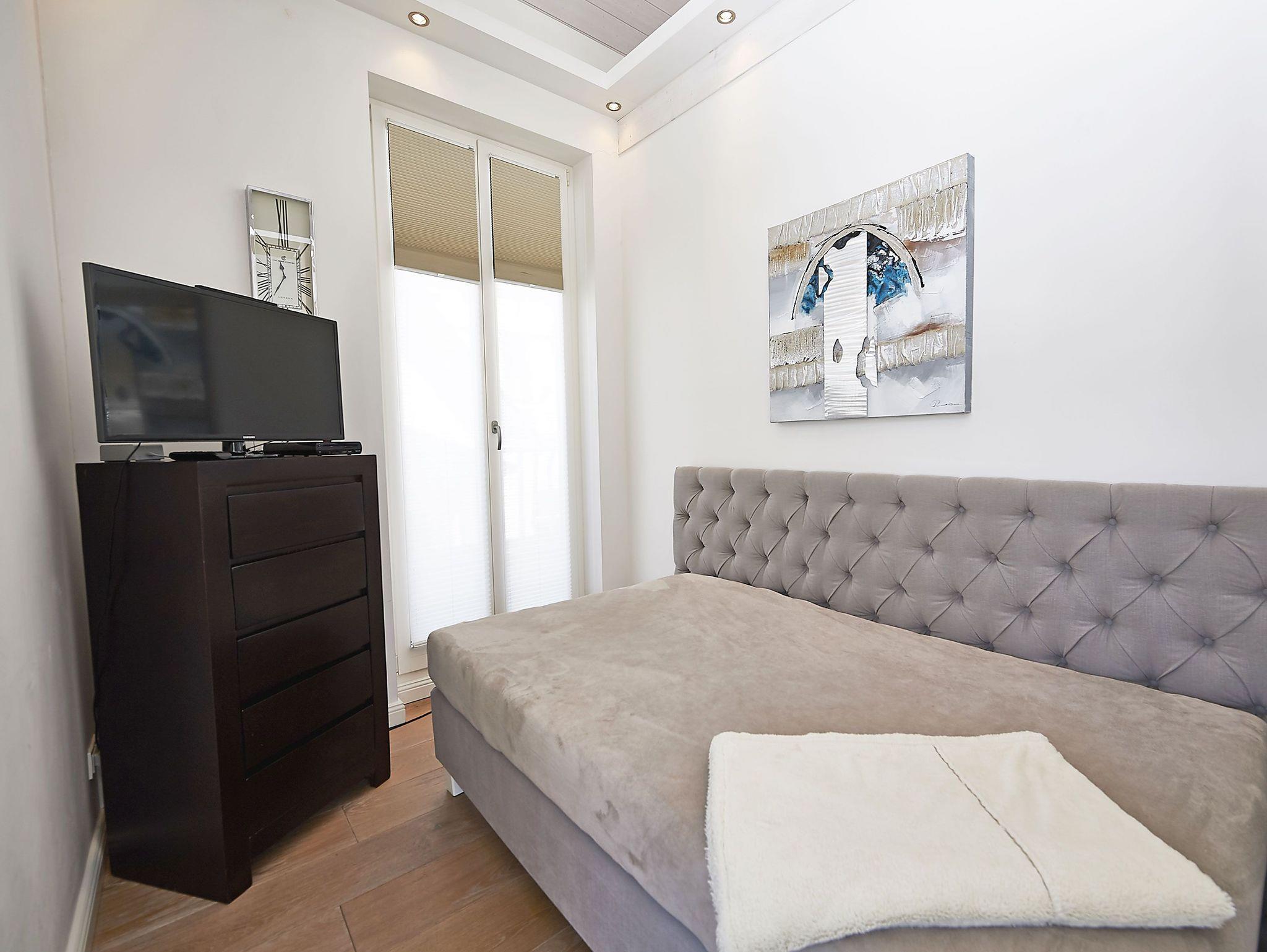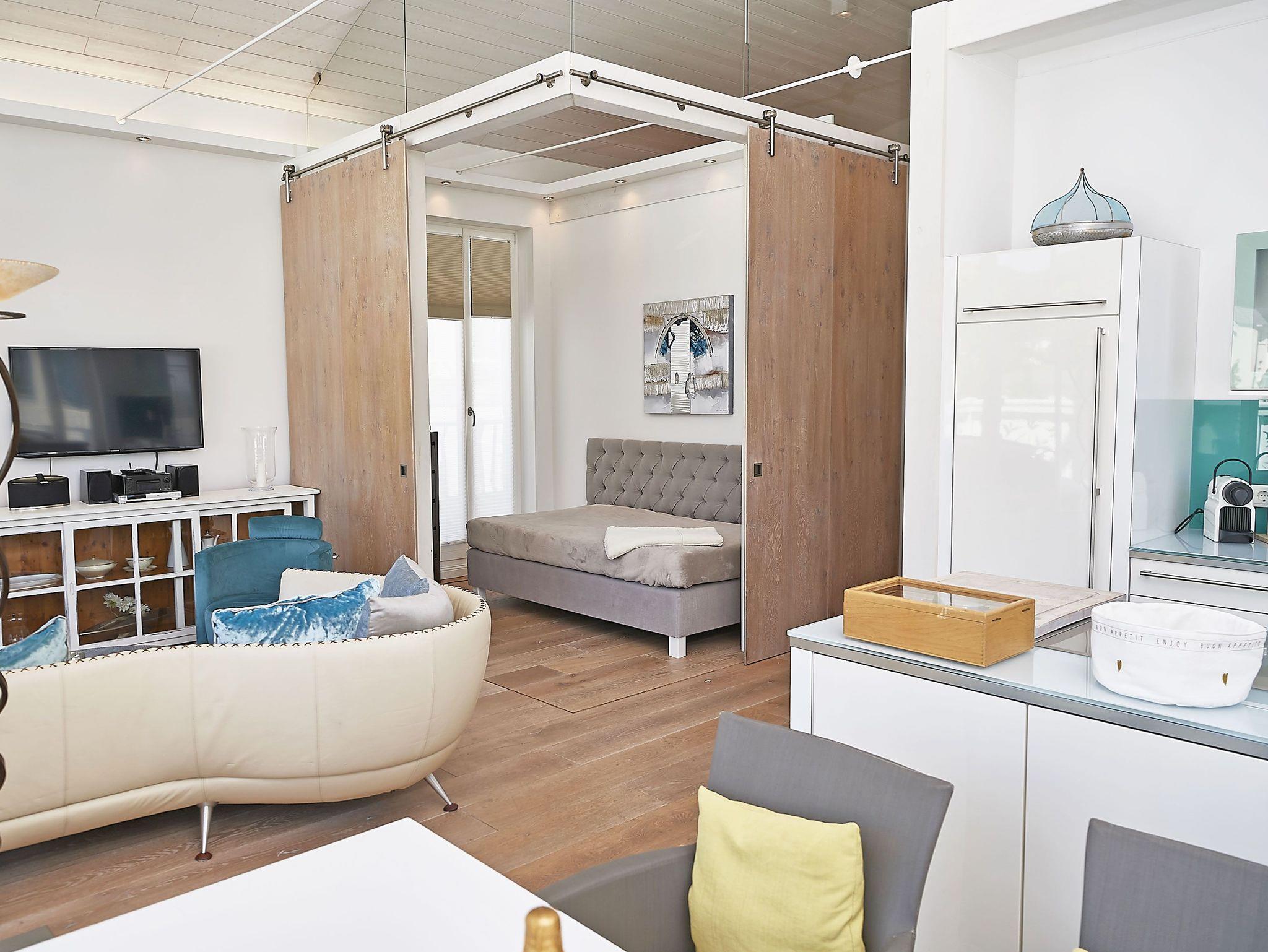 Abteilbar durch große Vollholz-Schiebetüren vom Wohnraum ergibt sich der zweite Schlafraum, ausgestattet mit einem Bett, einem Flachbild-TV und einer Wii-U-Spielkonsole mit 2 Controlern und 8 Spielen. Viele Lichtquellen der Wohnung sind dimmbar, so das auch romantischen Abenden nichts im Wege steht.