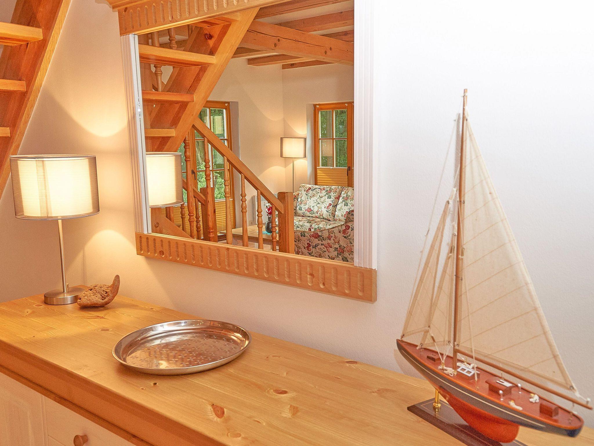 Ganz vorn im Strandschlösschen gelegen, begrüßt Sie die Haushälfte 1 mit rund 100 m² Wohnfläche über zwei Etagen. Wie die anderen drei Haushälften auch, verfügt sie im Erdgeschoss über ein großes und funktional eingerichtetes Wohnzimmer, das durch die offenen Balken besonders gemütlich wirkt. Die Terrasse zur Westseite ist mit Sonnenliegen und Sitzgruppe ausgestattet.