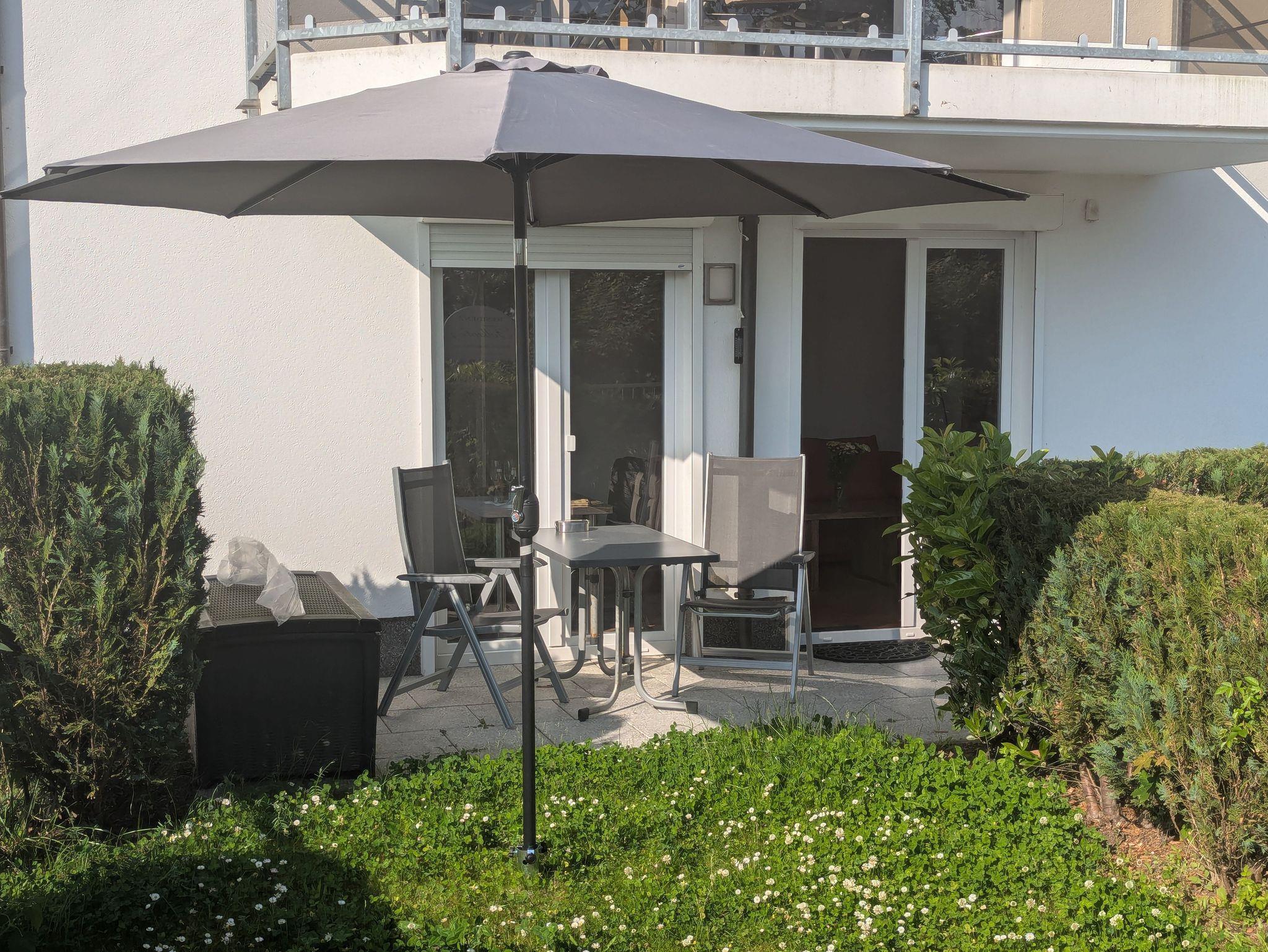 2 bestuhlte Terrasse mit Sonnenschirm (Rauchen ist im Garten und auf der Terrasse gestattet)