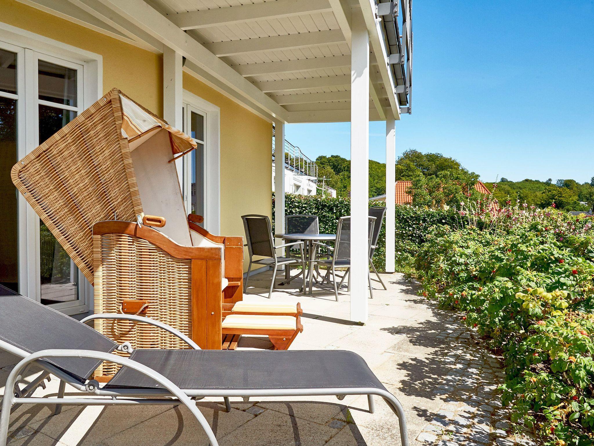 Die teilweise überdachte Süd-Terrasse (ca. 37 m²) verfügt über einen Strandkorb, Liege und Sitzgruppe.