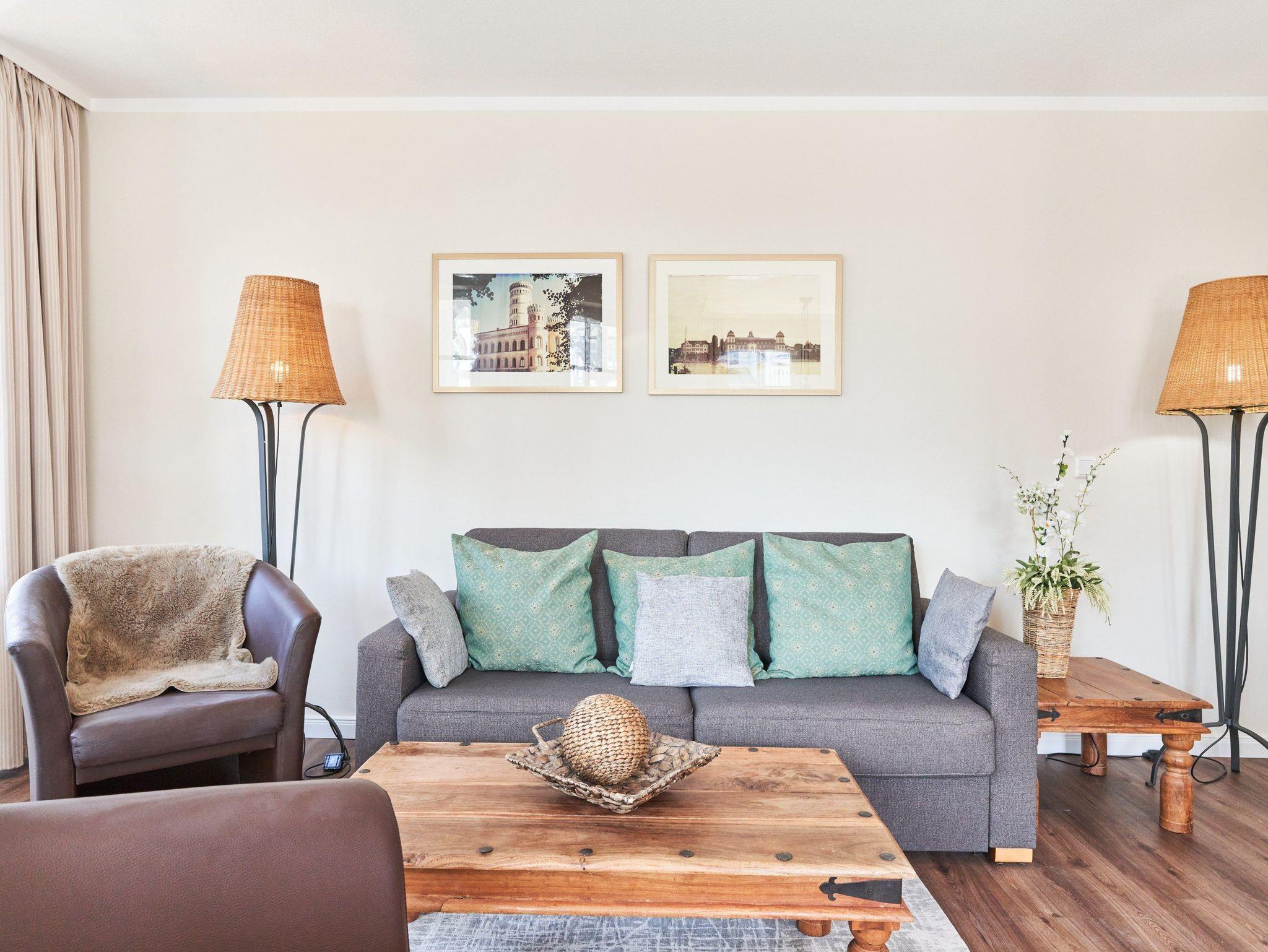 Die Ferienwohnung verfügt über kostenfreies WLAN und die Erstausstattung an Bettwäsche ist inklusive. Das Schlafzimmer mit Verdunklung verfügt über ein Doppelbett, im Wohnzimmer befindet sich zusätzlich eine Doppelschlafcouch. Darüber hinaus verfügt die Ferienwohnung über ein Bad mit Badewanne/WC und Föhn. Die voll ausgestattete, offene Küche mit Backofen, Mikrowelle, Kaffeemaschine und Toaster lässt keine Wünsche offen. Ein Fernseher inkl. 3 Sky-Sender rundet die Einrichtung ab.
