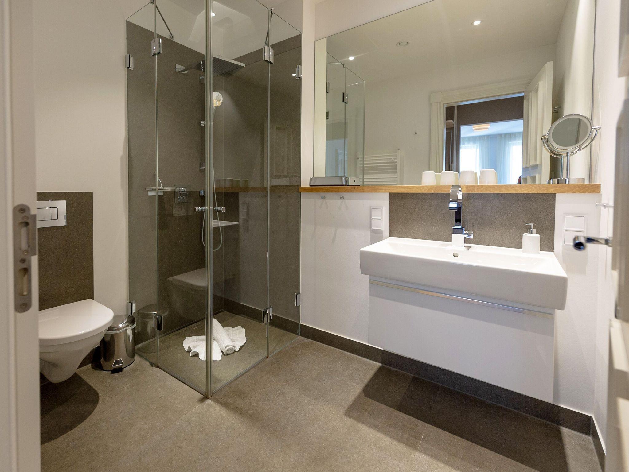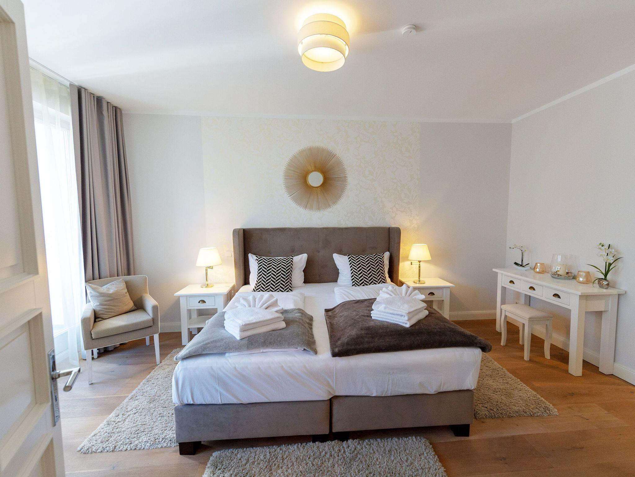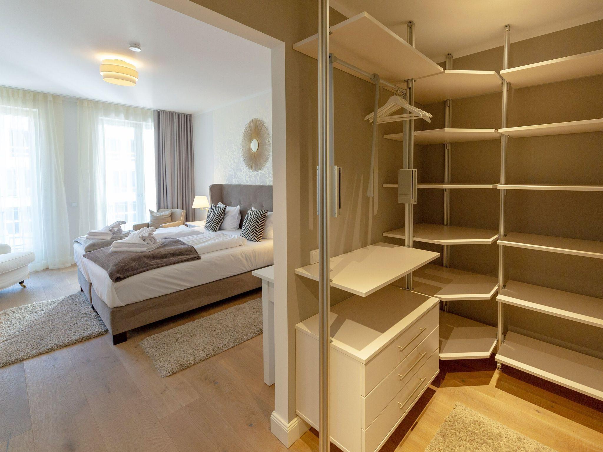 Im rund 22 qm großen Schlafzimmer verspricht ein 2,00 x 2,00 m großes Premium-Boxspringbett süße Träume. Dazu gibt es ein zweites Fernsehgerät. Das angrenzende Ankleidezimmer bietet jede Menge Platz und Stauraum für Ihre gesamte Urlaubsgarderobe. Von hier aus erreichen Sie das Badezimmer mit Dusche/WC, einem beleuchtetem Waschtisch sowie Handtuchheizkörper, Kosmetikspiegel und Fön. Darüber hinaus gibt es in der Wohnung auch noch ein Gäste-WC.