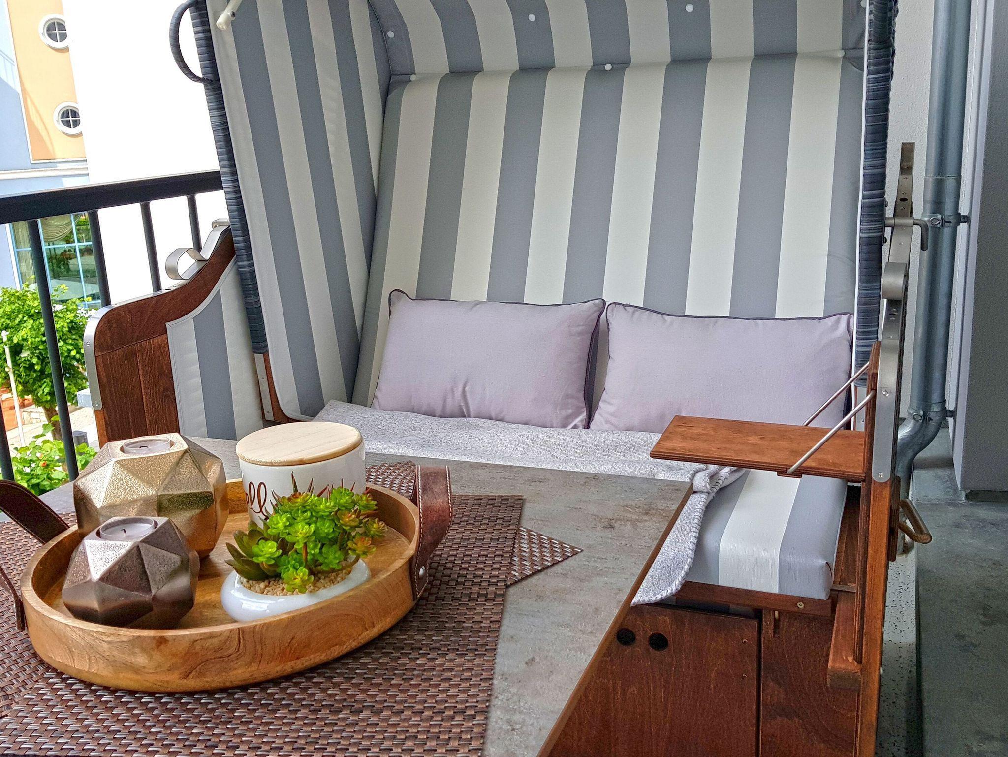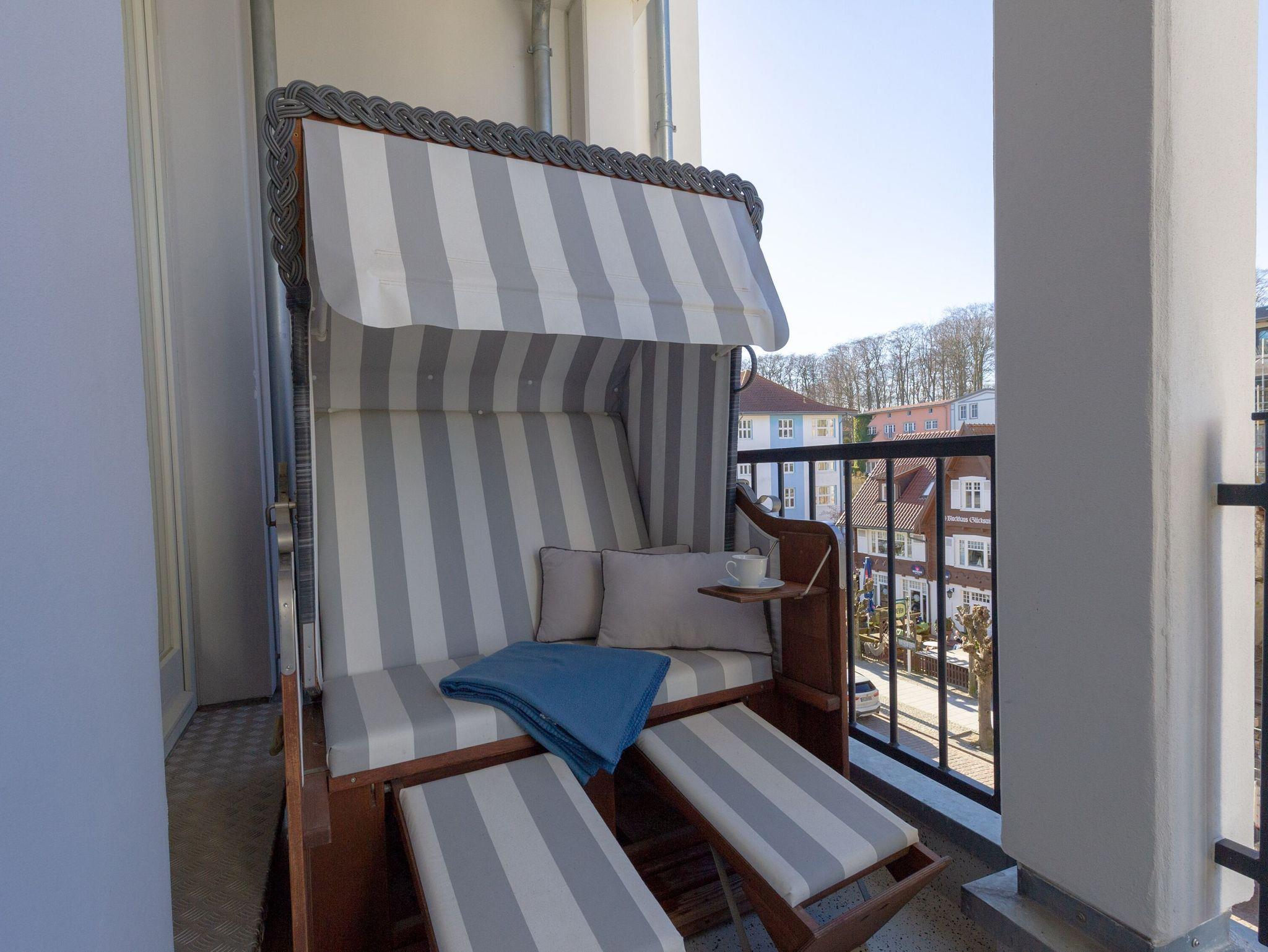 Die nach Westen ausgerichtete und gut 14 qm große möblierte Loggia erreichen Sie vom Wohnzimmer aus oder morgens direkt nach dem Aufstehen aus Ihrem Schlafzimmer. Bis in die Abendstunden werden Sie hier von der Sonne verwöhnt. Genießen Sie dabei den herrlichen seitlichen Blick auf das weite Meer bis hinüber zu den Kreidefelsen und die Aussicht auf das bunte Treiben in der prächtigen Wilhelmstraße.