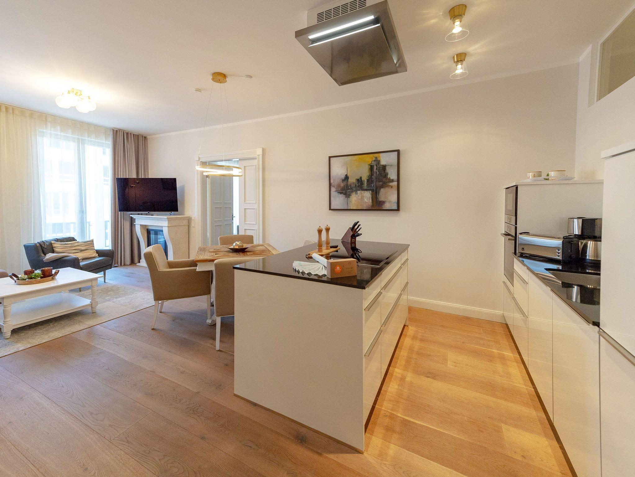 Der mit 43 qm überaus großzügige Wohn- und Essbereich ist mit einer hochwertigen, offenen Küche mit Kochinsel ausgestattet. Die schöne Essecke bietet ausreichend Platz für vier Personen. Das große Wohlfühlsofa lässt sich mit ein paar Handgriffen in ein vollwertiges 1,60 m breites Bett verwandeln. Lassen Sie sich verwöhnen von dem elektrischen Kamin mit Heizfunktion und erleben Sie unterhaltsame Abende auf dem 55 Zoll großen LOEWE-TV mit Internet-Funktion. W-LAN steht Ihnen natürlich kostenfrei zur Verfügung.